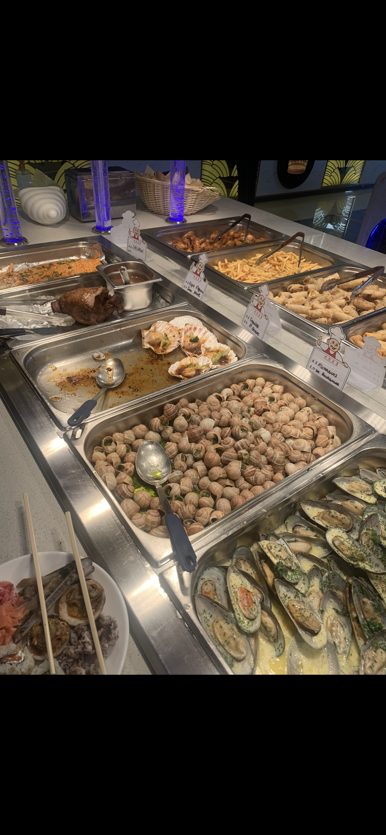 En gros c'est bon beaucoup de choix c'est vrai mais quand on veut manger au calme à éviter un samedi soir je sais pas si en semaine c'est pareil mais la avec mon mari on s entendait même pas parlé noir de monde et c'est la queu dehors pour attendre une place je sais pas si j'y retournerai juste à cause du trop de monde même au buffet tous le monde se bouscule faut regarder où on marche avec son assiette pour pas foncer d'à.s quelqu'un. C'est pas pour moi 😊