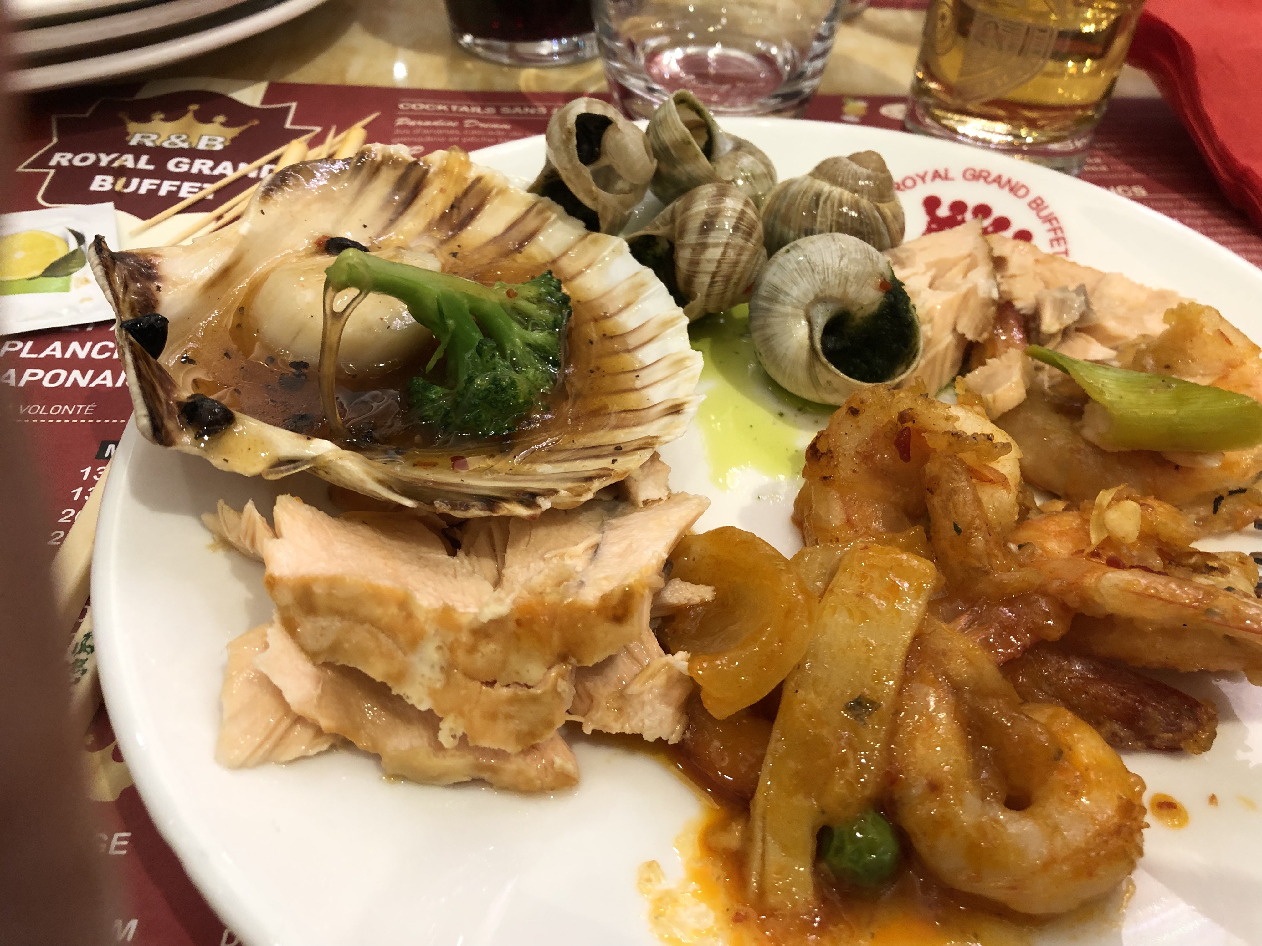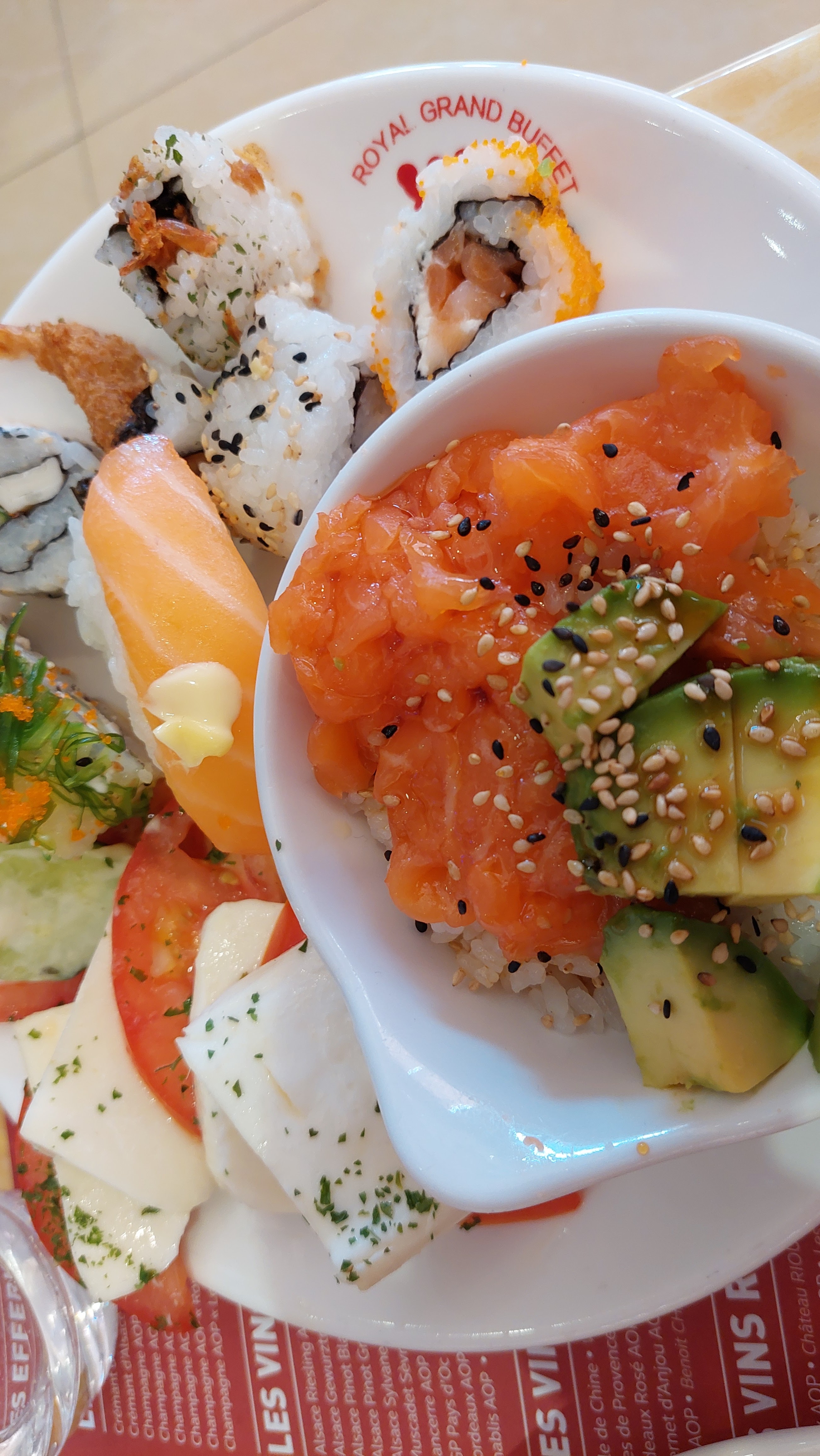 Grand Buffet avec beaucoup de choix. Il y en a pour tout les goûts. Sushi, Maki, California, salades, nems et autres fritures, saumon grillé. Et un grand choix de viandes, poissons et crustacés à faire grillé minute. Pas mal de choix pour les dessert aussi. Seul bémol le bruit et le monde.
