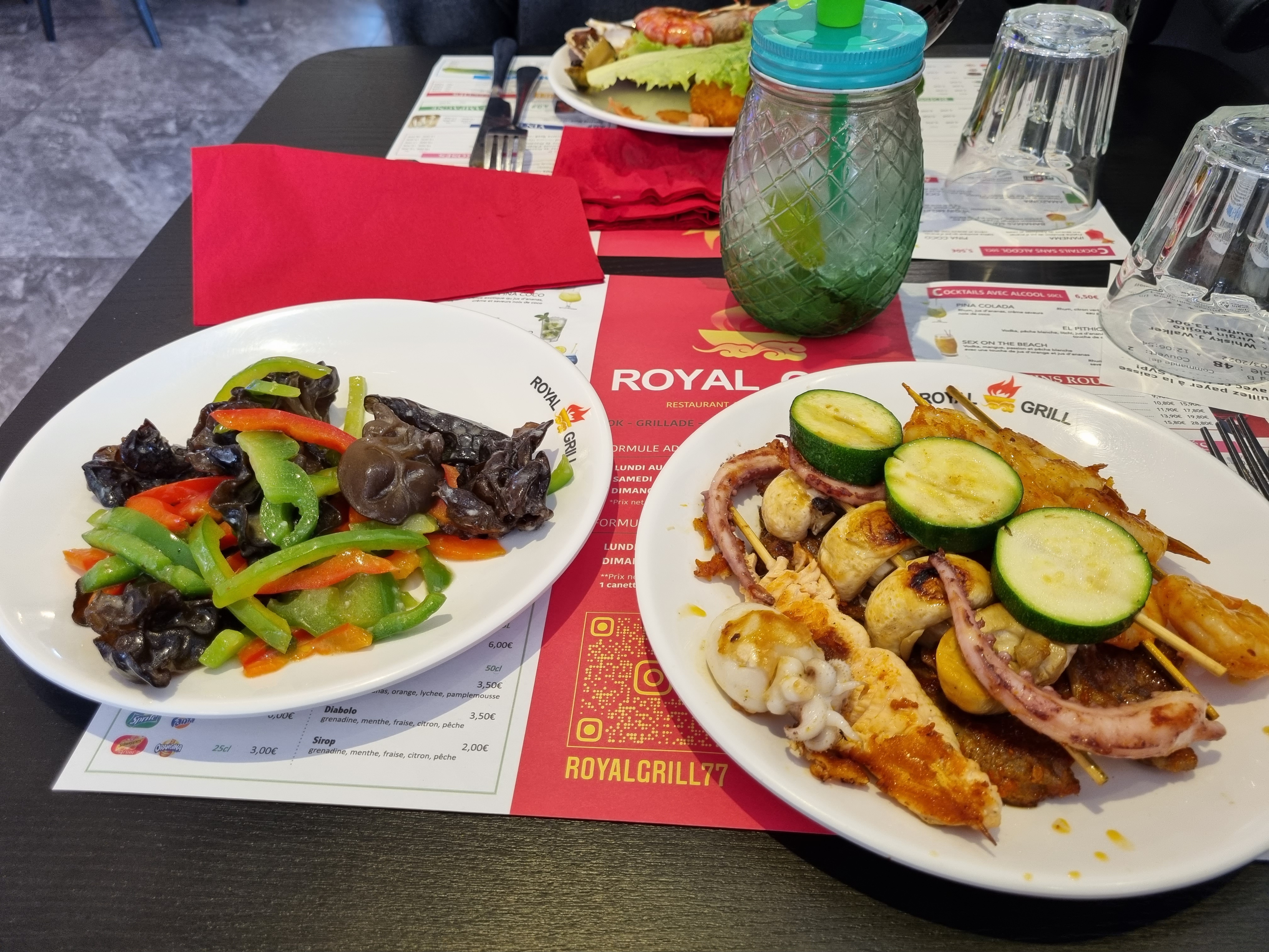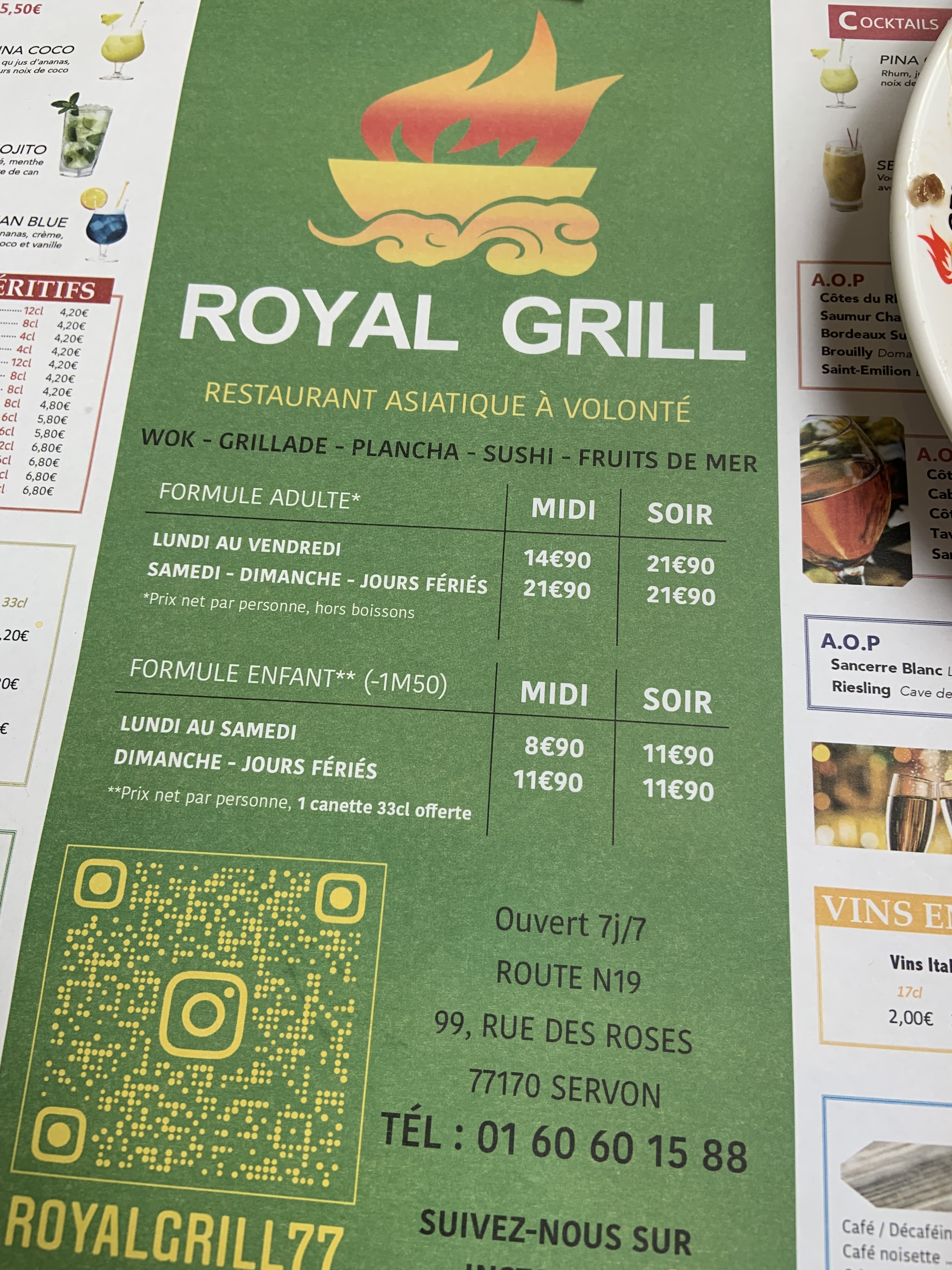 Horrible, diarrhée dès que je suis sortie douleur au ventre toute la nuit et ça continue, mon mari vomissements toute la nuit et douleur, plus jamais ce restaurant asiatique plus jamais. Fruits de mer pas frais, le poisson sur les sushis étaient sec et les bulots ramollis ils s'effritaient, y avait du monde sur la moitié du restaurant et l autre vide, les gens sont même pas espacés. On a mangé d'autres trucs qui nous paraissaient bons, mais résultats : 1 intoxication on aurait dû partir en courant dès le début purée n'y aller pas les amis, ça sert à ça les avis, les vrais avis, pour vous avertir, je suis vénère d'avoir lâché mon argent pour être malade derrière. Royal Grill = mauvaise qualité