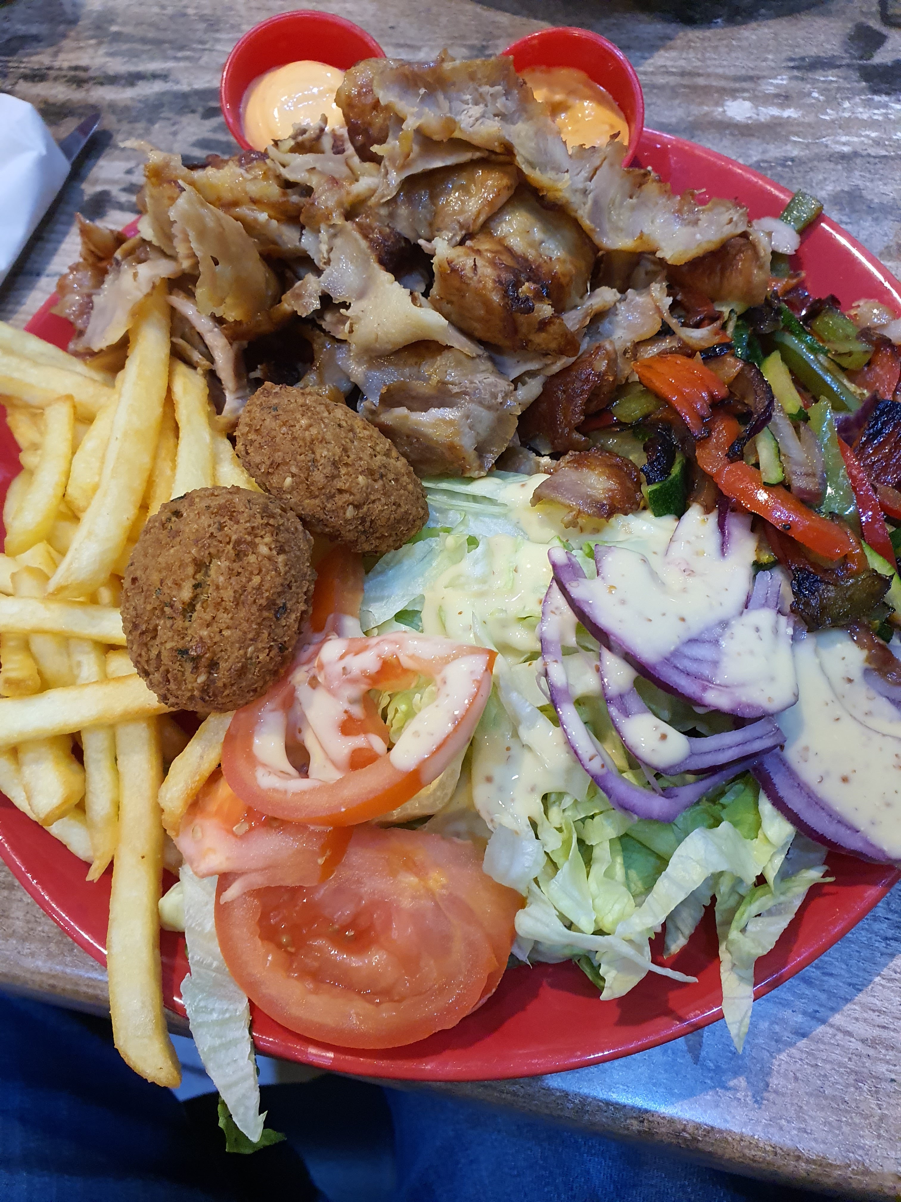 C'est la première fois qu'on y mange et ce ne sera pas la dernière. On s'est régalé. Des bons petits légumes frais (poivrons, oignon rouge, courgette et frites). ça change. Merci.