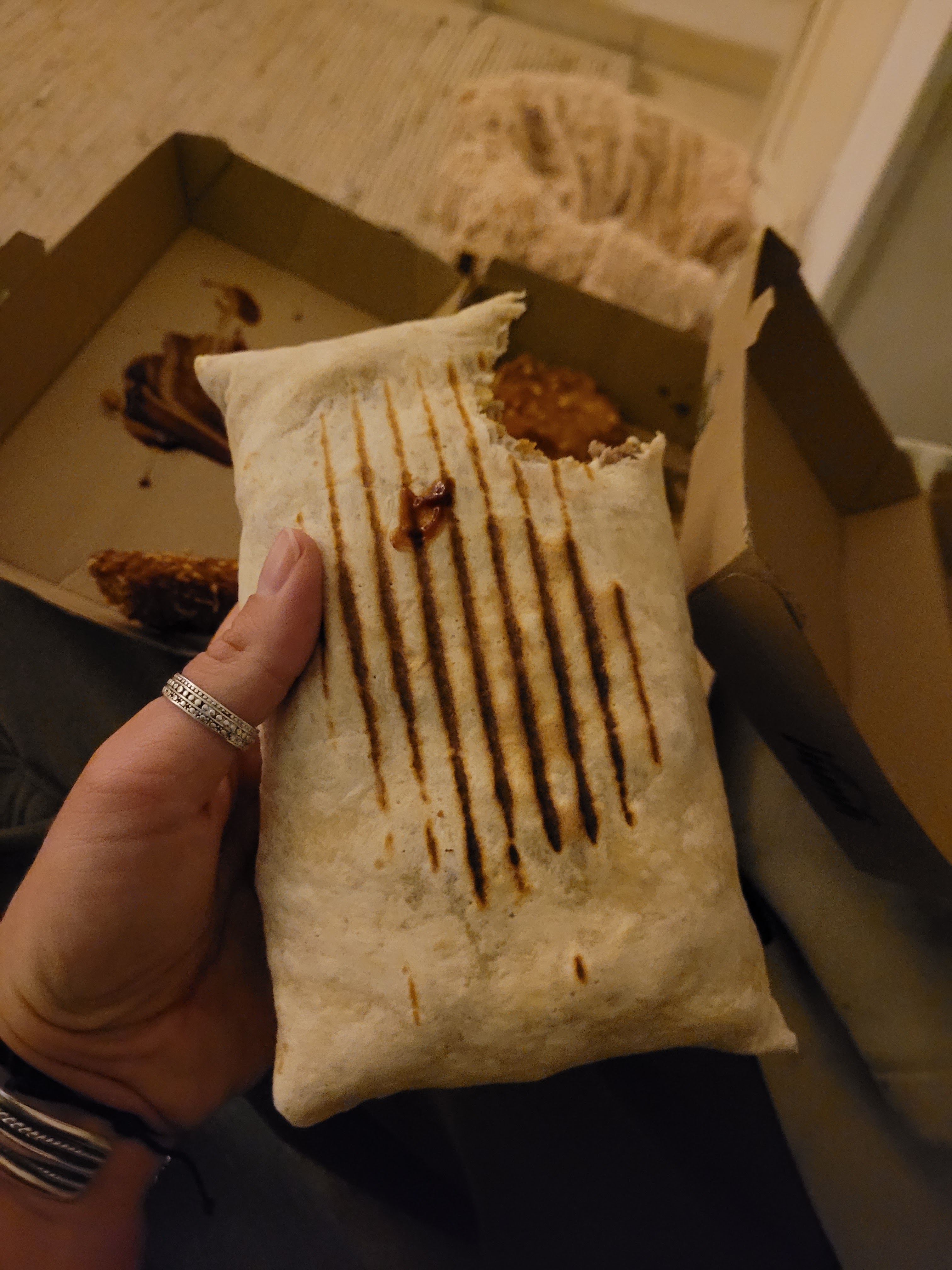 Commande à emporter pourtant explicitement dites. Je me retrouve une fois arrivé chez moi avec une combinaison d'ingrédients et de sauces mystère. Seulement 50% de ce que j'ai demandé était présent à l'intérieur ? Ou est passé le reste ? Chez le voisin ? Première, et dernière fois.