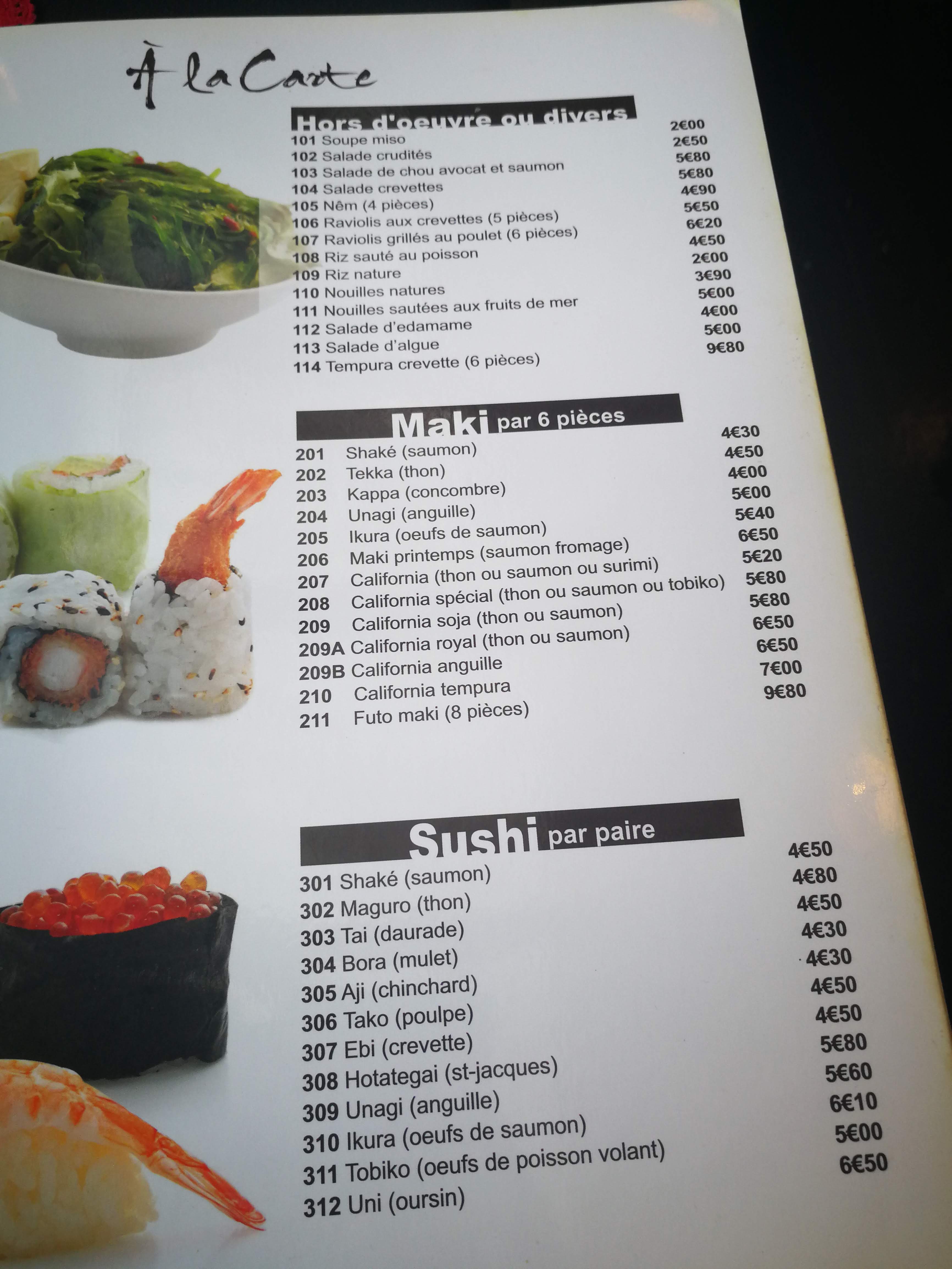 nous y avons commandés 3 fois et jamais déçu. le poisson est frais et l'accueil est agréable. la salle est agréable même si nous n'avons pris qu'à emporter. les nouilles natures sont bonnes et le riz des menus peut être accompagné d'oeufs et saumon pour 1.50€ de plus. ça change du riz nature habituel. c'est une bonne adresse. je recommande