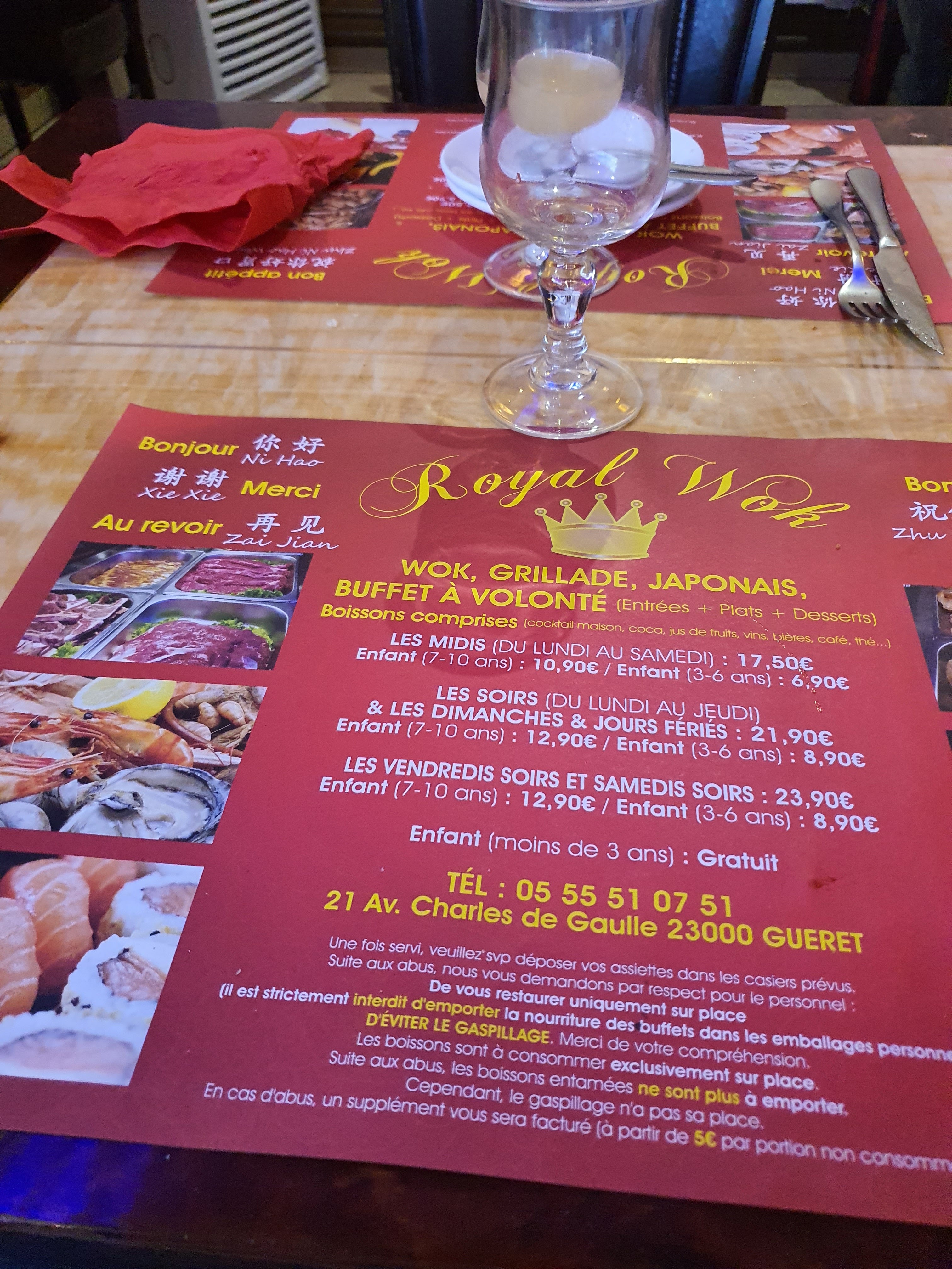 Personnel accueillant, belle qualité de sushis (manque peut-être un moyen pour mieux garder la fraîcheur, mais ils partent tellement vite et sont préparés en temps réel). Le wok est top également. Salle grande, manger au calme est difficile. On apprécie néanmoins la très grande variété de plats et desserts. Mise à jour du 1/01/2023 : la situation de monopole en terme de buffet asiatique sur Guéret et la hausse du coût des produits ont conduit à une hausse conséquente des tarifs en quelques mois. Désormais manger au Royal Wok le week-end devient une vraie dépense (22€). A ce tarif, vous pourrez envisager d'aller dans un restaurant traditionnel avec une formule entrée plat dessert toute à fait copieuse. La qualité des sushis a légèrement diminuée : tranches de poisson plus fines et makis plus fins aussi. Dommage.