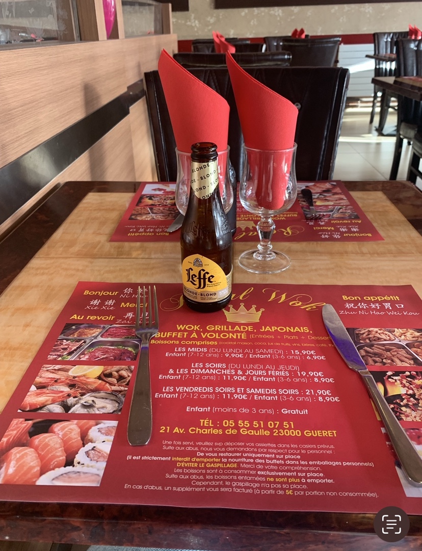 15 euros le midi en semaine ? C'est carrément cadeau ! La qualité n'est pas à son maximum mais pour le prix d'un buffet à volonté, il est tout de même très bon ! Les boissons sont également à volontés, les sushis et les wok sont très bons aussi, le personnel tres accueillants. Les desserts ne sont pas incroyables mais je le répète, pour le prix c'est déjà très bien d'avoir ça dans une petite ville comme guéret