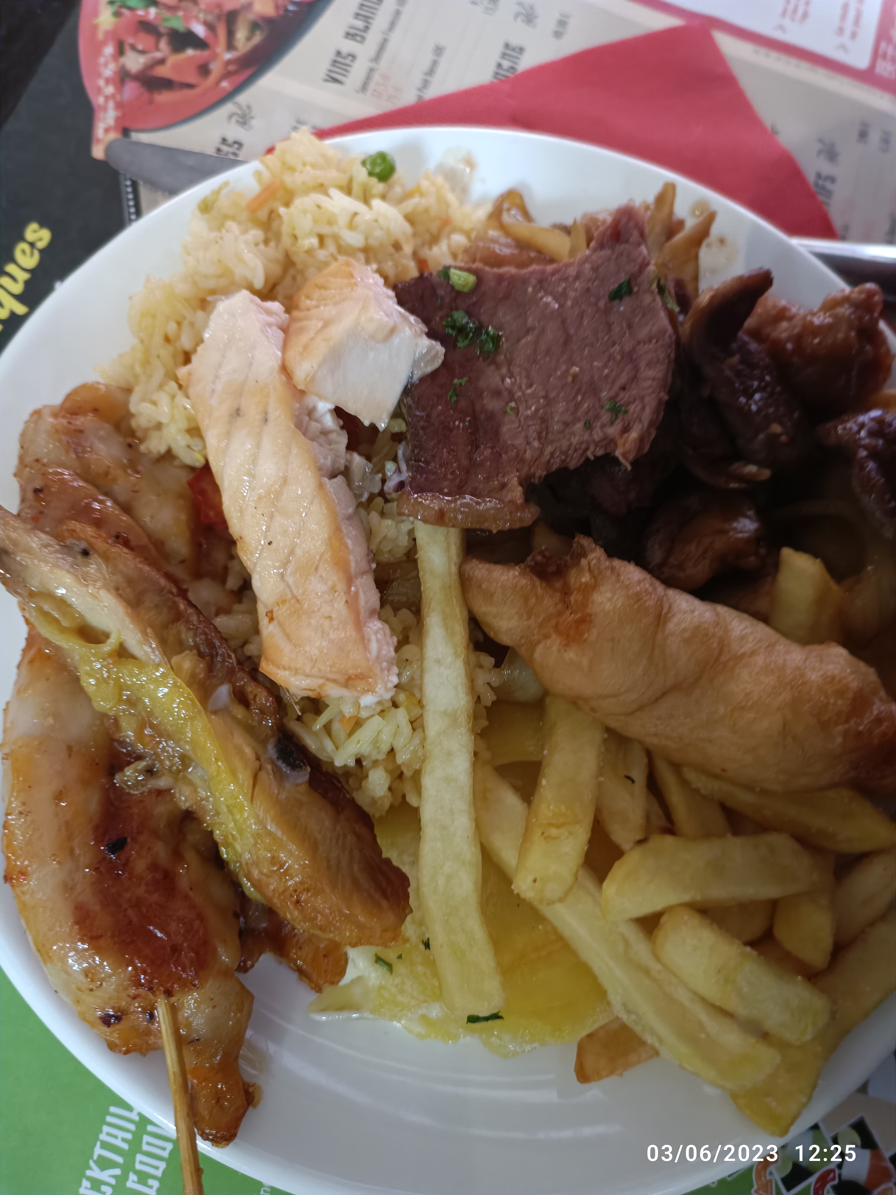 J'ai eu l'occasion de manger dans plusieurs restaurants de ce type partout en France et j'avoue que je retourne souvent pour goûter à tous les plats proposés. Dans cet établissement, à chaque assiette nouvelle, c'était limite du dégoût car soit c'était fade soit c'était ultra gras, sans parler des mouches vertes qui volaient dans les vitrines froides...les glaces sans goût, l'ambiance...serveurs qui matent des clientes... La faute au COVID-19 et peut-être les coûts revus à la baisse? La proximité des fast-food KFC & autres Macdo? Dans ce genre d'établissement, je m'attendais à mieux qu'un mal au bide pour ma compagne et moi..
