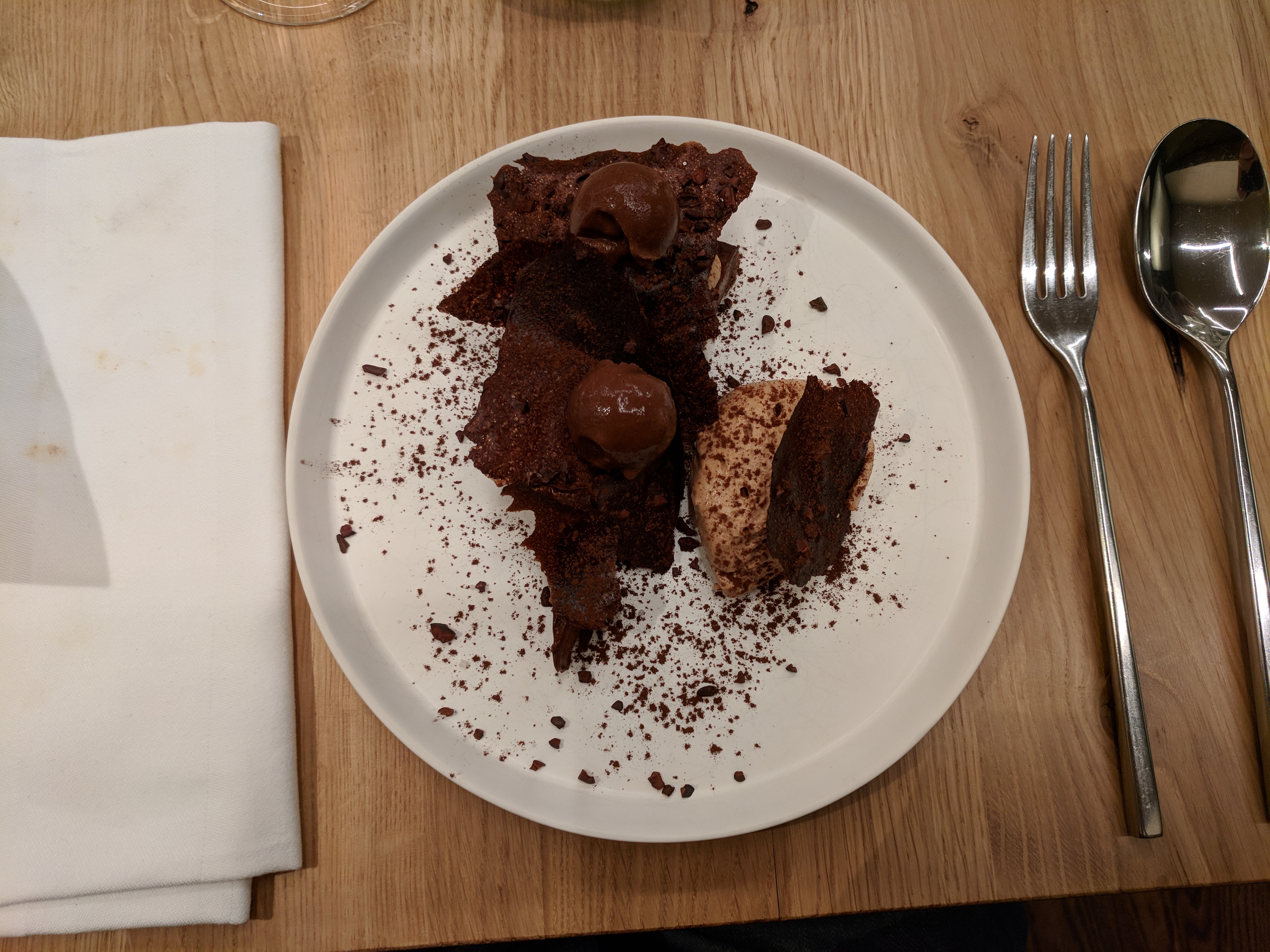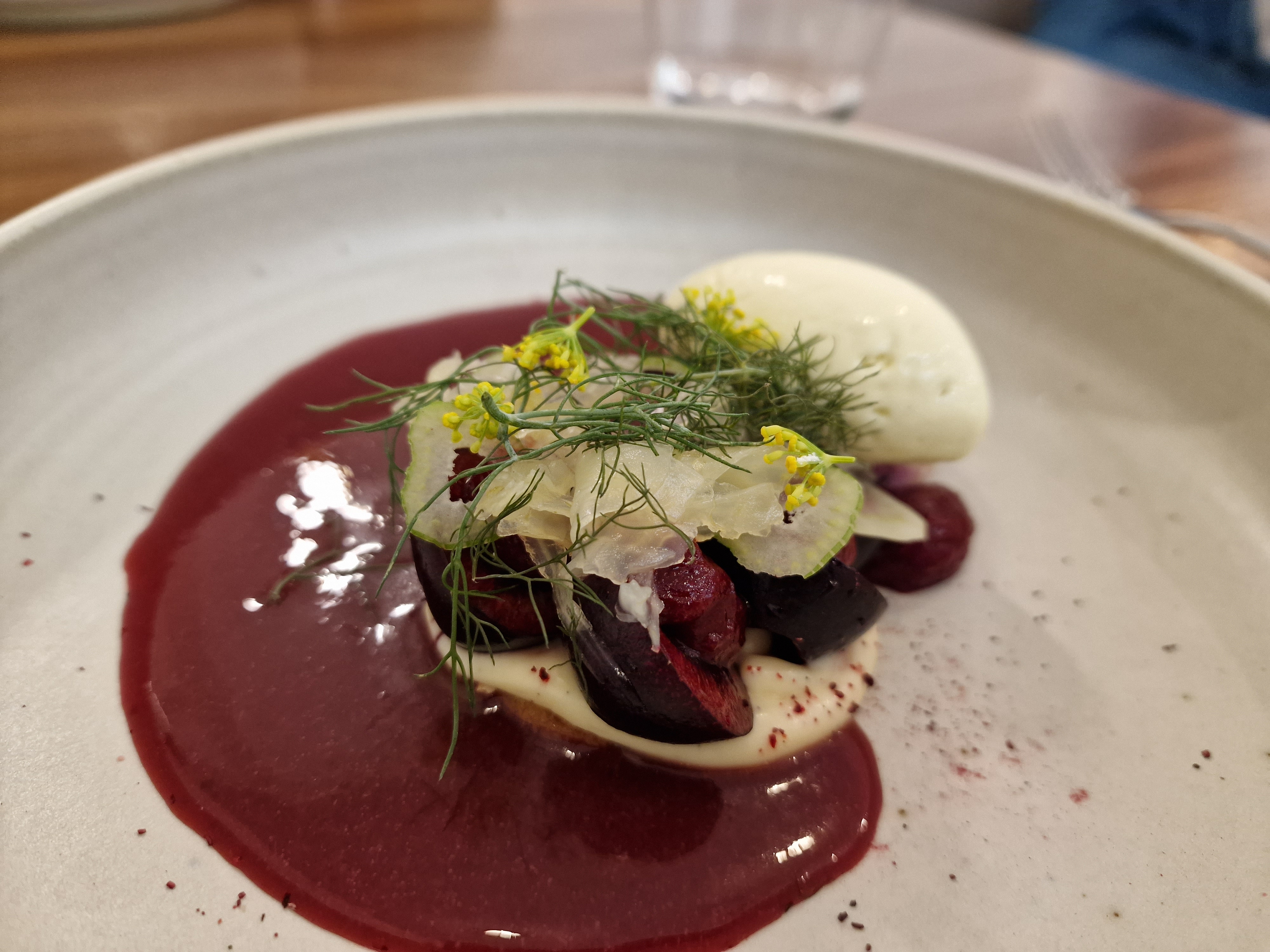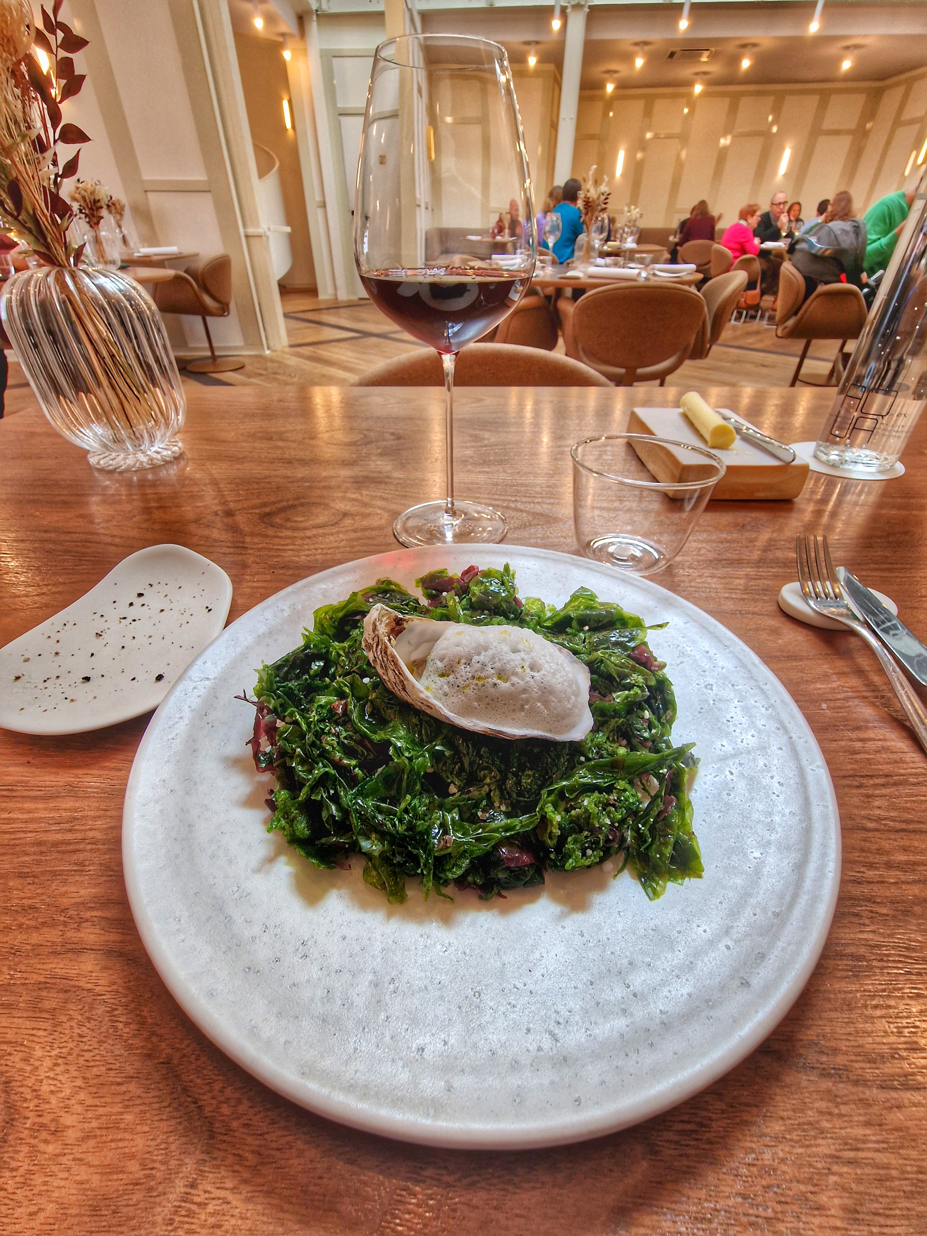 L'ambiance est agréable, assez minimaliste. Le service est un peu long à mon goût (30 minutes entre chaque plat environ, on est resté 3h sur place en ayant pris le menu simple à deux). J'ai bien aimé : le premier plat. Iodé juste ce qu'il faut avec un travail intéressant sur les algues. Le fromage, revisité sous 4 formes. Et le dessert, où là aussi, les différentes formes, textures et températures étaient assez chouettes. J'ai été moins séduit par les deux autres plats.