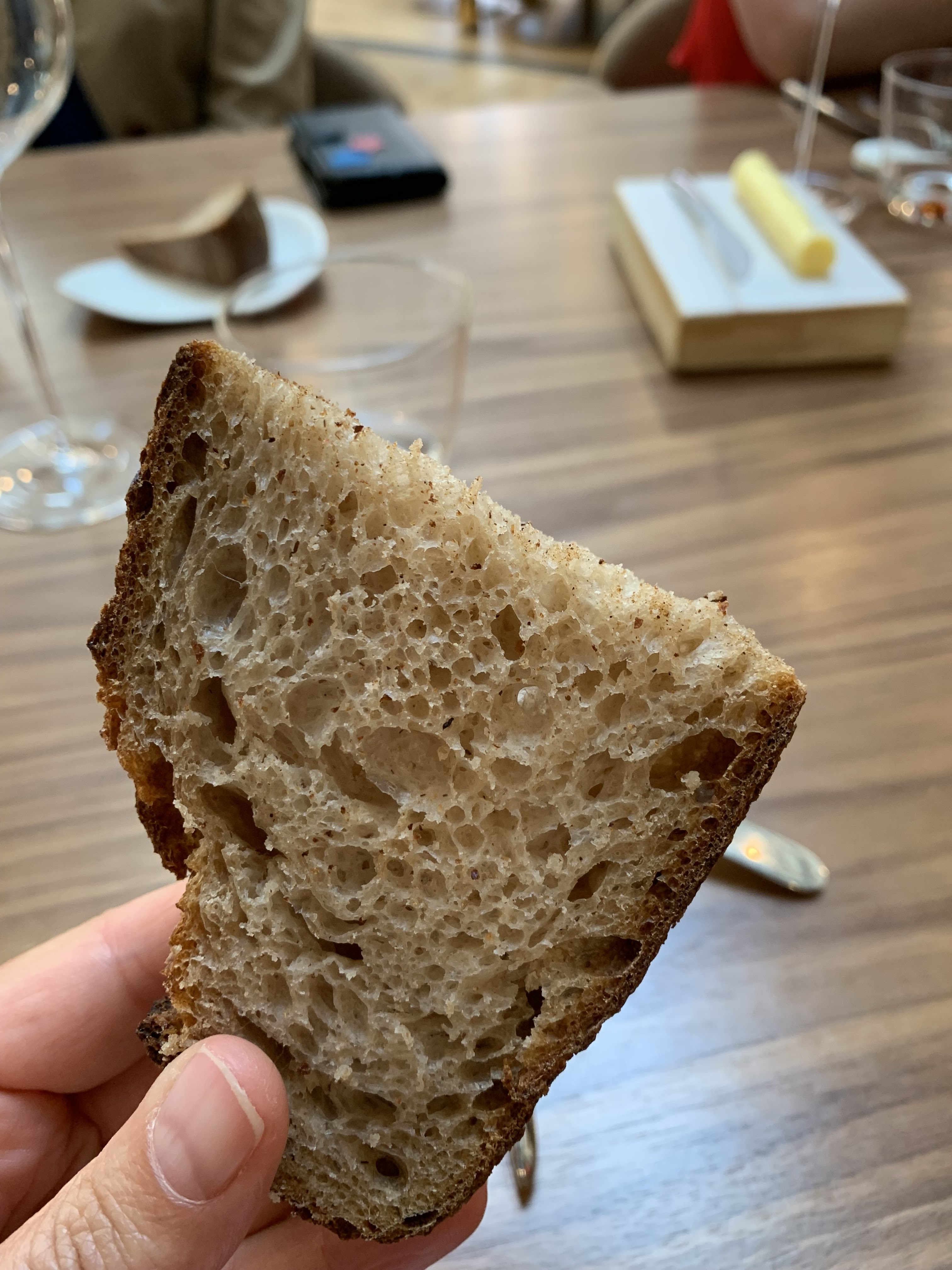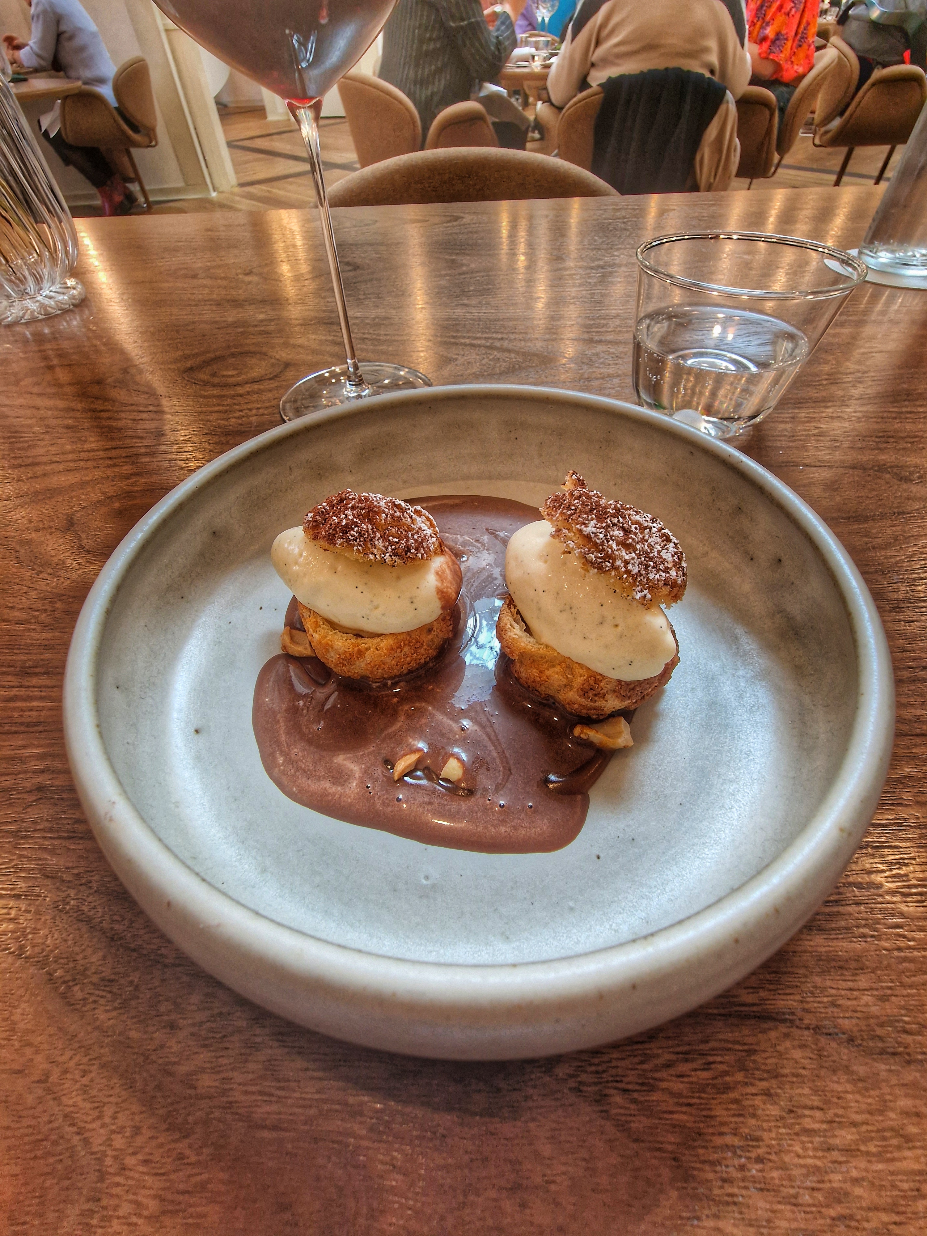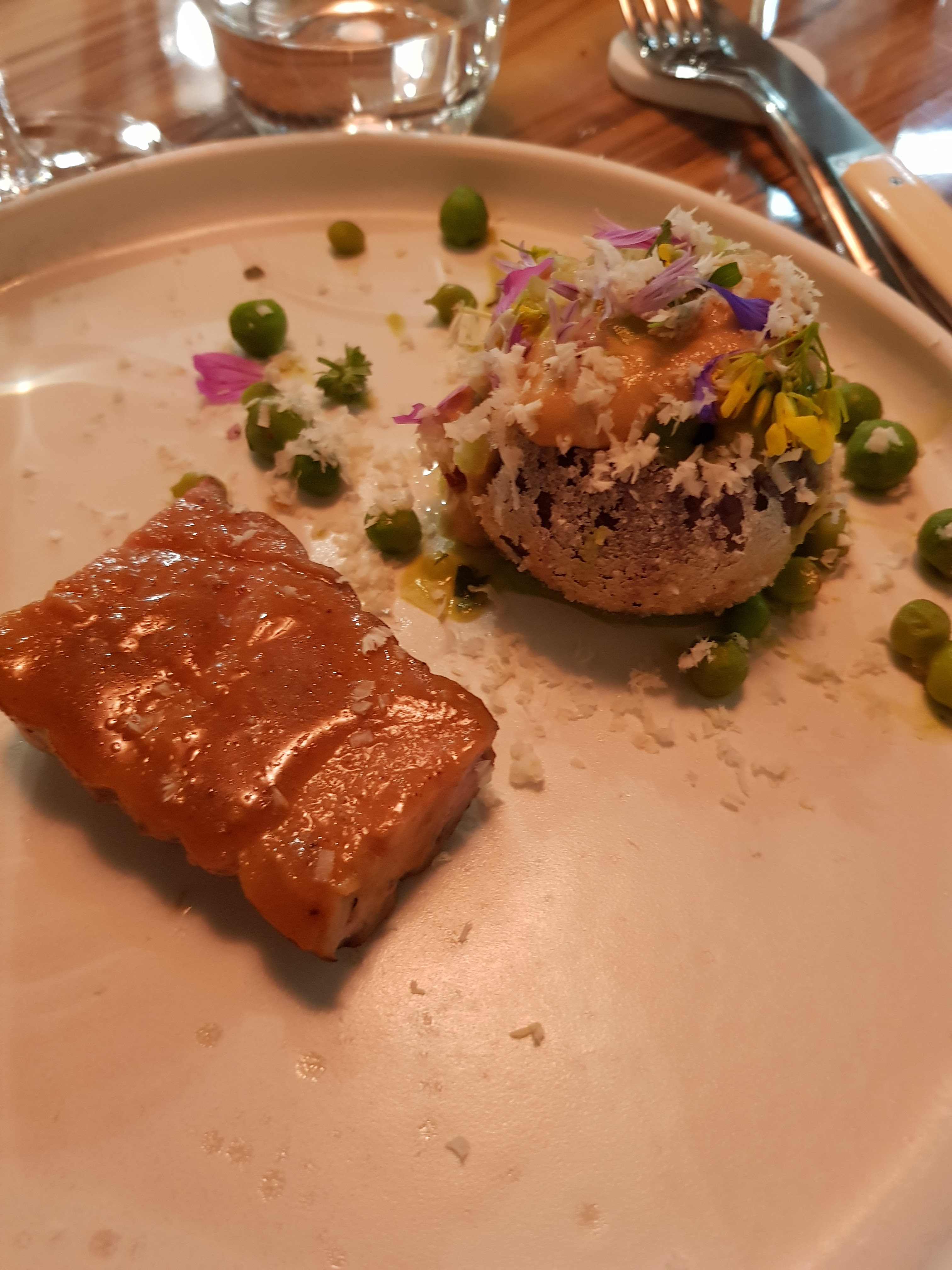 J'avais prévenu en amont pour une allergie ce qui a permis d'avoir un menu adapté. Au niveau des plats, des bonnes saveurs avec une présentation cohérente et soignée (si on exclut un cheveux dans un des plats). Très bonne expérience culinaire si on exclut un agneau beaucoup trop tiède. L'accompagnement vins était pertinent, j'étais perplexe sur le dessert pour lequel le vin m'avait été vendu sucre (ce qu'il n'était pas) mais il était finalement très adapté. Par contre je n'ai pas apprécié le vous voulez de l'eau plate ou gazeuse proposé dès l'arrivée (une formulation qui impose finalement den prendre) pour se retrouver au final avec de l'eau du robinet (certes filtrée) avec un prix margé à ×20! (Et surtout que prenant l'accompagnement, je ne souhaitais pas d'eau. Bref, pour rester sur l'eau, celle-ci lorsqu'elle a été (mal) servie, a éclaboussé la table où elle est restée tout le repas. Elle a d'ailleurs été étalée ensuite lors du ramassage du pain...