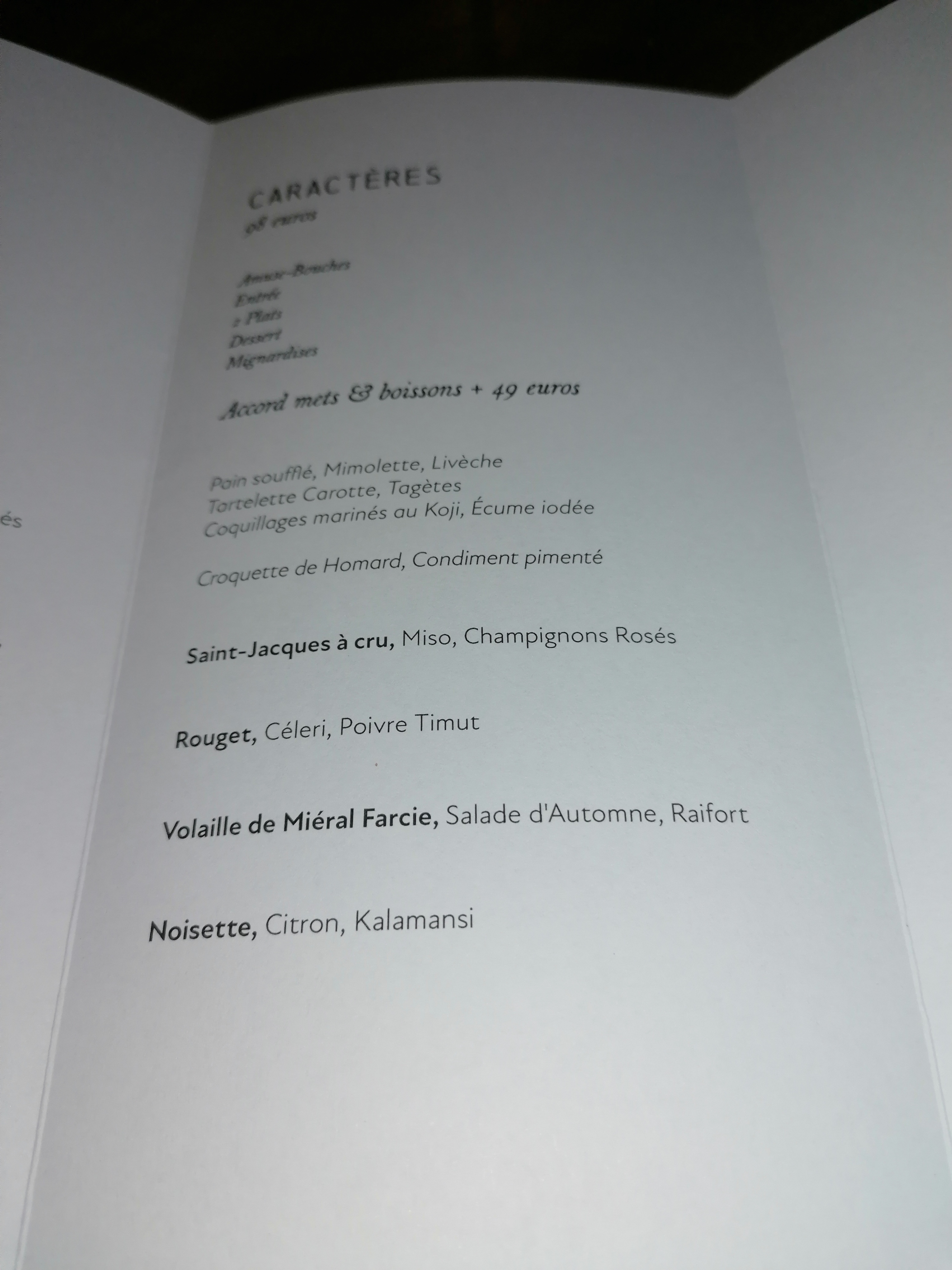 Pas de fausses notes pour ce menu! Tout était exceptionnel des amuses bouches au dessert…le maquereau avec son bouillon, le homard , l’agneau. Tout était gourmand et savoureux, surprenant et toujours excellent ! Quand est ce que l’on y retourne ? Encore merci!