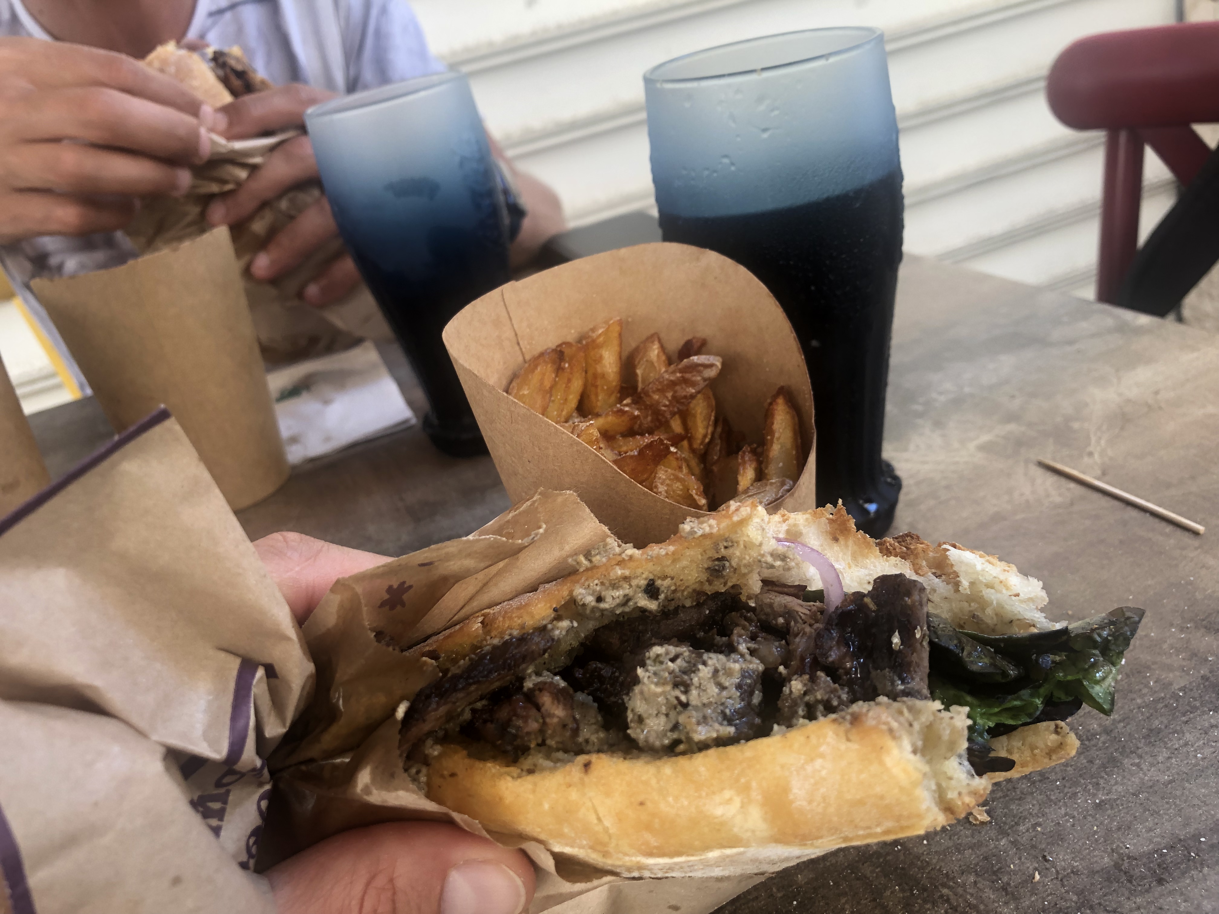 Nous avons pris un burger et un porcameli baguette, c’était vraiment très bon et typique. N’hésitez pas à manger ici !