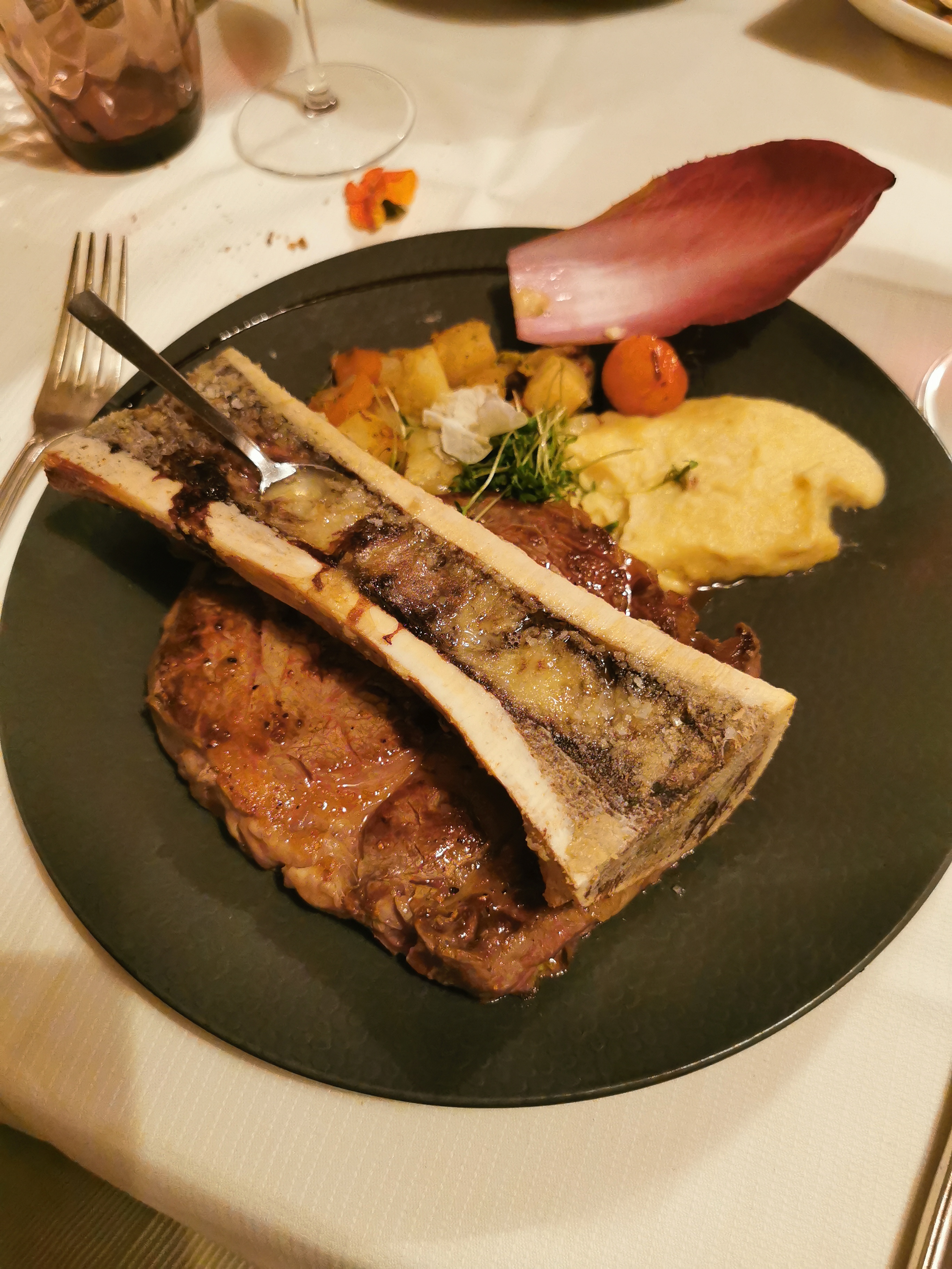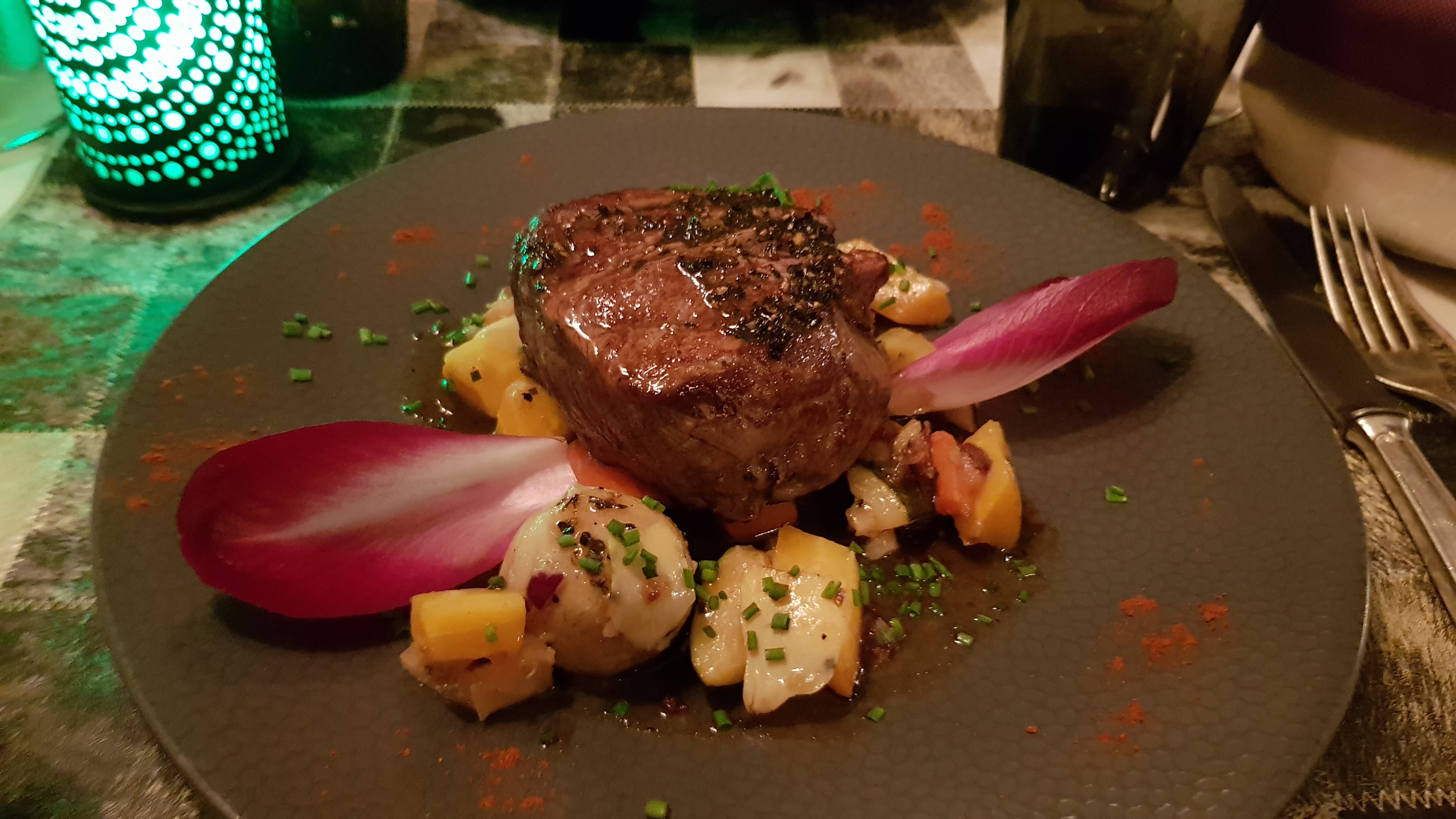 Filet de bœuf excellent par contre pour une table de 16 et une addition de plus de 800€ pas un seul geste, ni marque d'attention pour un double anniversaire... Un petit café aurait été le bienvenu mais on ne nous en a même pas proposé... Et steack tatare moyen surtout au prix demandé et accompagnée d'une salade verte ! Belle présentation des plats mais peu d'accompagnement pour les viandes et poissons.