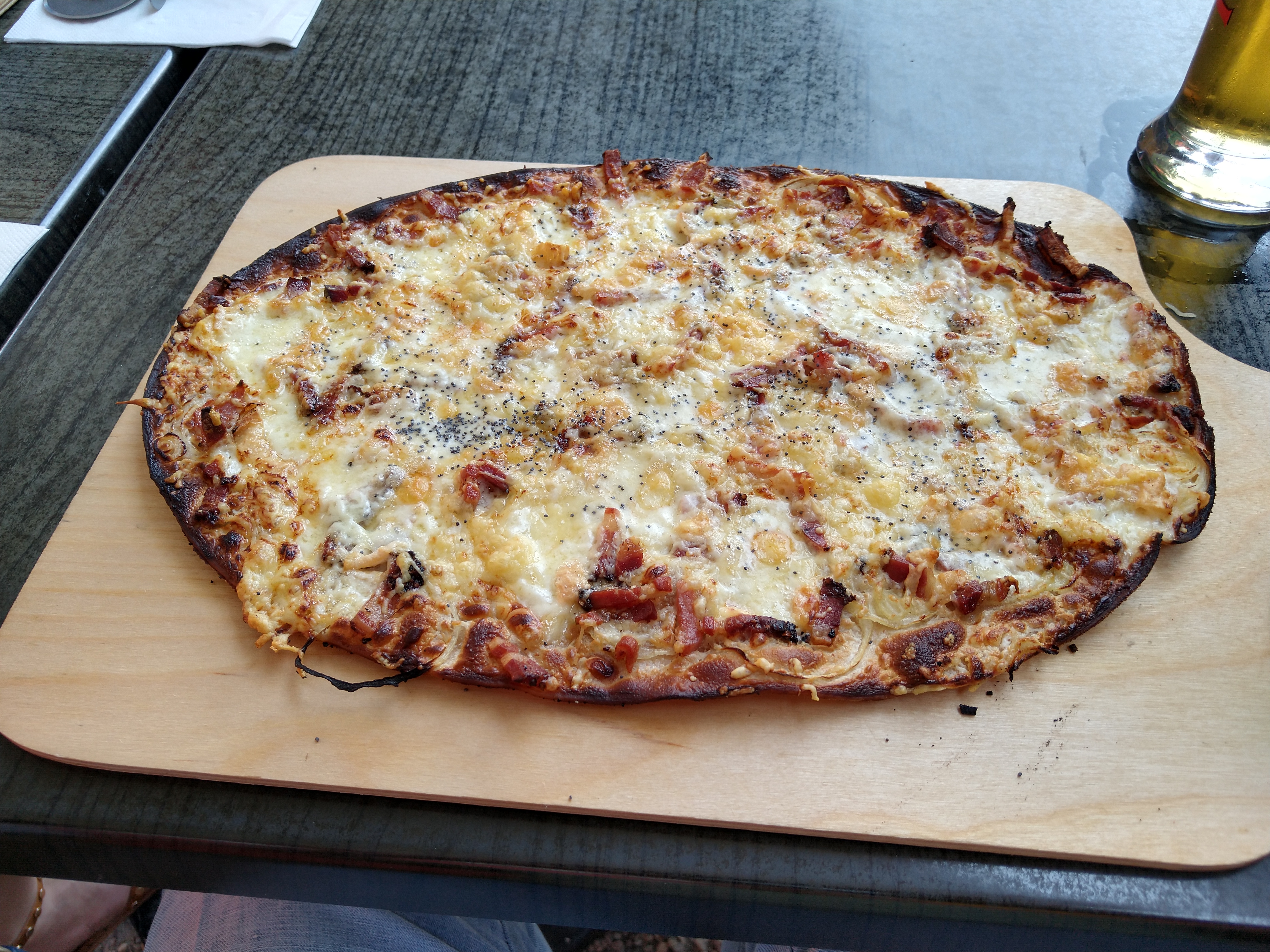Nous avons dégusté une délicieuse tarte flambée pour le dîner.