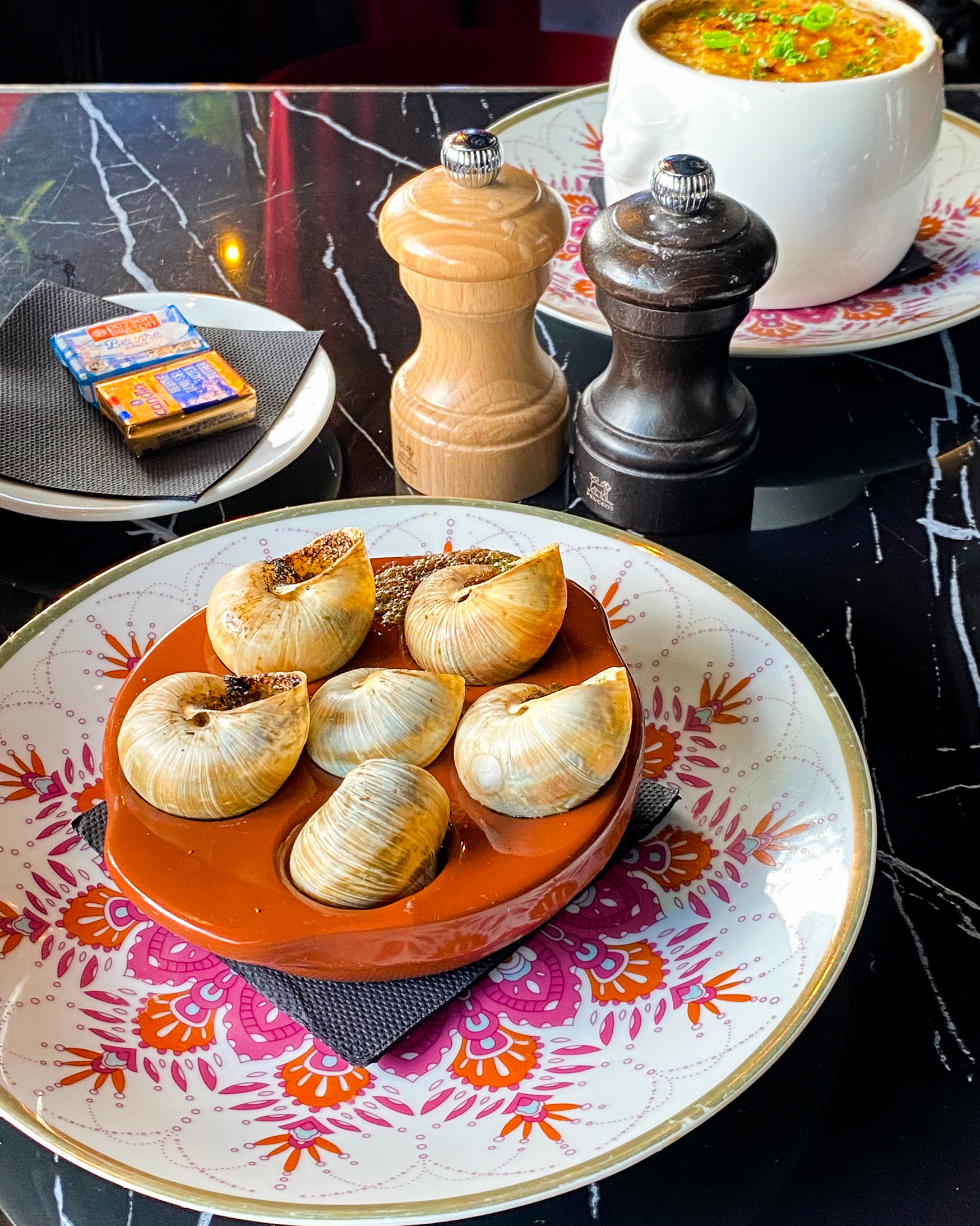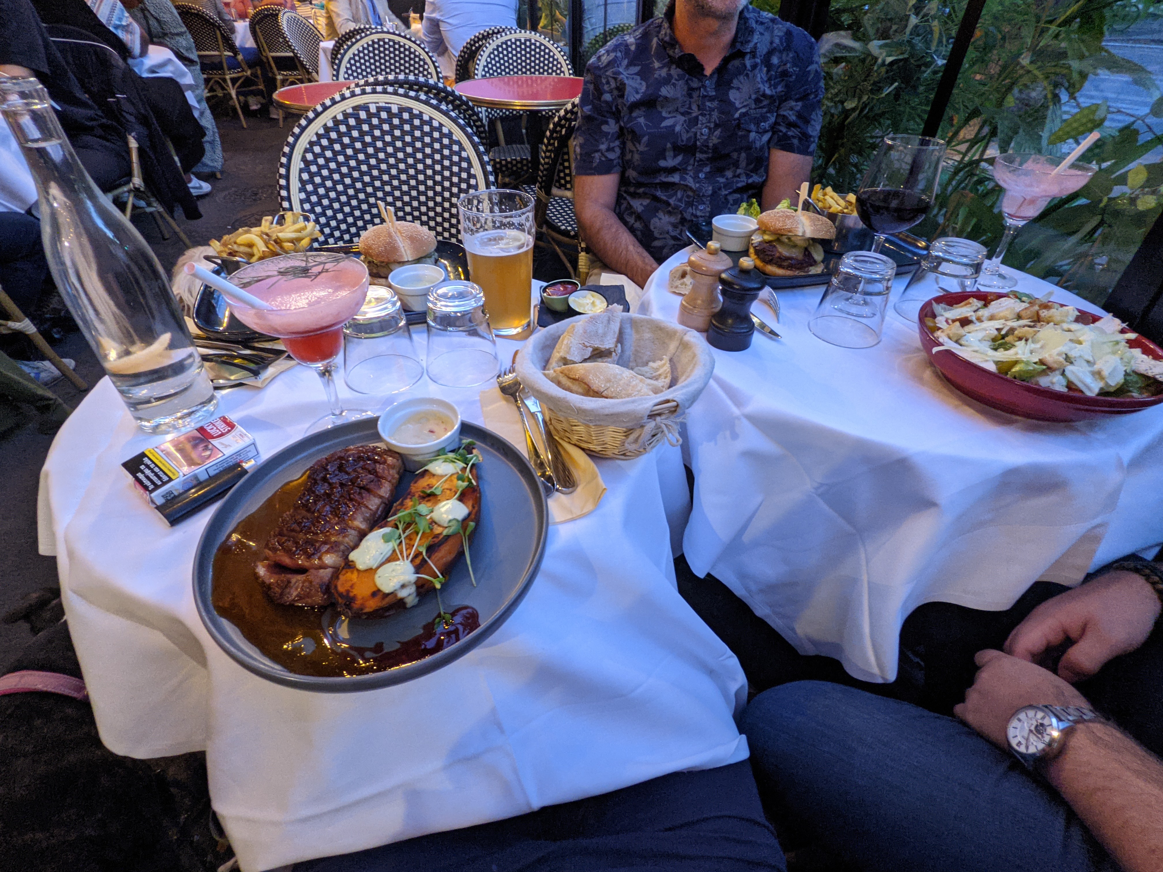 Deuxième dîner à Paris, nous avions envie d'escargots, de foie gras et de soupe à l'oignon française, nous pensions avoir touché le tiercé gagnant. Mais ils n’avaient pas de foie gras poêlé. Mais tout va bien, tout le monde a apprécié la nourriture et le service ! Nous avons commandé des œufs à la diable, du foie gras à tartiner, 2 os à moelle, des hamburgers au poulet, des hamburgers au bœuf, des soupes à l'oignon françaises, des escargots et des salades végétariennes du chef. Dans l’ensemble, les soupes à l’oignon françaises étaient les meilleures que nous ayons eues, les escargots étaient frais et savoureux, la moelle osseuse riche et grasse. Le foie gras fait maison était onctueux et savoureux. La note des steaks était de 7/10, pour des plats mi-saignants. Pas aussi tendre que les steaks que nous avions en Belgique. Mais le service était attentionné et excellent. C’est un endroit décent pour les grands groupes en semaine.