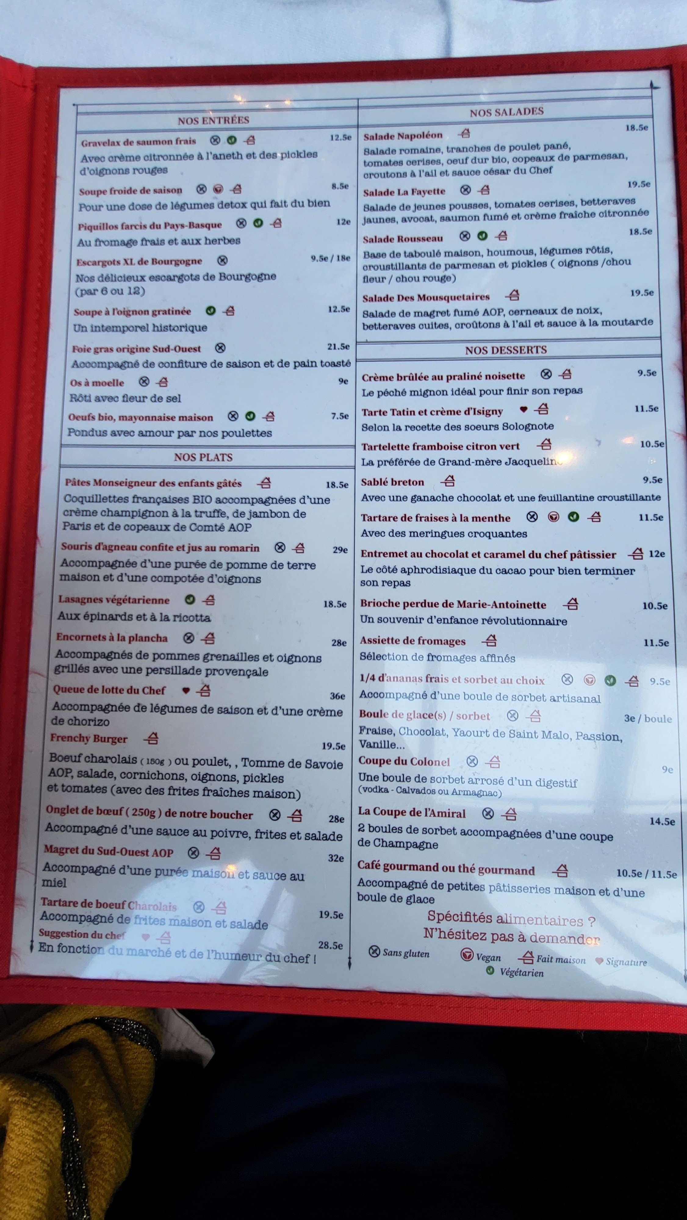 Bonne nourriture, boissons, service et ambiance! En tant que personne ayant des besoins alimentaires, c'était bien d'avoir un menu clair avec les allergènes indiqués. Certainement un meilleur service que celui que j'ai connu dans d'autres restaurants à Paris. Nous avons même eu droit à des digestifs gratuits à la fin de notre dîner. Merci!