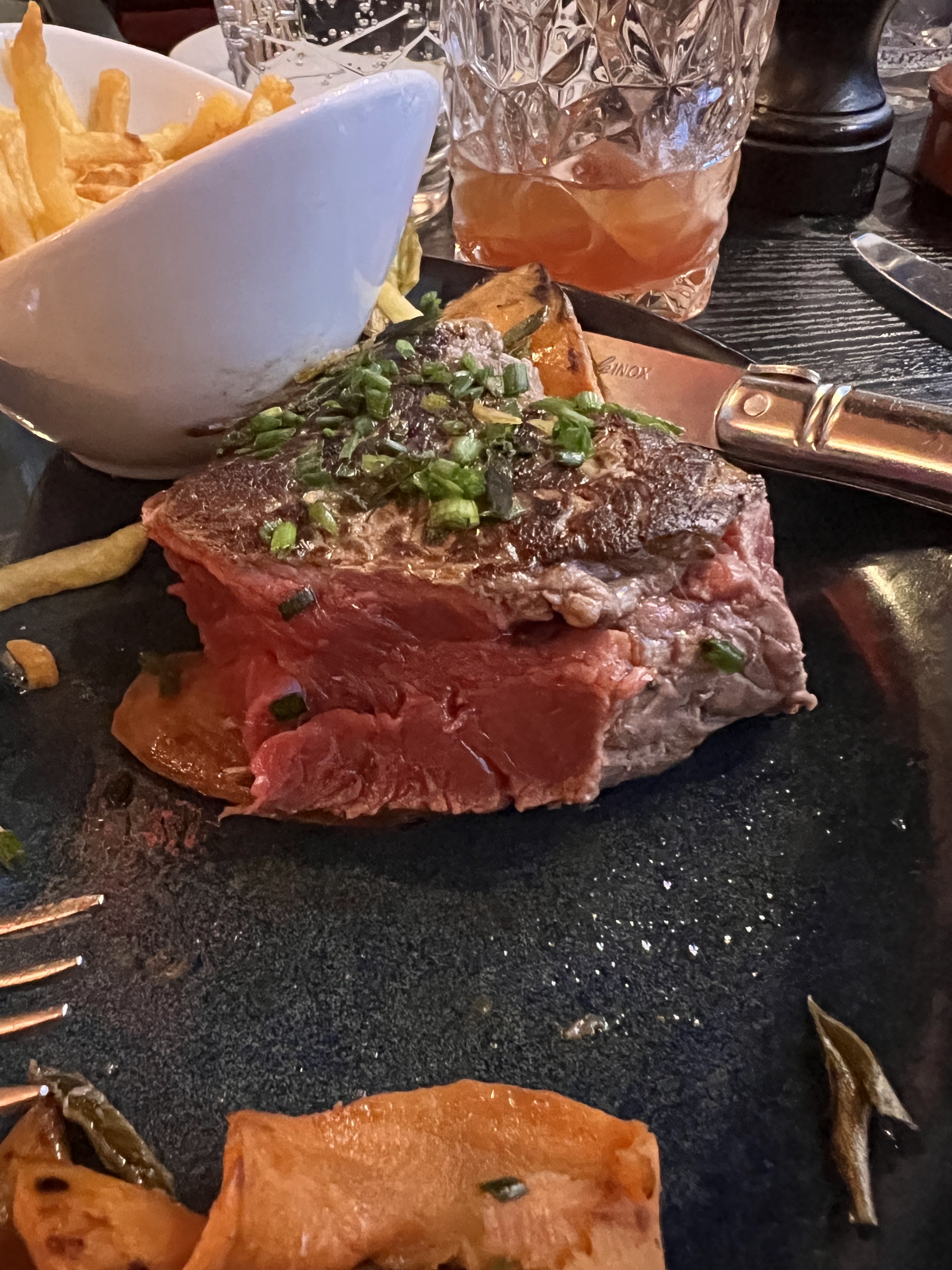 Je ne fréquente pas habituellement ce genre de restaurants mais j'avais une envie de filet mignon. Le service était fabuleux par Sandra, 5 étoiles - elle était vraiment une explosion de rires et de sourires. La nourriture était bien trop cuite (Filet mignon (Porc)). Je l'ai renvoyé et je ne voulais pas de remplacement. Frites que j'ai renvoyées car elles étaient molles et détrempées Le directeur est venu et a été très gentil et a écouté et est revenu avec un dessert pour moi, ce que je ne voulais pas, alors mon plus 1 l'a mangé. Le responsable m'a ensuite acheté une crème brûlée (que j'ai demandée) et c'était absolument crémeux et appétissant - bravo à l'équipe Le vin était super Dans l'ensemble, allez boire un verre avec SANDRA