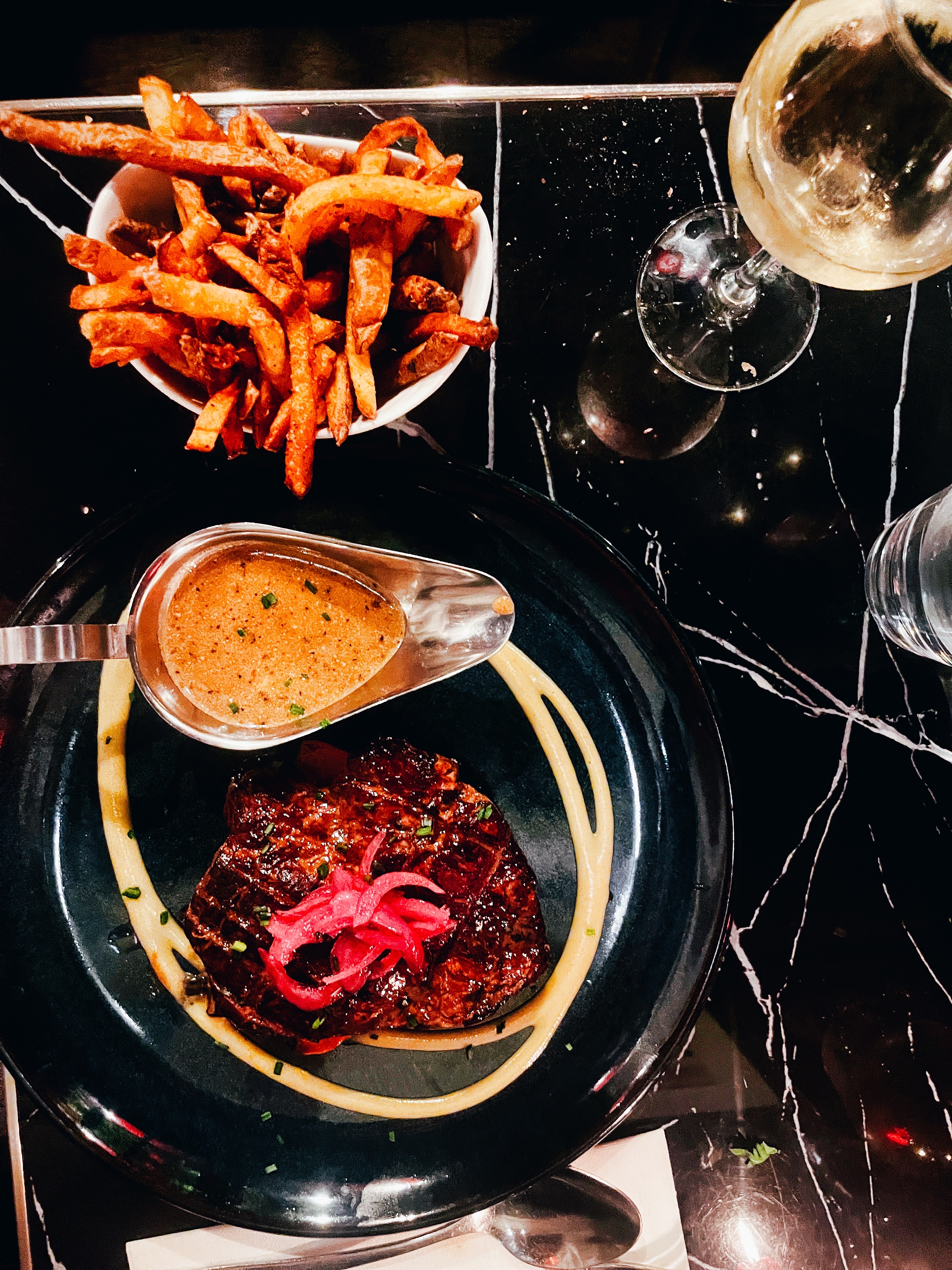 probablement mon meilleur repas à Paris. J'ai pris le canard, le steak était vraiment bon aussi, la moelle osseuse n'était pas aromatisée, la crème brûlée était aussi bonne que la plupart.