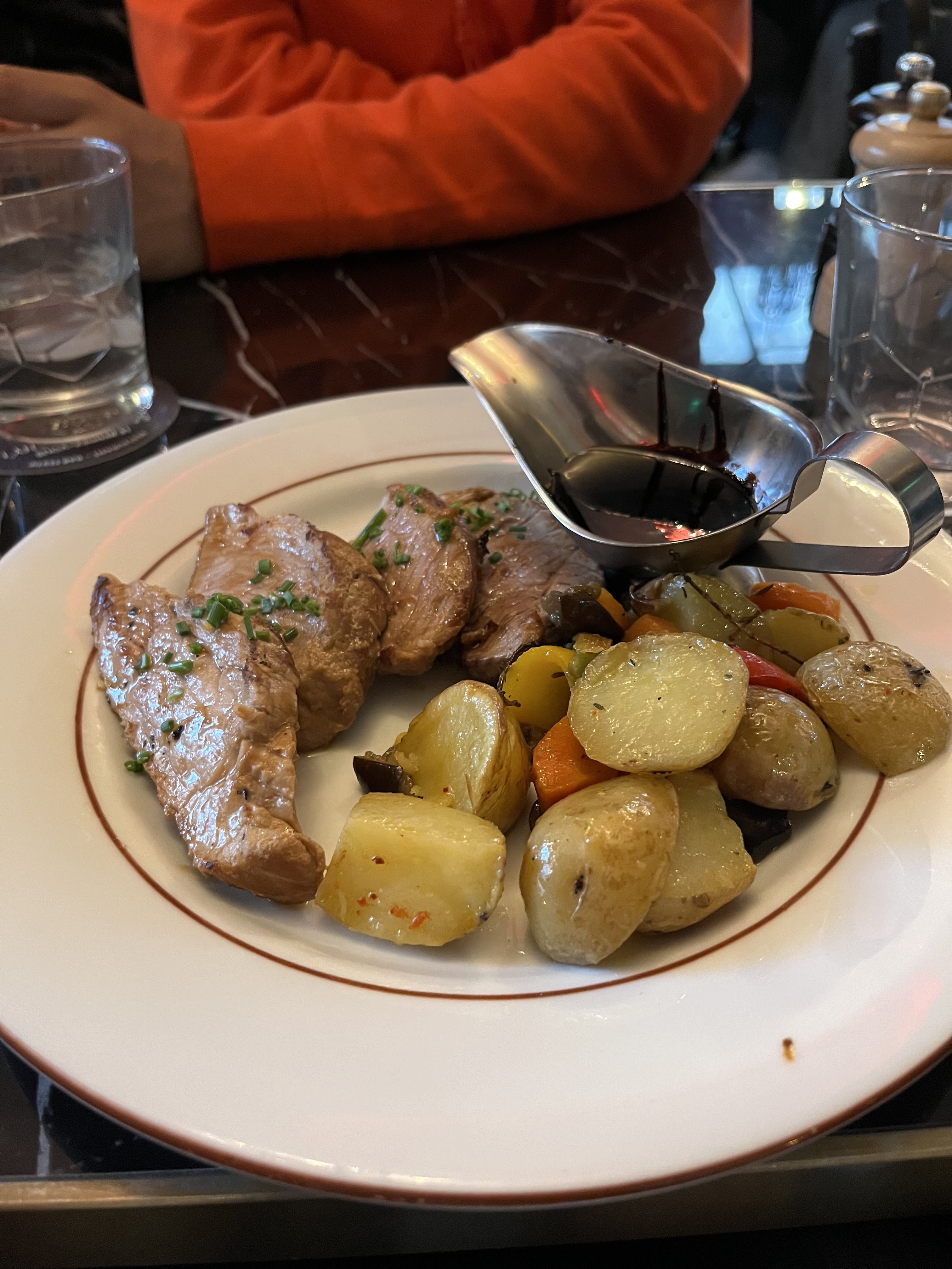 La nourriture était très bonne Malheureusement, le personnel était un peu désynchronisé (ils ont apporté un couteau sale après qu'on leur ait demandé d'en changer un sale ; les boissons n'étaient pas servies ; nous avons commencé notre plat principal sans couverts) L'eau du robinet gratuite et les prix modérés étaient également un gros plus !