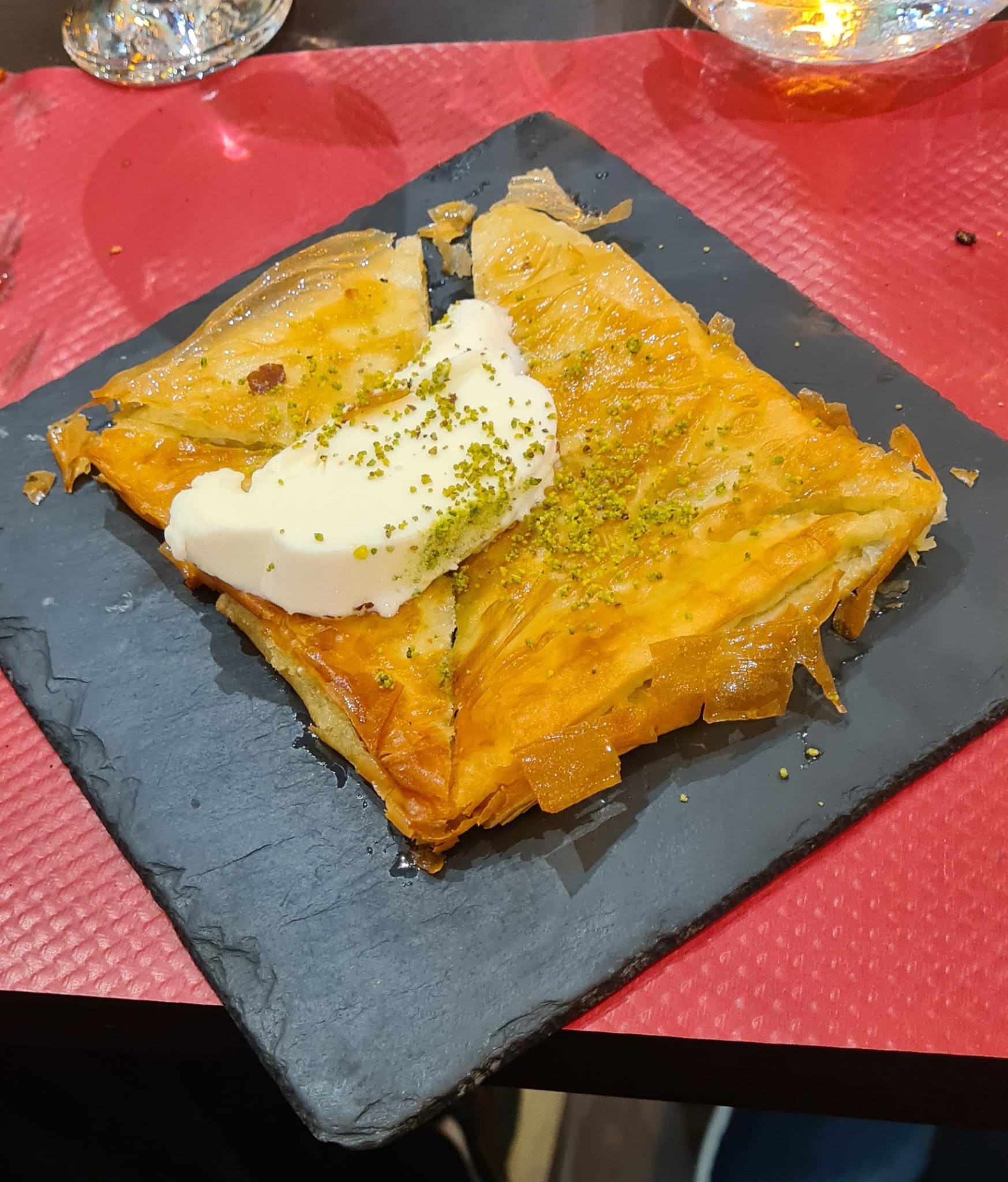 La qualité est ok malgré la quantité, pas généreux, dommage, le dessert baklava pas frais, bonne glace