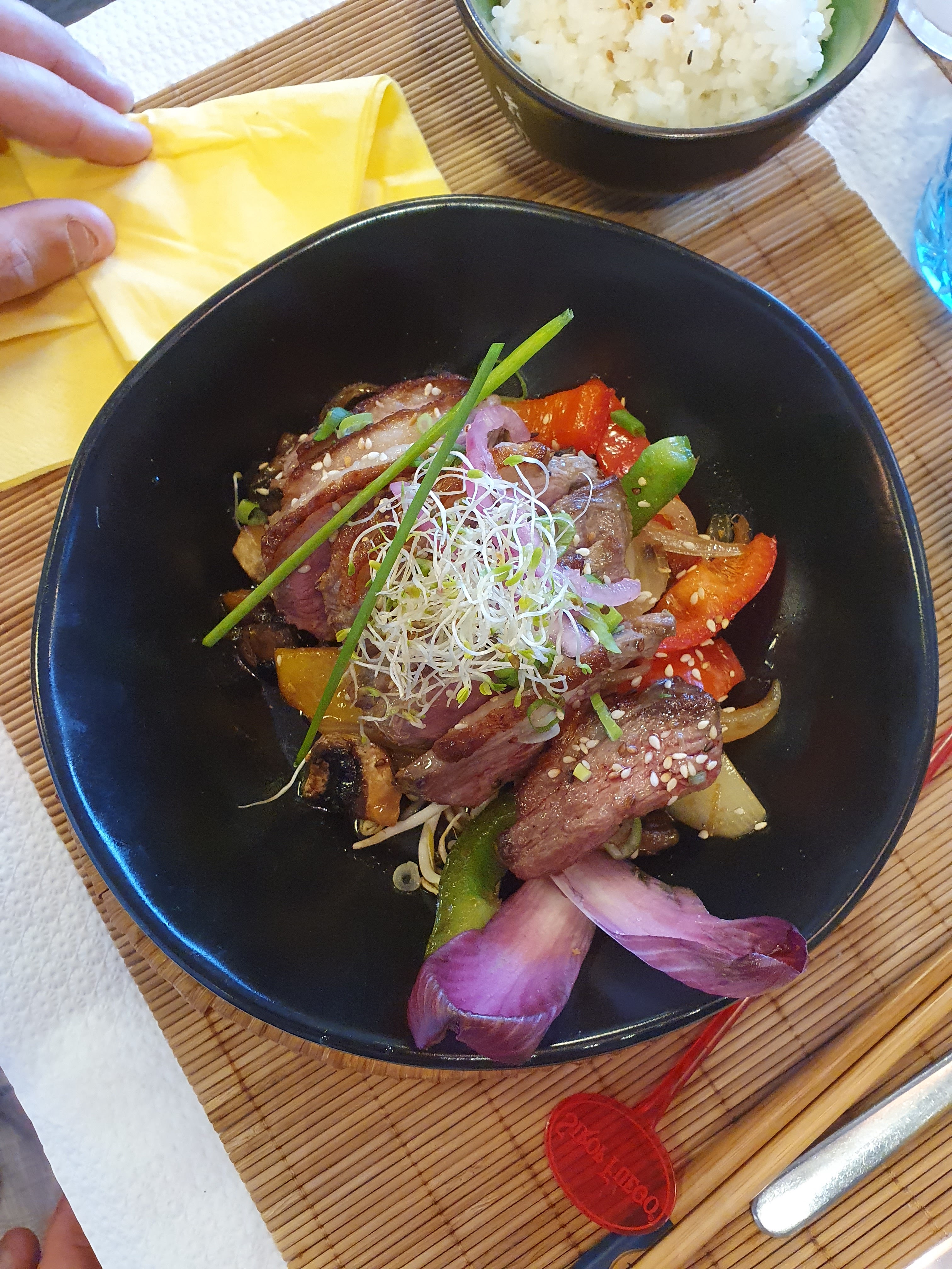 3,90 € le micro bol de riz car les plats ne sont pas accompagnés. Plats de canards d ailleurs sans goût sans épices ni herbes parfumées. Micro crudités sans sauce ..... On est très loin de l' Asie Résultat 50 € pour l équivalent d un magret (à deux)un verre de vin et un D eau gazeuse A j oubliais plat servis sir plaque en fonte FROIDE