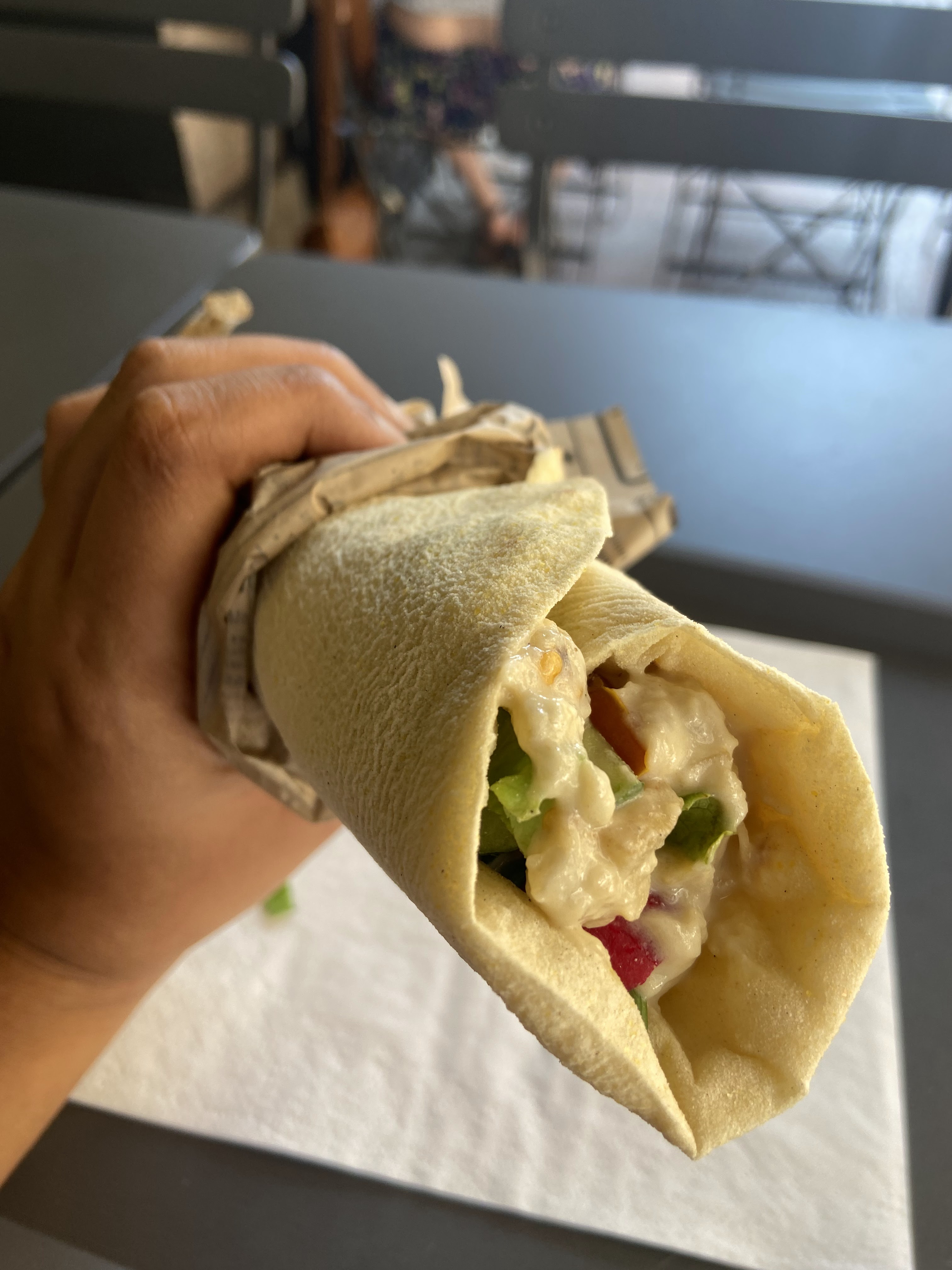 Le rouleau est plutôt bon, mais c'est un peu cher. Le houmous, par contre, pourrait être tout à fait amélioré, je ne le recommande pas.