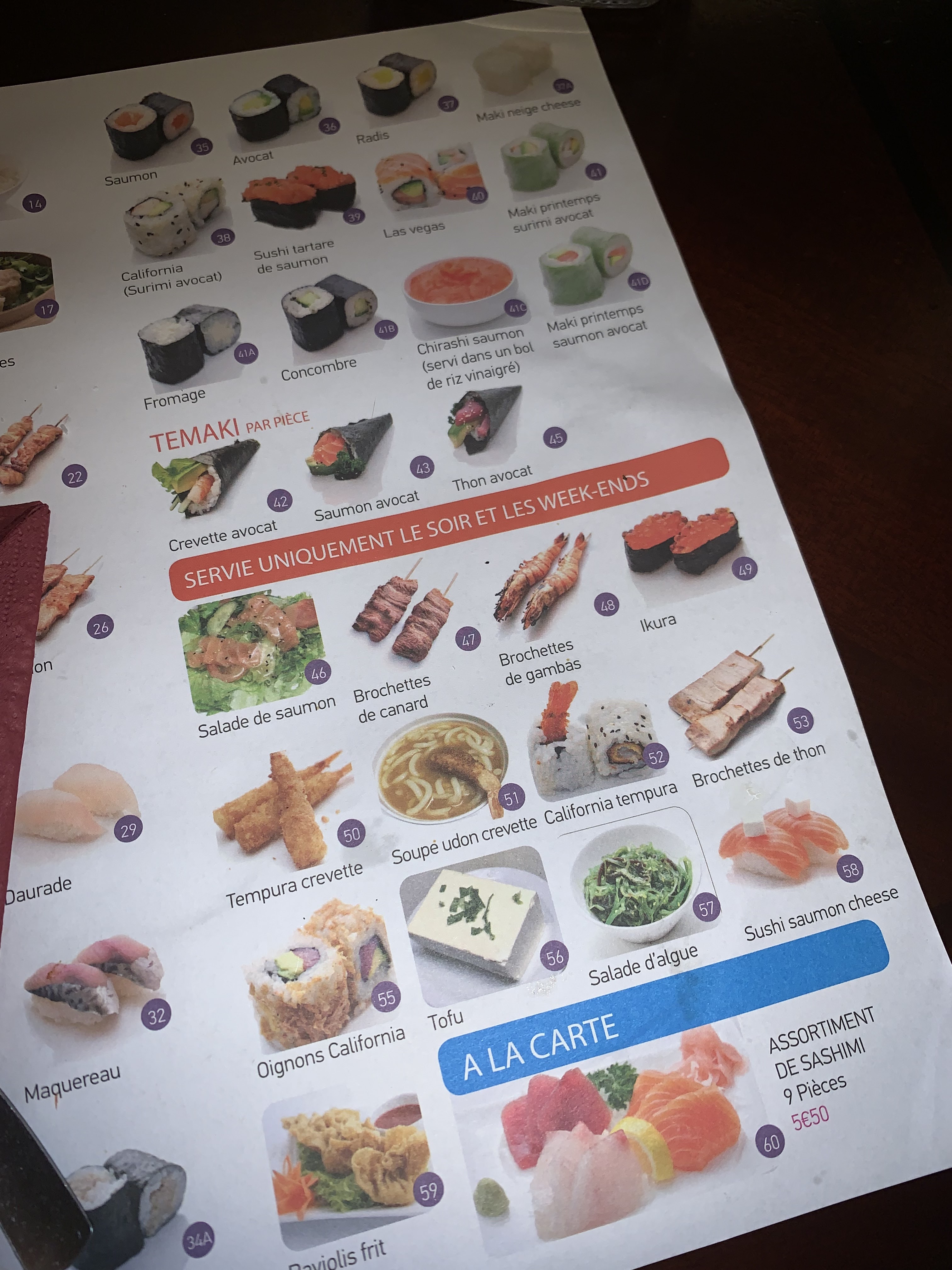Nous avons testé ce Restaurant Japonais pour la première fois et quelle déception ! Cet établissement est peu éclairé et ne fait pas propre du tout. Les serveuses ne sont pas souriantes. Néanmoins, le service est correct, mais les produits proposés sont de mauvaise qualité. Les calamars sont très gras, les brochettes de saumon sont toutes petites et pas bonnes, la salade de saumon sans intérêt car il n'y a pratiquement pas de saumon... Par ailleurs, il a fallu réclamer des petites coupelles pour le dessert. De plus, il ne restait pratiquement plus de choix. Nous ne recommandons pas ce restaurant.