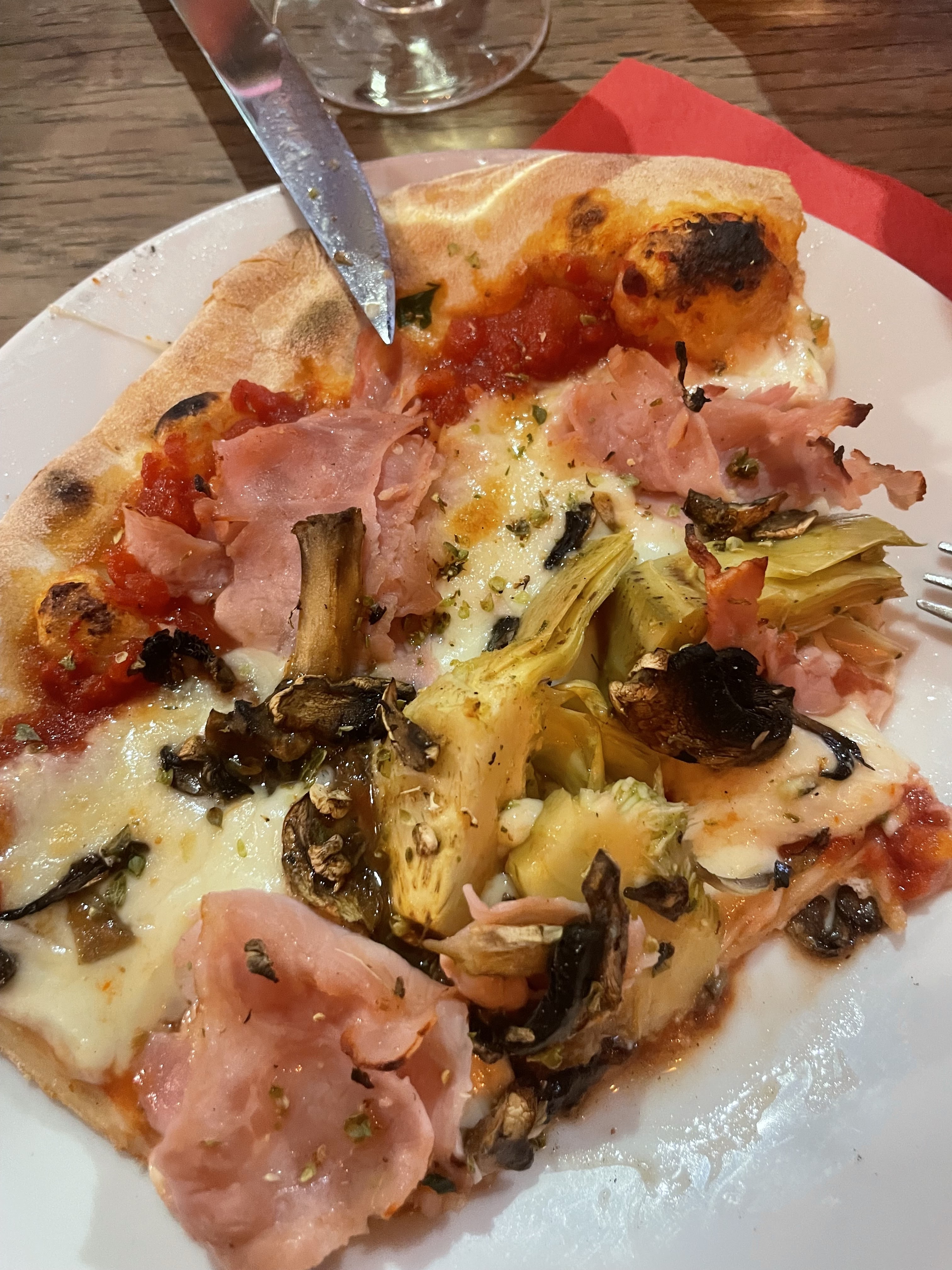 Vraiment pas dingue. Mis à part la pâte fine : une boite de tomates pelées, un peu de mozza, roquette, un bout de salami point barre. Mais par contre très gentil.