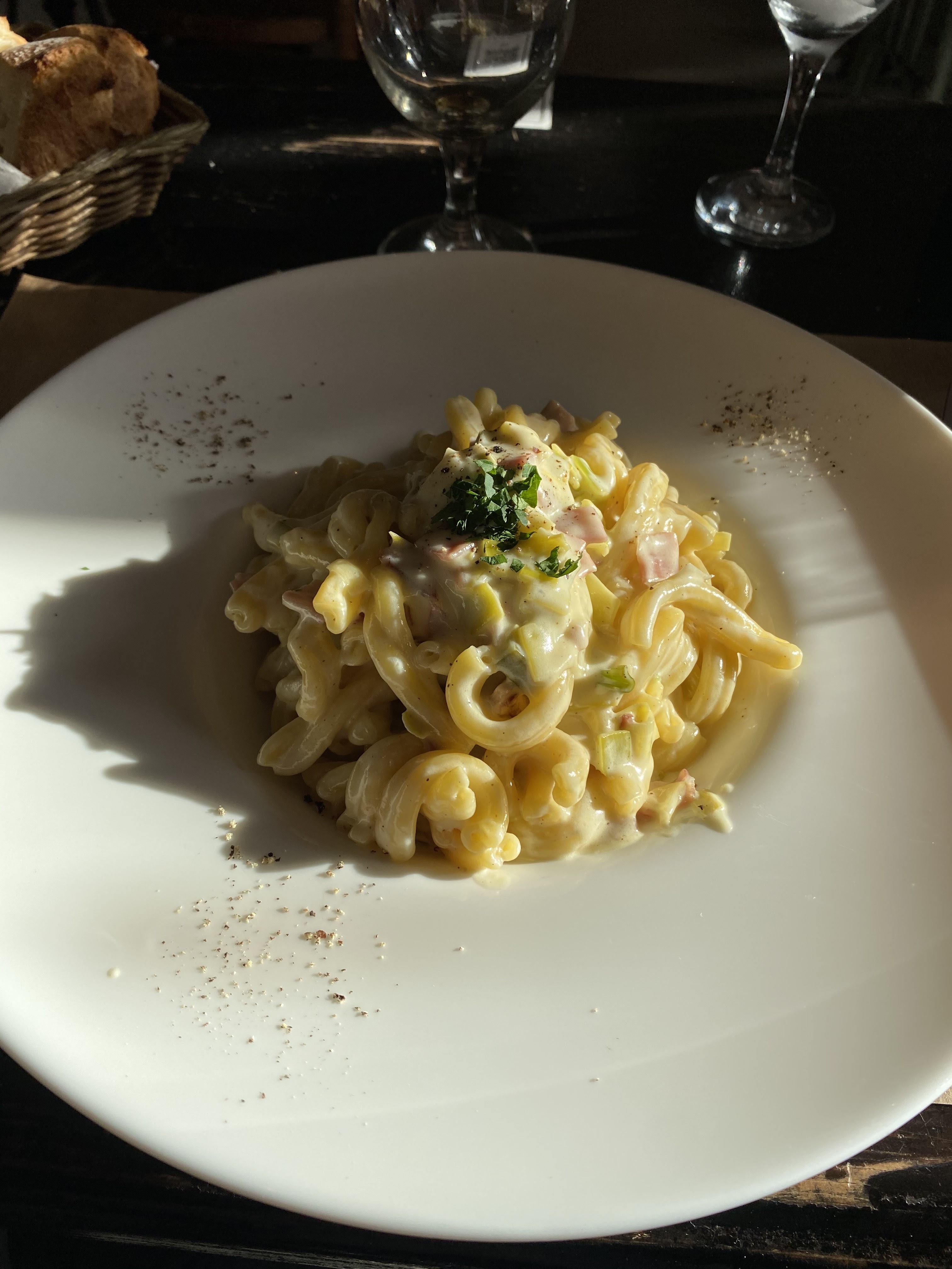 Super restaurant avec des pâtes gourmandes ! Ne vous fiez pas à l'assiette, elle est creuse, il y a ce qu'il faut pour se régaler.
