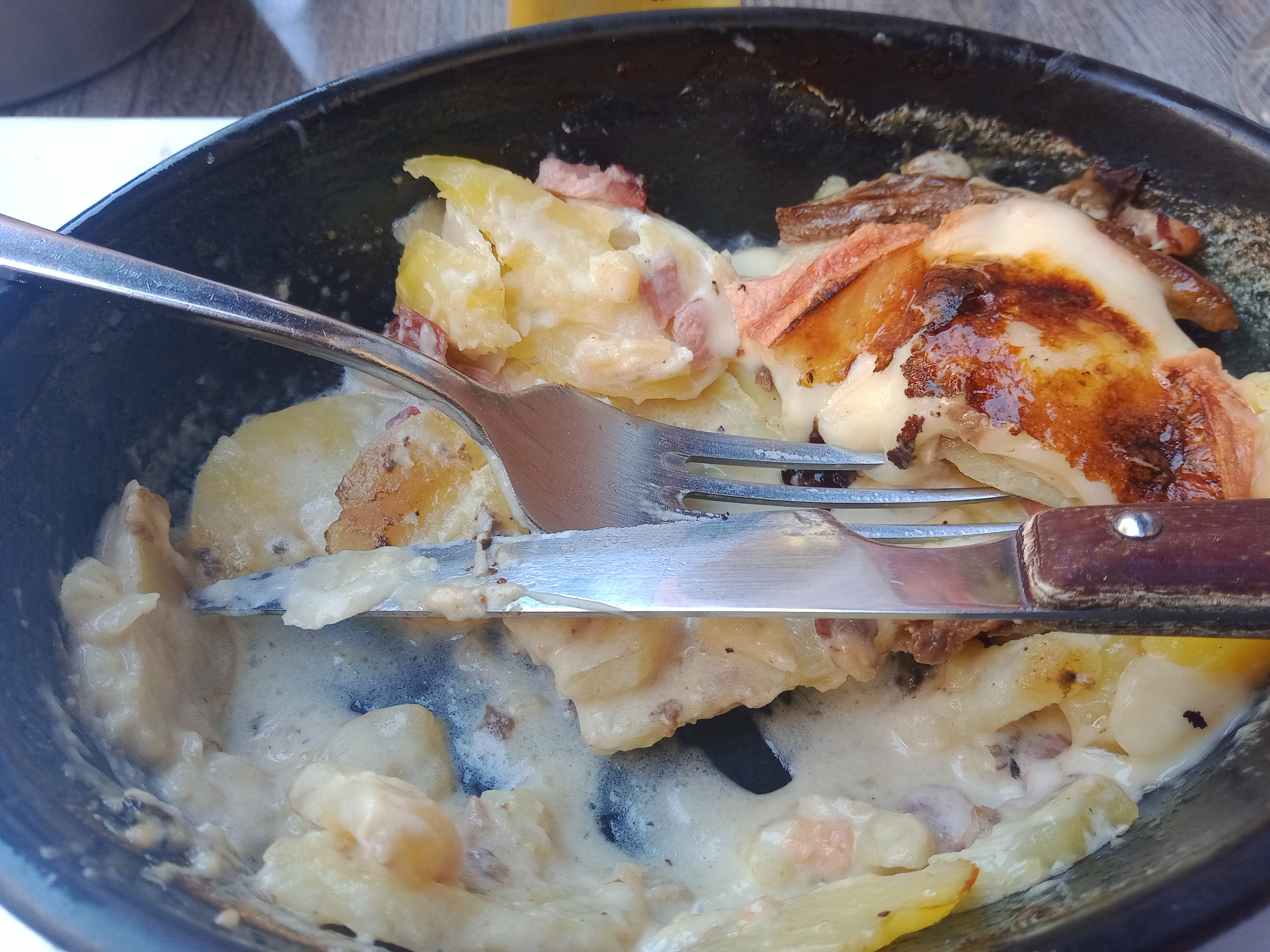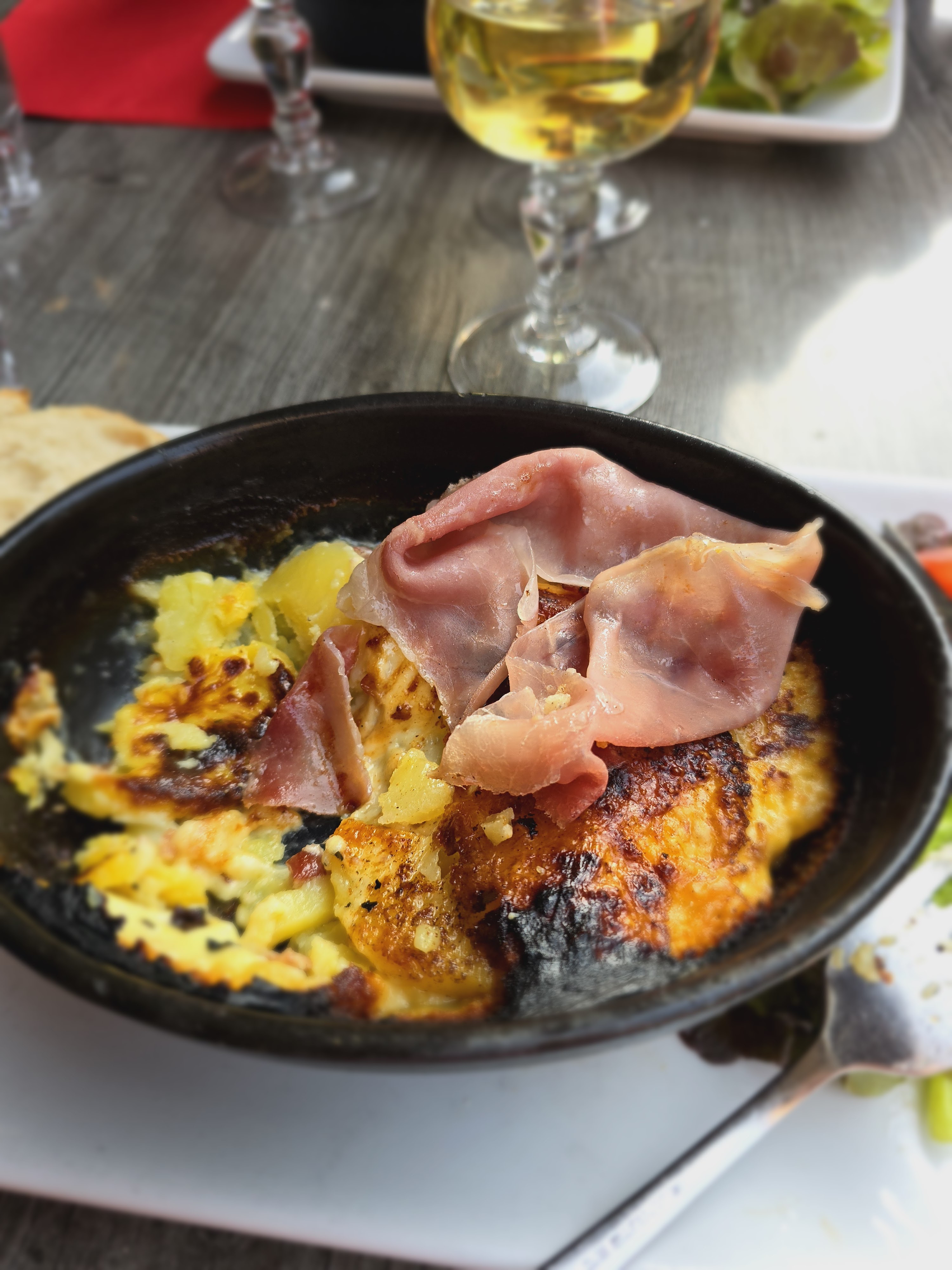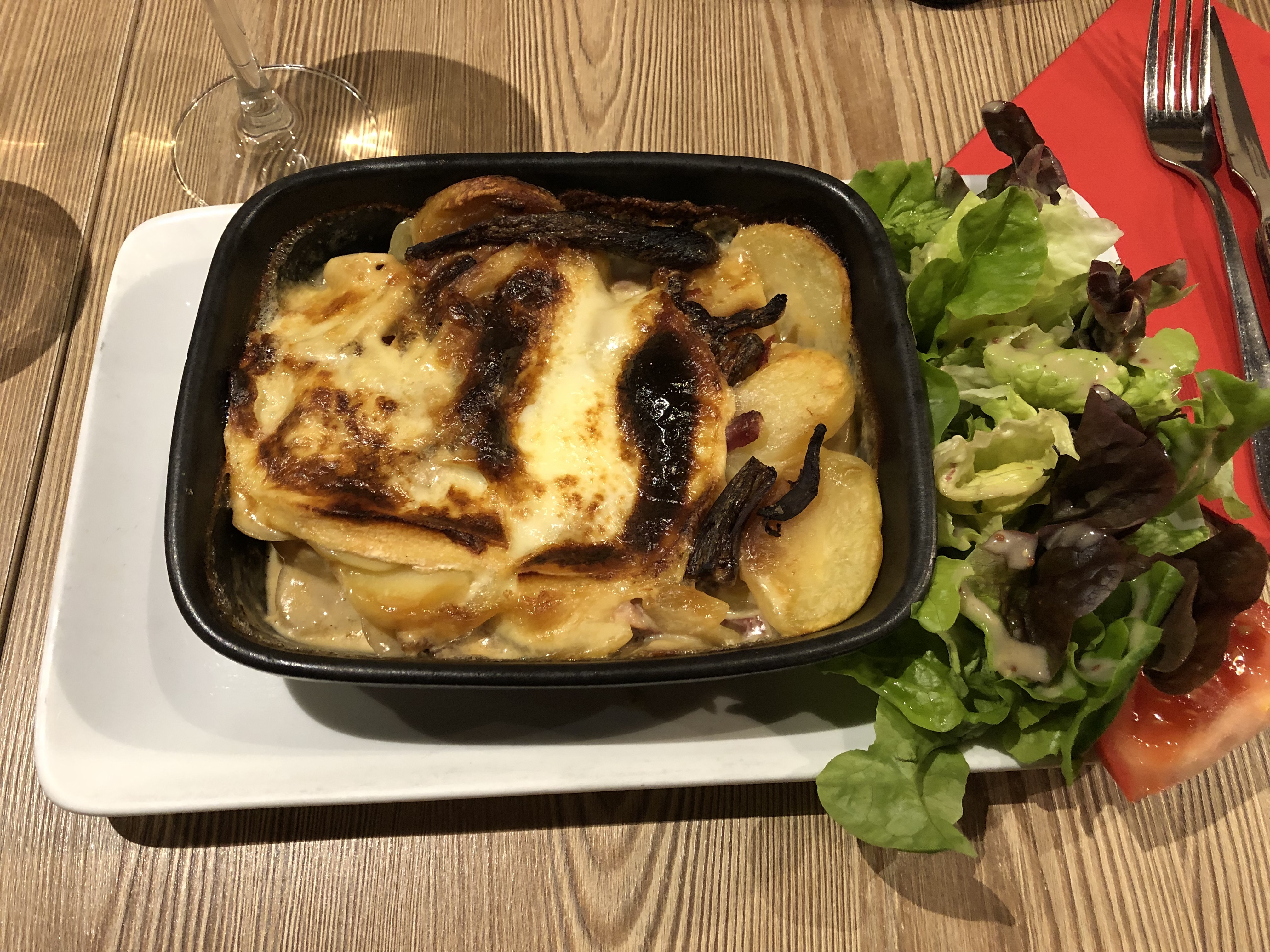 Une tartiflette avec deux petits bouts de fromage sans gout qui se battent en duel et une tonne de crème pour faire en sorte que ça ressemble un peu a une tartiflette. Aussi très cher. Un bon attrape touriste.