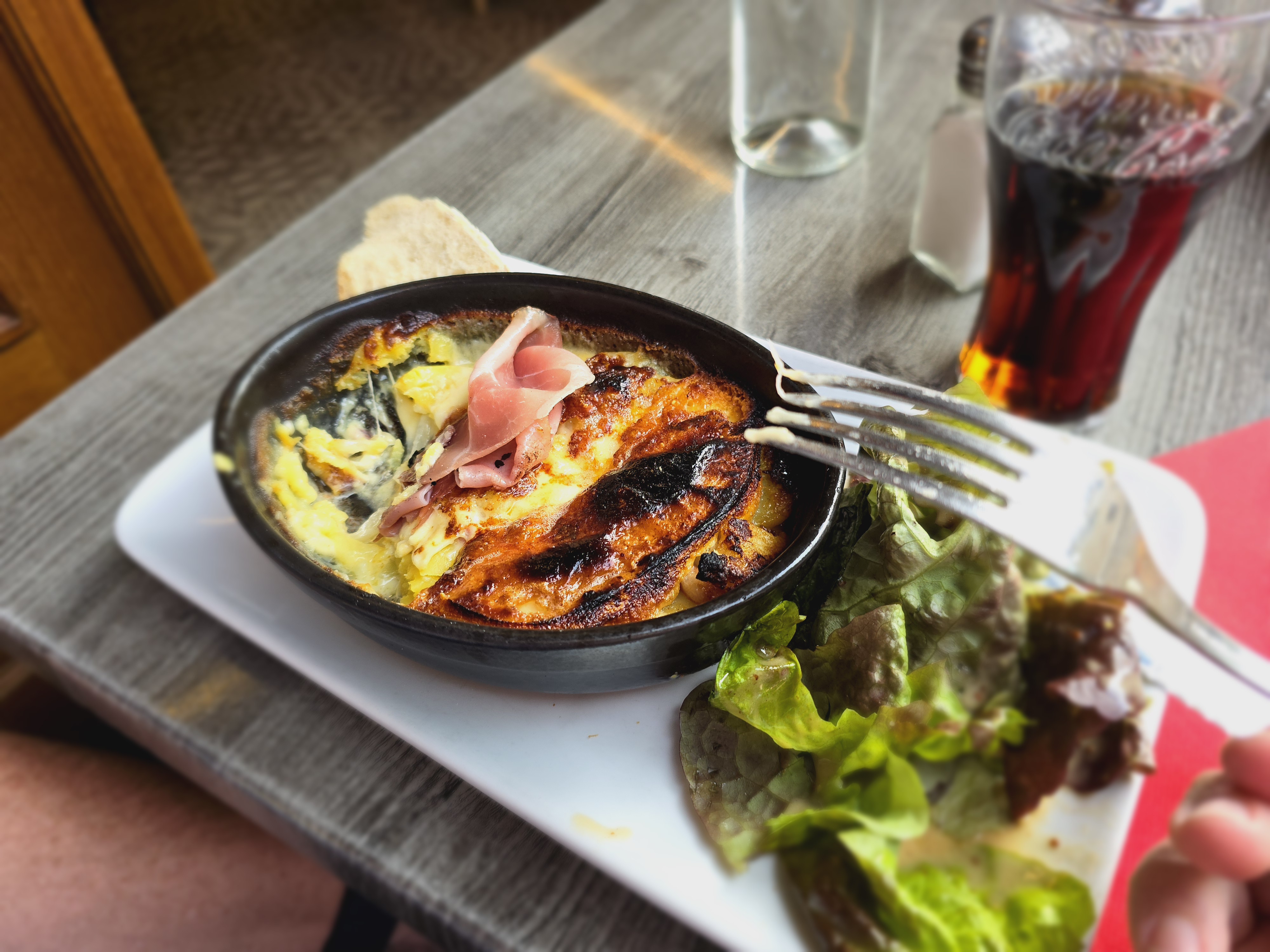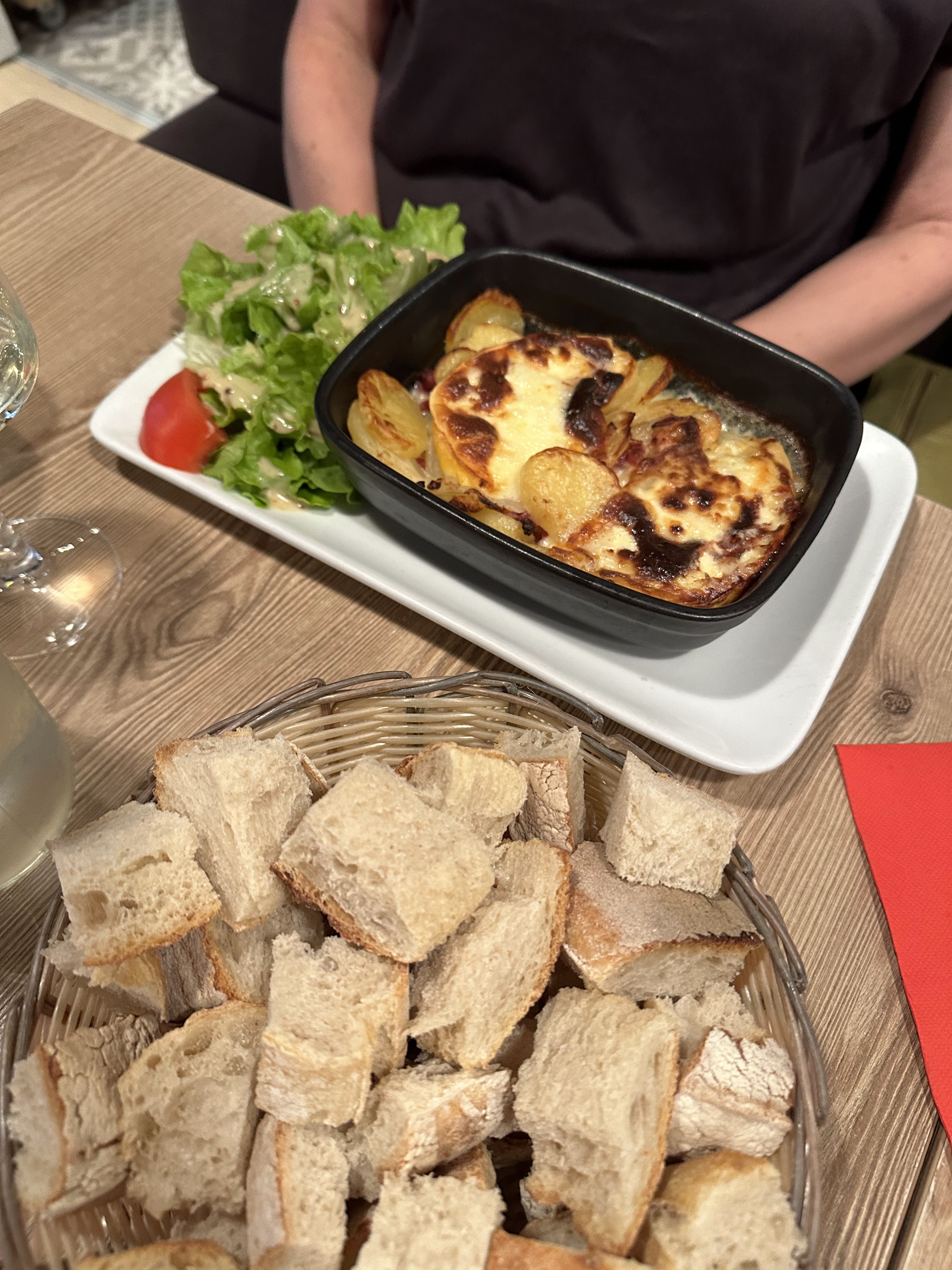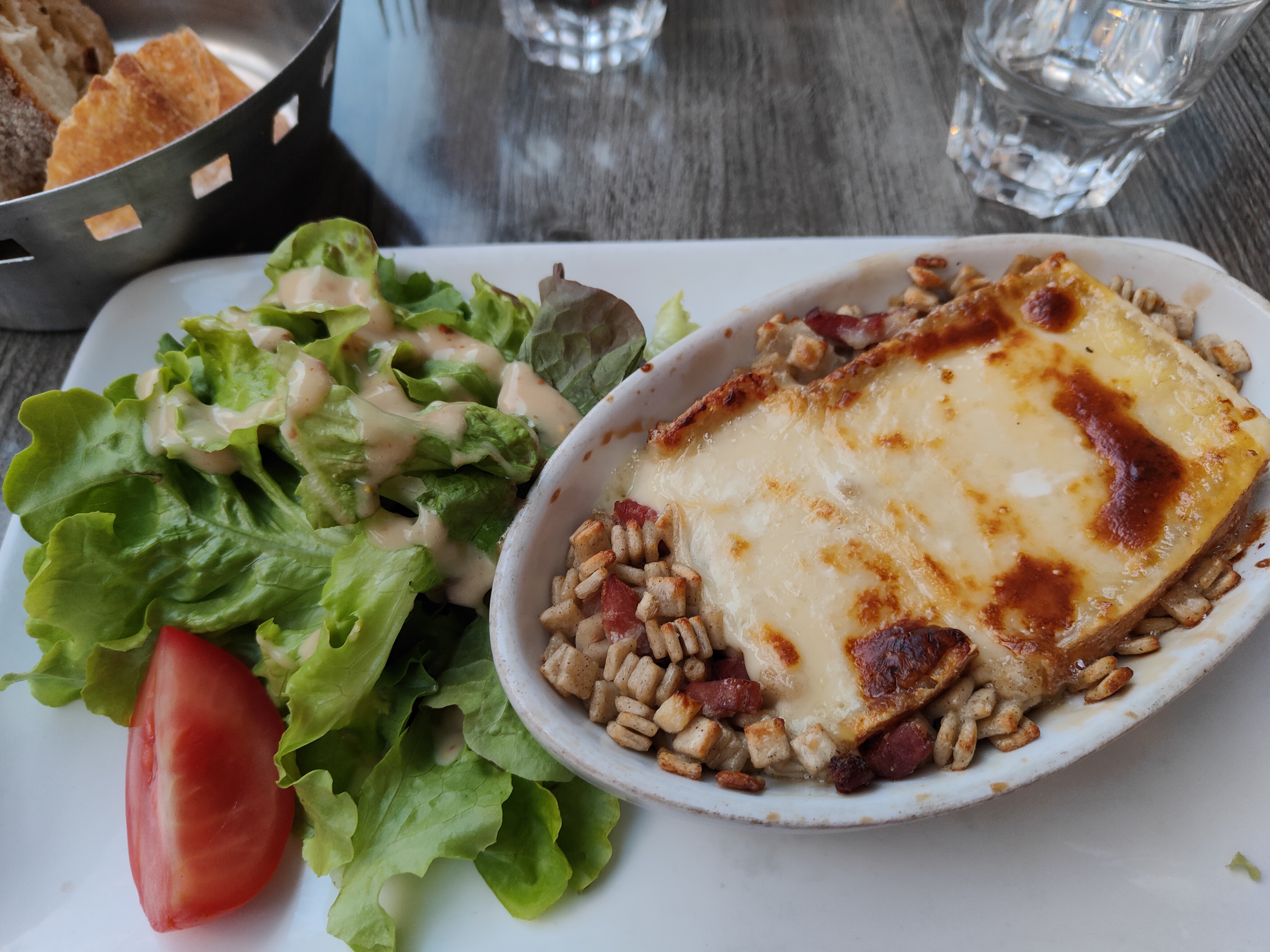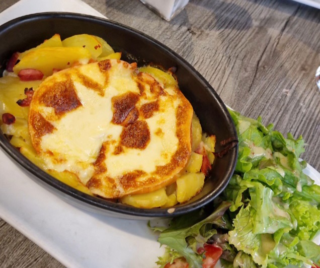 Une tartiflette avec deux petits bouts de fromage sans gout qui se battent en duel et une tonne de crème pour faire en sorte que ça ressemble un peu a une tartiflette. Aussi très cher. Un bon attrape touriste.