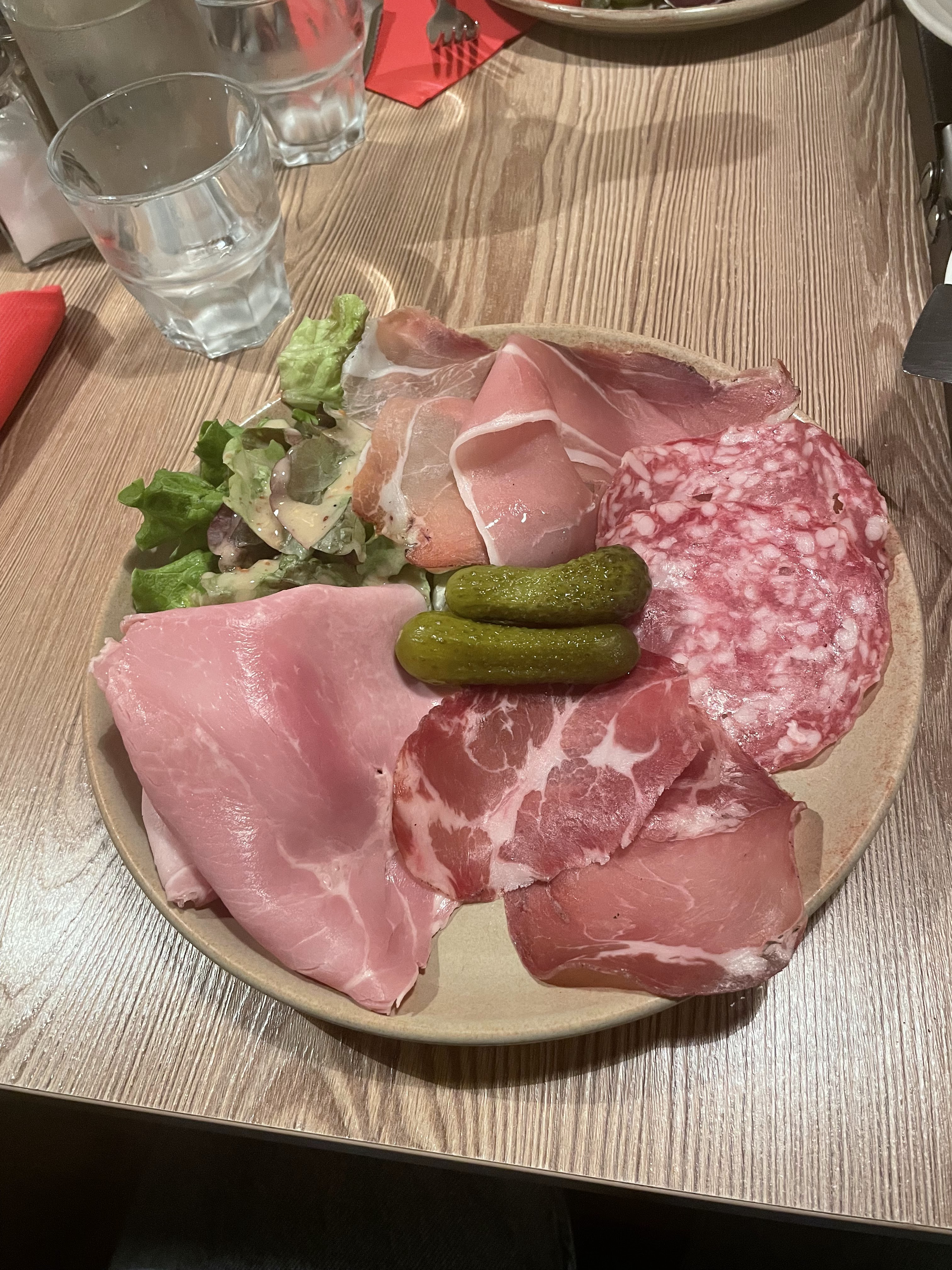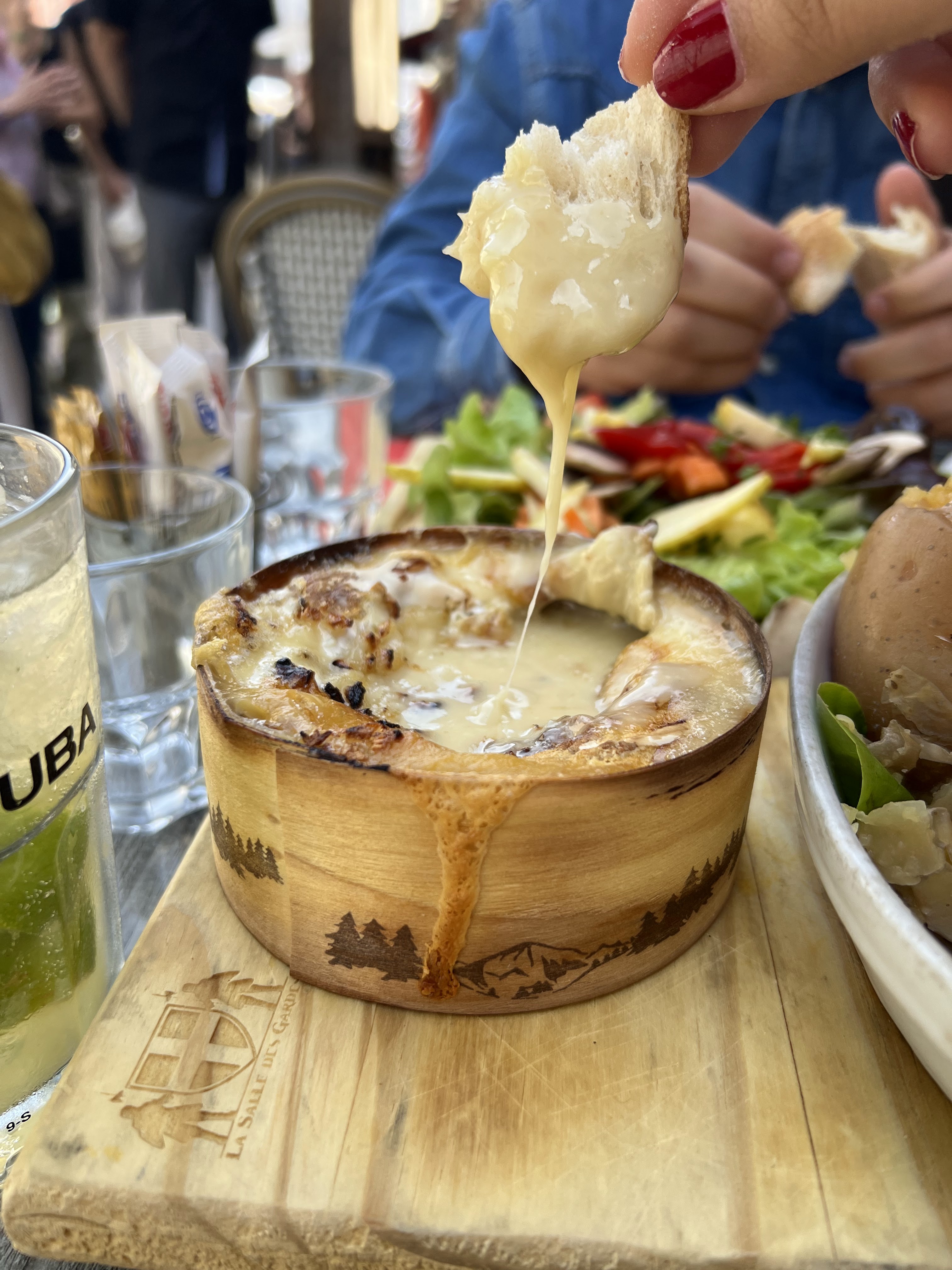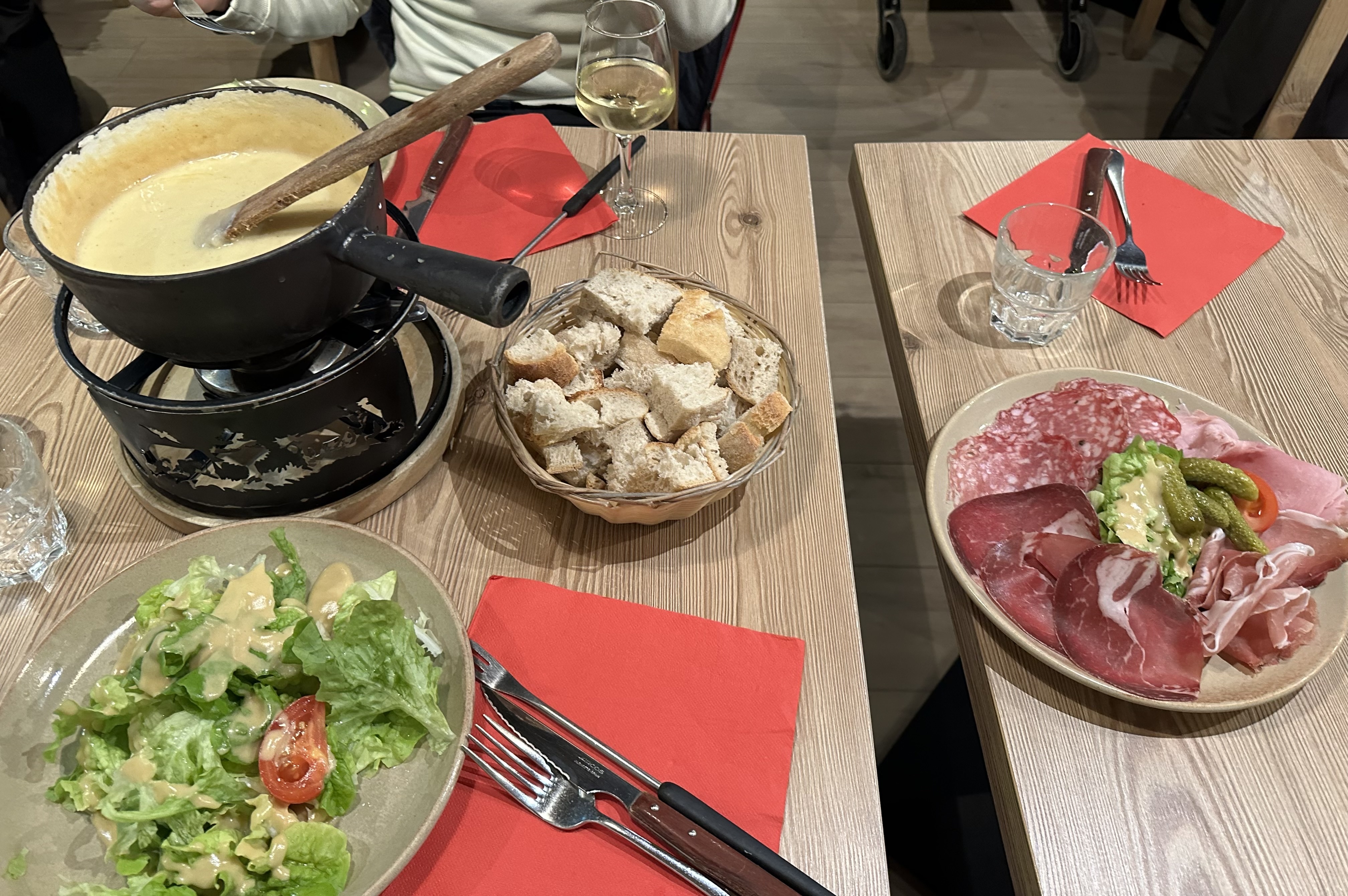 Je suis venu ici sur la base des bonnes critiques et du commentaire de quelqu'un selon lequel ils ont la meilleure fondue - c'est vrai, ils ont la meilleure fondue !! Nous avons adoré le fait que la fondue soit onctueuse et gluante, mais légèrement amère et qu'elle ait un goût complexe qui la rend peu envahissante, même après avoir terminé toute la casserole. Il faut ajouter l'assiette de charcuterie, et je ne sais pas si c'est un blasphème de faire ce que nous avons fait, mais essayez de tremper le prosciutto dans la fondue ; c'est tellement paradisiaque ! C'était aussi une belle surprise qu'ils offrent une énorme assiette de salade dans le cadre de l'ensemble, pour que vous ne vous sentiez pas aussi coupable avec le repas 🥲 Aussi un appel spécial à la serveuse qui nous a si bien servi. Elle était sympathique, attentive et répondait à nos besoins avant même que nous les demandions. Certainement l’une des serveuses les plus agréables et assidues que nous ayons rencontrées en France !