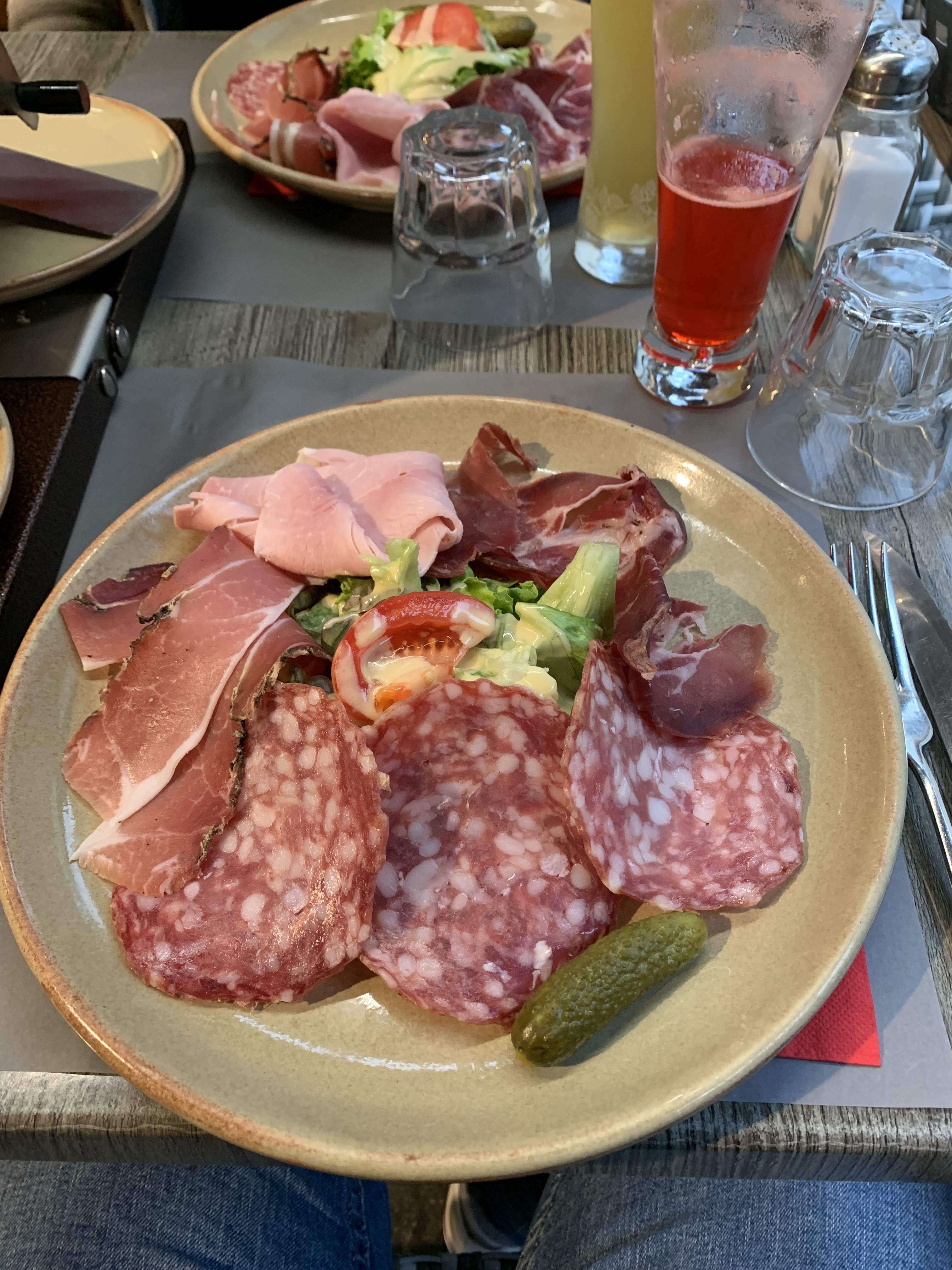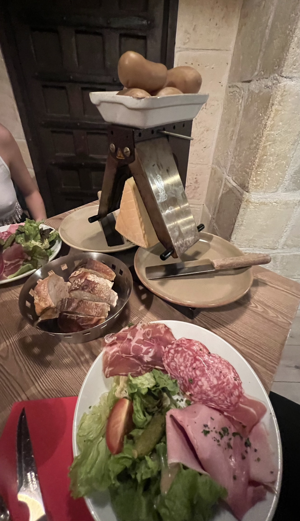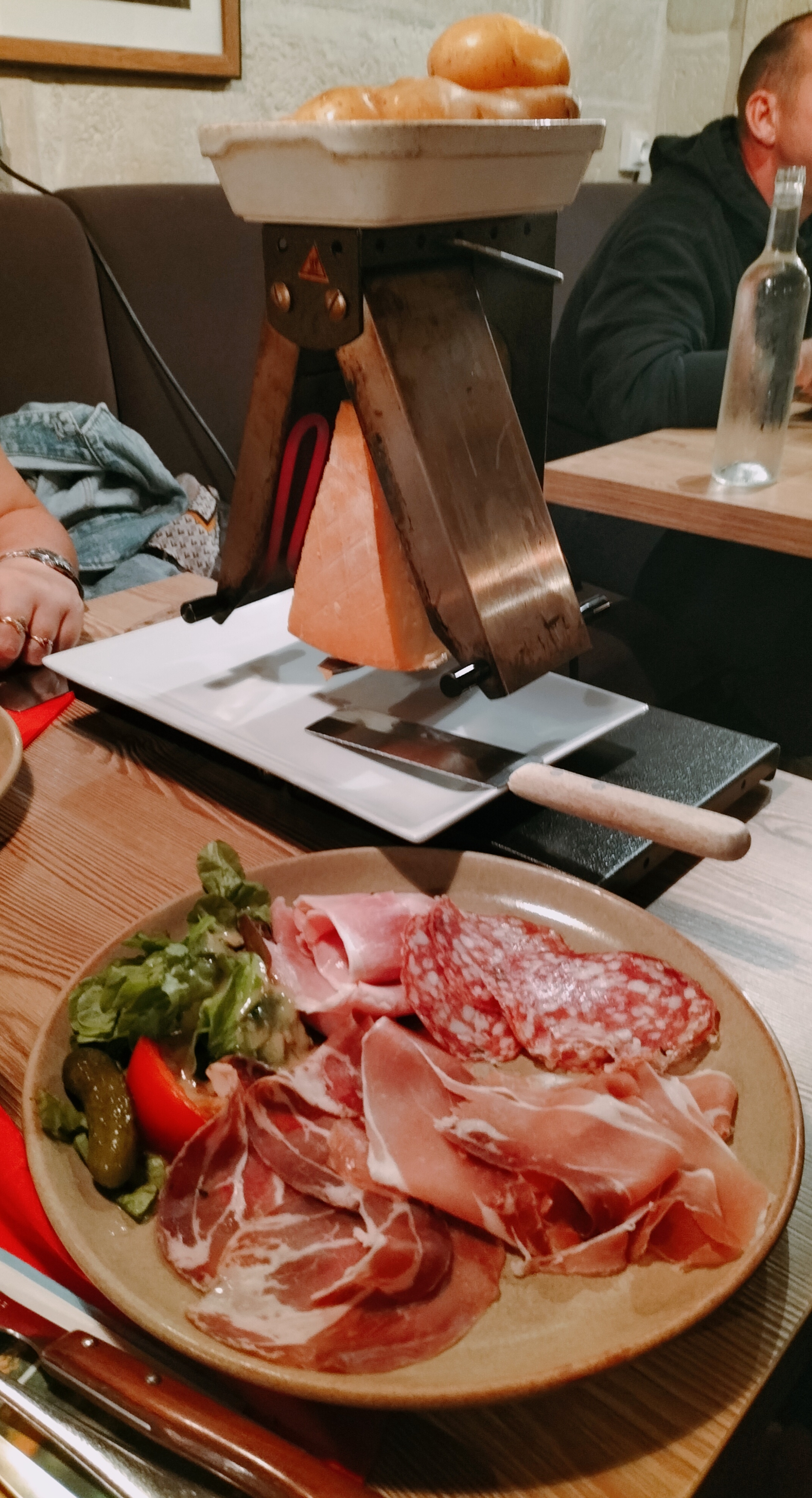Situé dans un endroit magnifique, pittoresque mais pas très fréquenté de la vieille ville d'Annecy, nous avons apprécié de nous asseoir dehors. Nous avons commandé de la raclette pour deux et elle était servie avec de généreuses charcuteries, cornichons, pommes de terre, pain et salade. Nos serveurs étaient sympathiques et ont répondu à nos questions.