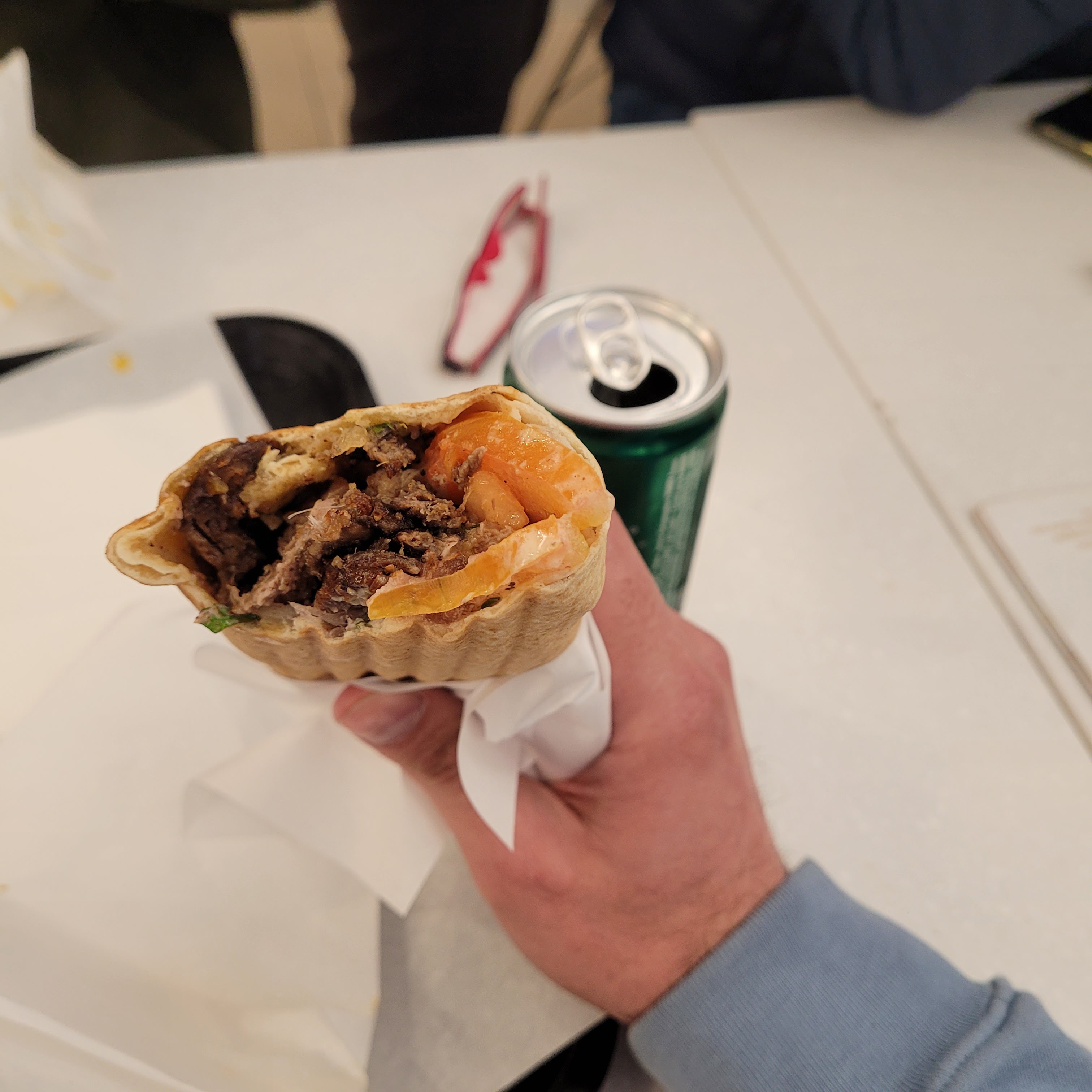 Sandwich falafel acceptable. Il faut acheter une boisson pour pouvoir manger dedans (ce qui on ne savait pas avant de payer, vu que ce n'était écrit nulle part).