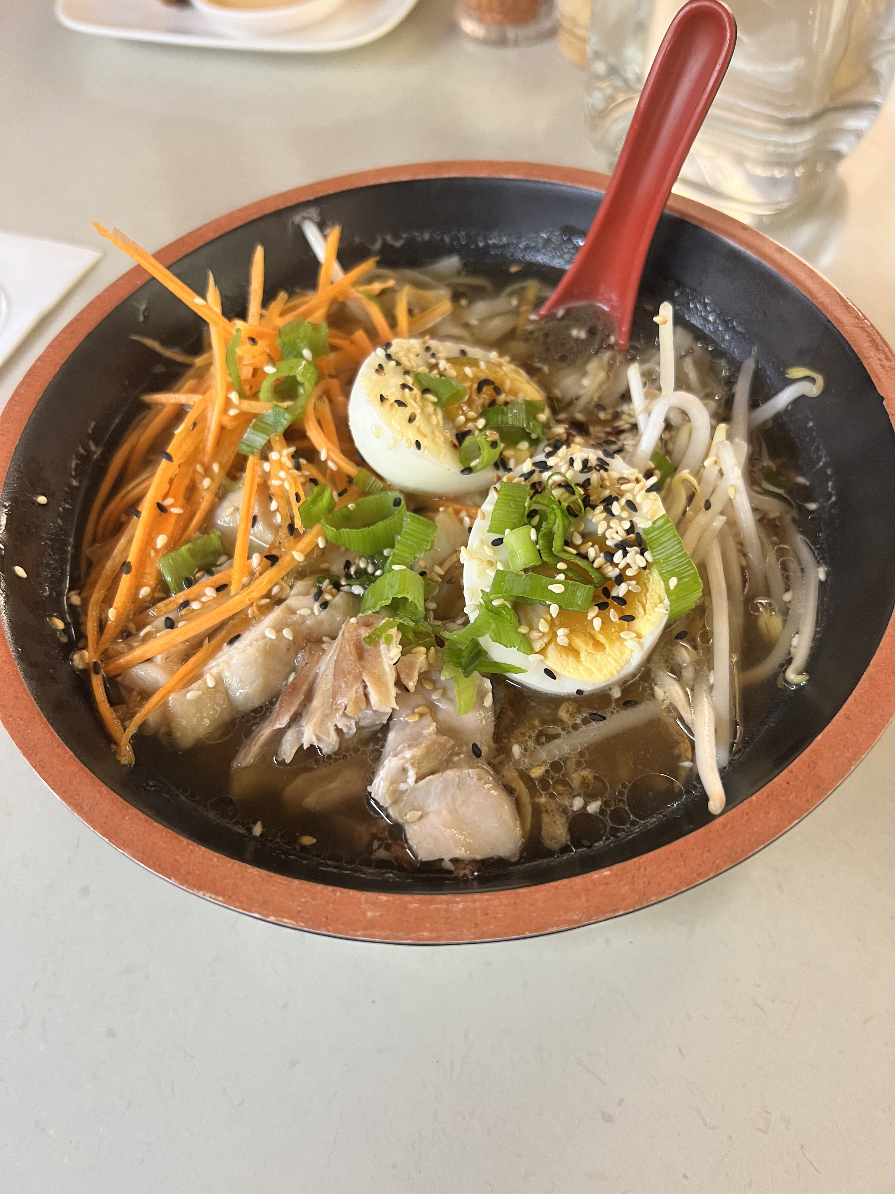 Le lieu est atypique et le service rapide. La cuisine est bonne MAIS j’ai pris un bol de ramen au poulet et j’ai trouvé le poulet très fort au goût et plein de graisse. Je me suis même posé la question quant à la fraîcheur de la viande. Du coup , je l’aurais préféré végétarien (pas sur la carte dommage) car à part le poulet , tout était bon.