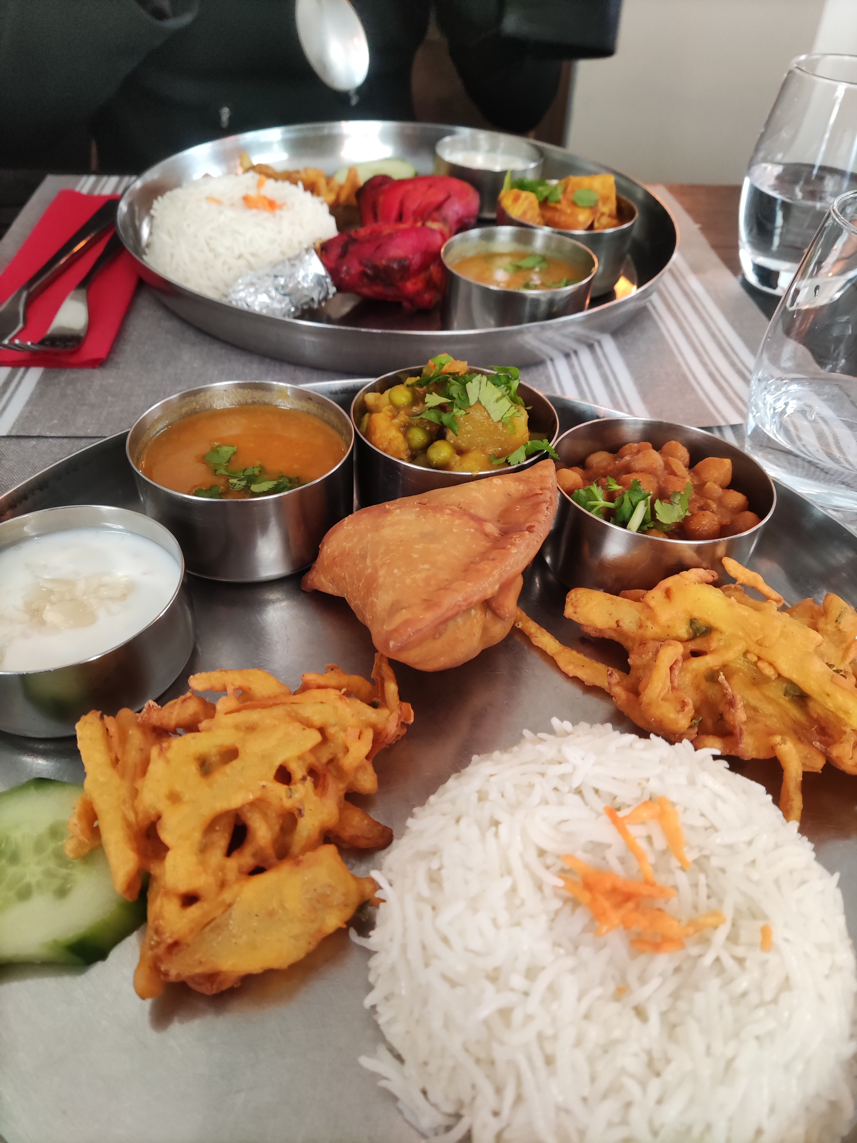 Nous nous sommes arrêtés ici pour déjeuner, c'est un restaurant népalais mais la nourriture était similaire à la cuisine indienne. Nous avons discuté de légumes thali et de samosa. La nourriture n'était pas épicée du tout mais je l'aime épicée. J'ai demandé de la sauce épicée et le serveur a eu la sauce masala qui était un excellent accompagnement. Dans l'ensemble, ambiance, présentation et service agréables.