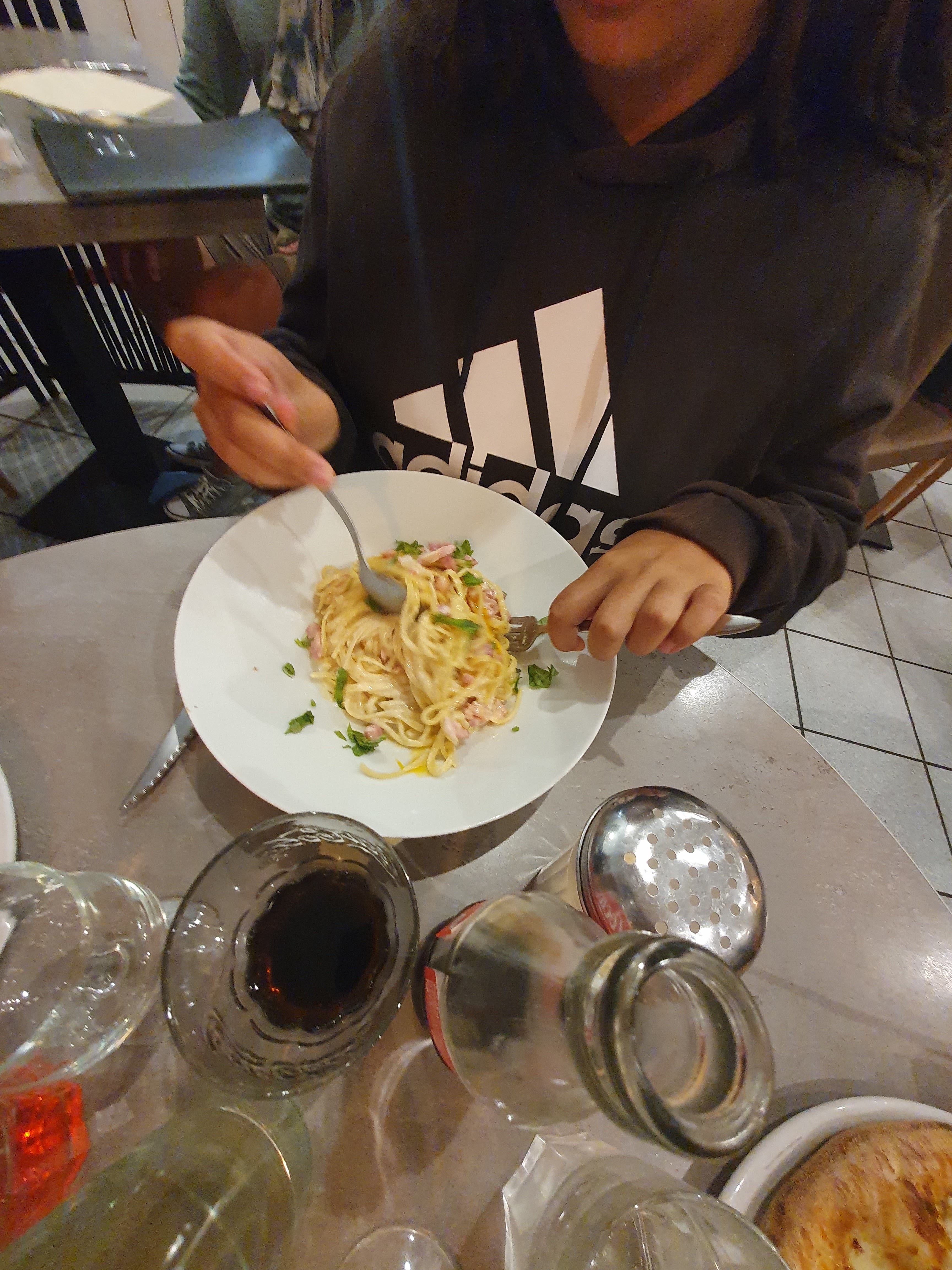 Un serveur un peu gonflé qui nous fait la remarque : « doucement avec le parmesan, le flacon est presque vide ! « c’est très gênant sachant qu’on n’en abusait pas plus que ça, d’autant plus que cela permettait de relever le goût de sa sauce tomate des spaghettis au goût insipide et aigre. Enfin pour terminer le repas, nous demandons deux cafés serrés, on nous apporte deux cafés rallongés, de provenance douteuse. Inadmissible pour un restaurant italien de ne pas être capable de servir ses clients de manière respectable et des cafés de qualités, ce n’est pas ce qui manque !