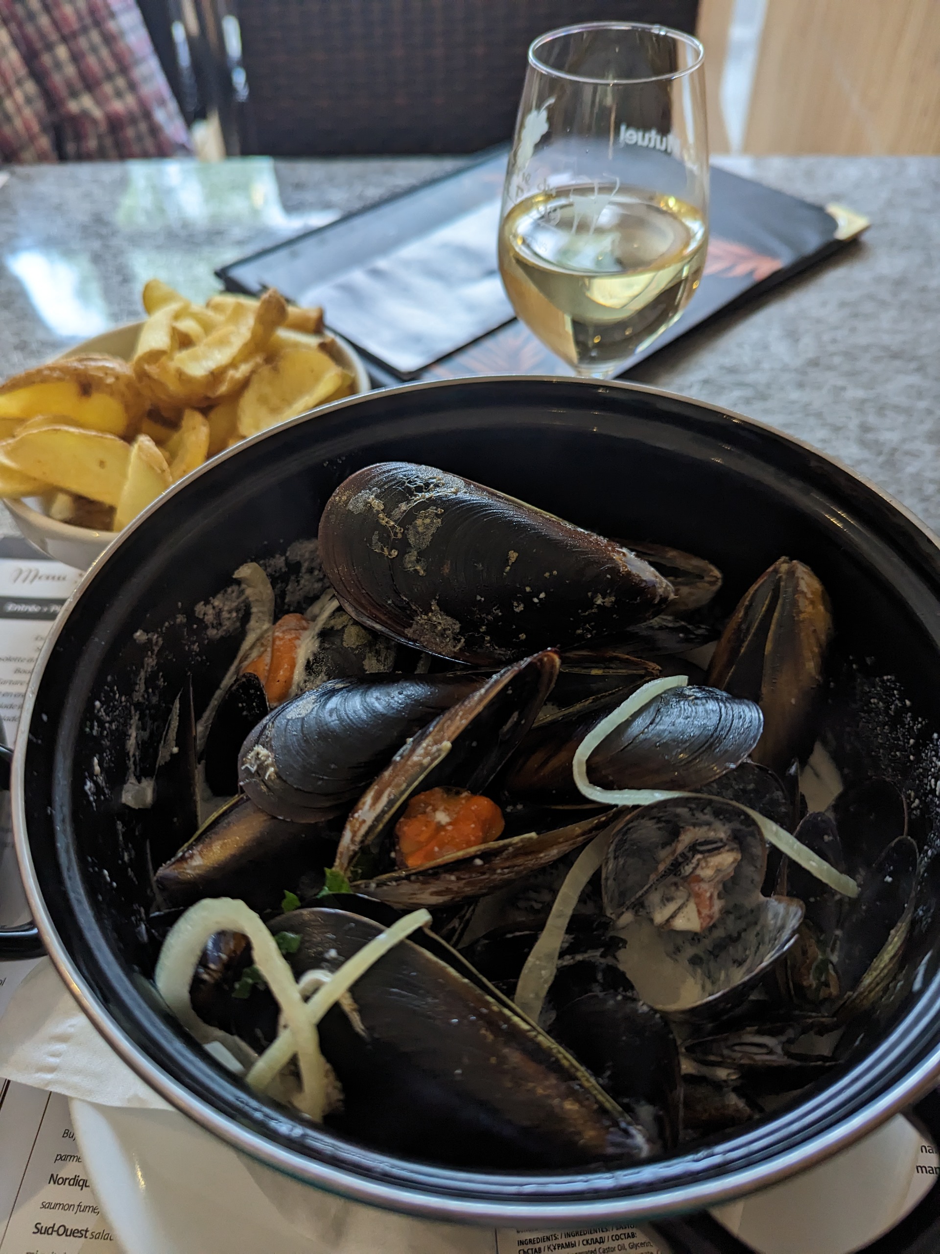 Assez déçue. Ils ont des moules à la carte toute l’année, j’ai donc appelé pour réserver et savoir s’ils elles ne sont pas trop petites. L’ayant déjà fait dans d’autres restaurants, la question est assez simple mais nous n’avons pas eu de réponse précise. J’ai parlé à un responsable qui me disait que le calibre n’était pas écrit… la seule réponse qu’on a eu pour finalement se retrouver devant des moules minuscules. J’aurai préféré la transparence de leur part et savoir à quoi m’attendre. Bref, pas mauvais mais déçue de ce manque de transparence. Frites surgelées et en ce qui concerne le dessert, un tiramisu aux fruits rouges, pas très convaincant non plus. Prix raisonnable.