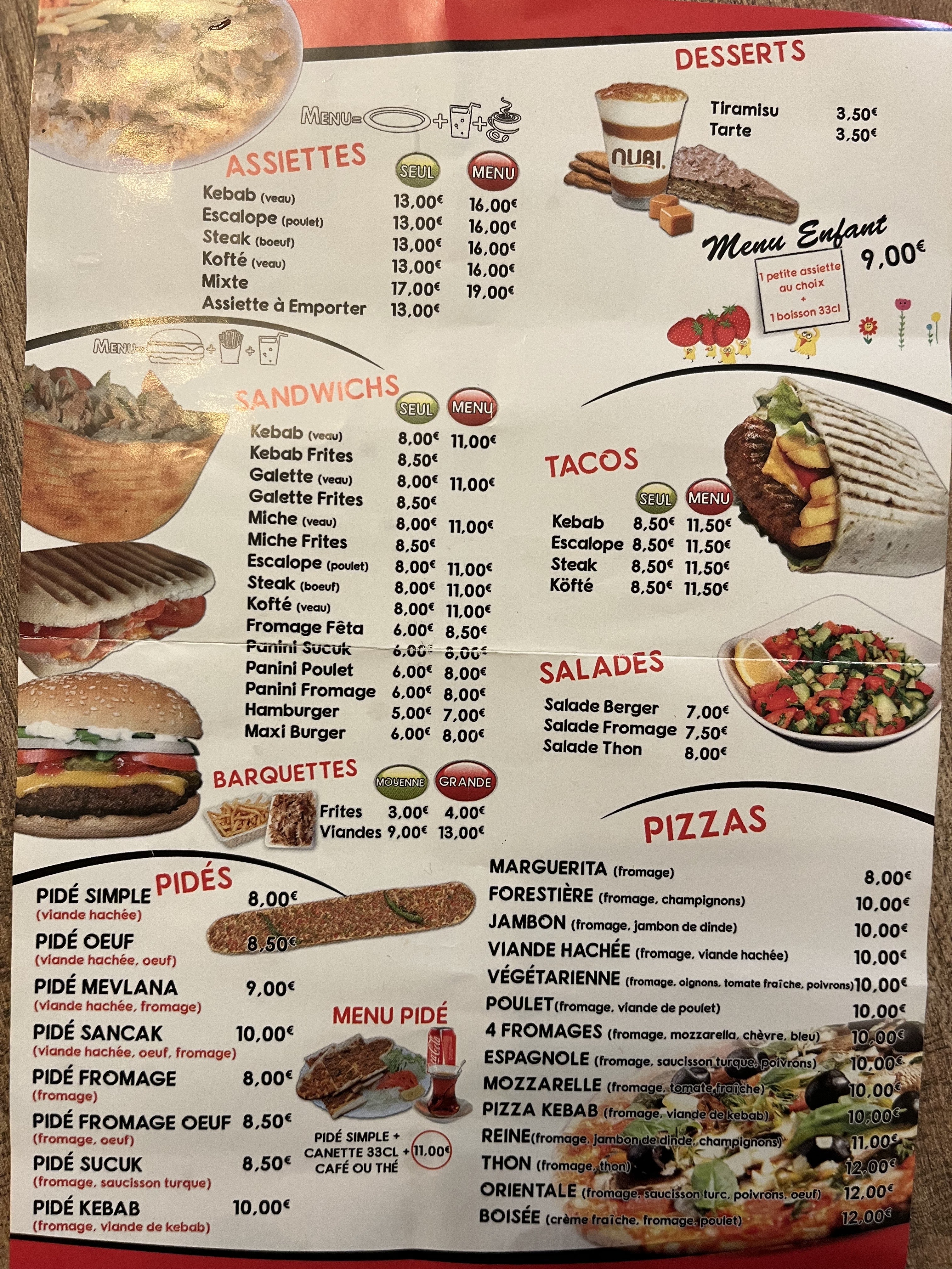 On peut y manger Pide, Kebab (assiette ou sandwich), Panini... les restaurateurs sont très sympas et la nourriture est bonne. Je recommande 👌
