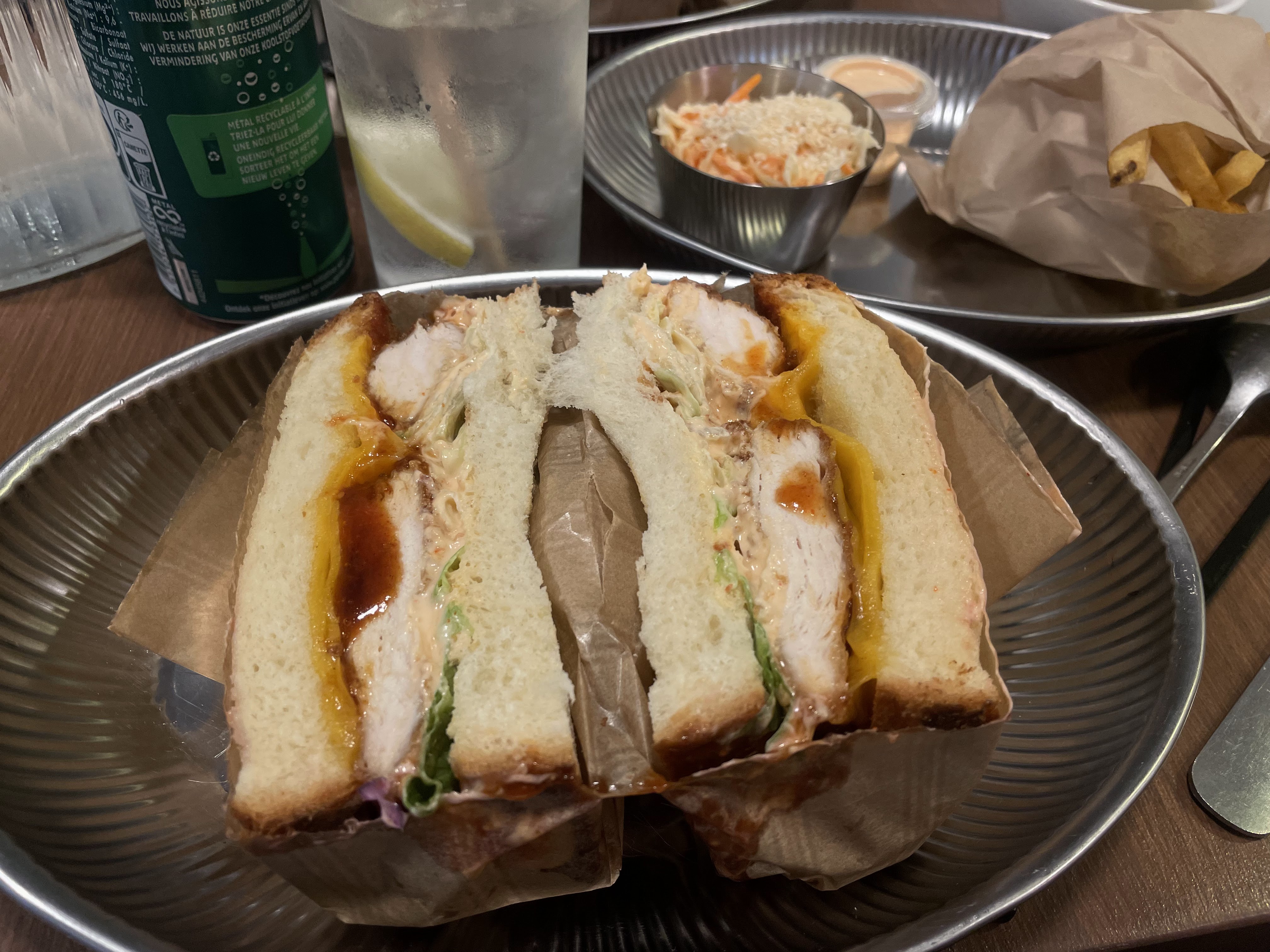 Toujours voulu tester sando club et finalement j’ai eu la chance d’y aller. Alors contrairement aux autres commentaires je trouve que le service est cool et friendly. On a prit les premiers sando du menu, le tori-kastu et le cheesy. Le choix se fait vite et le cheesy le remporte.
