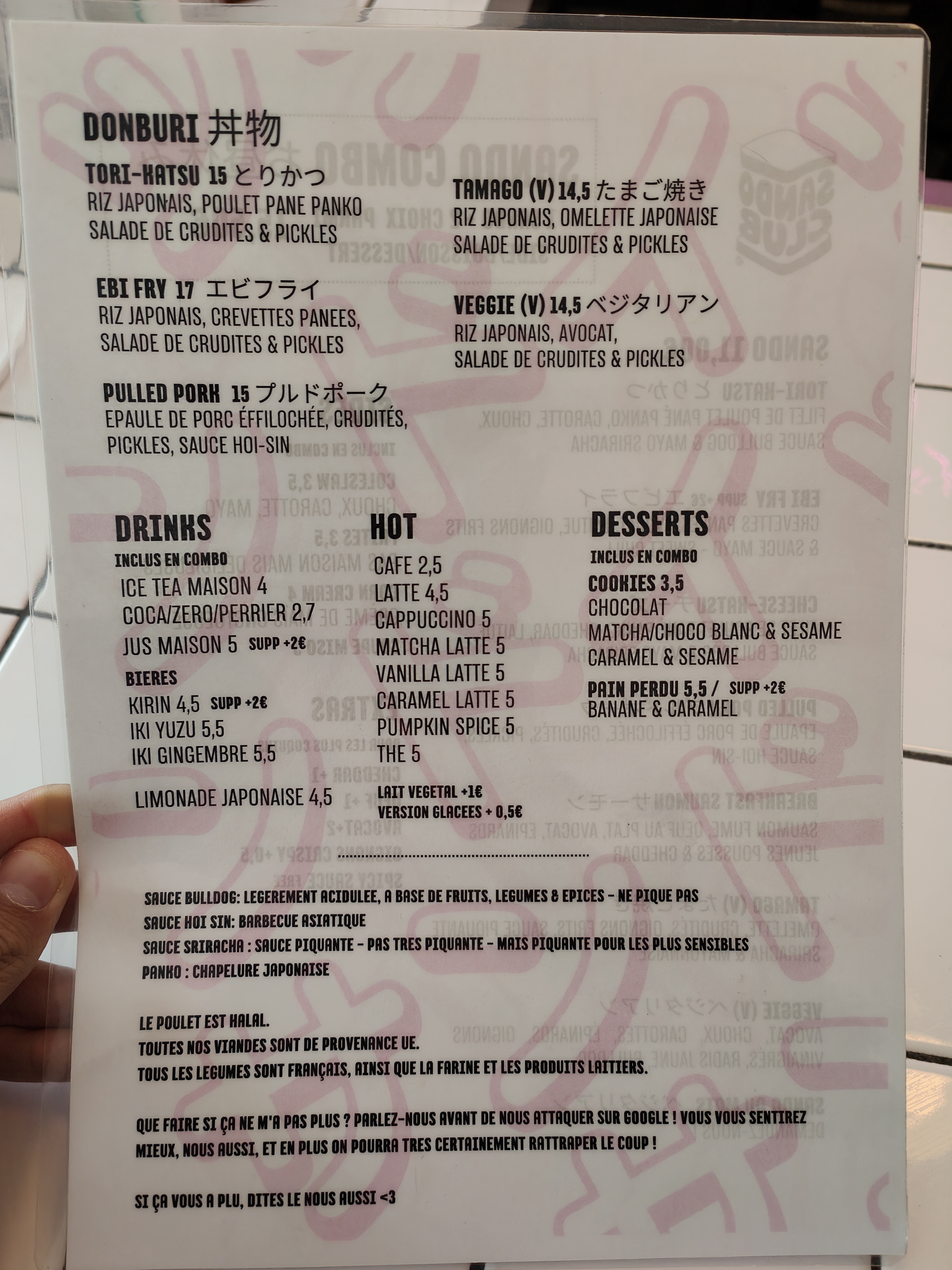 Un accueil super sympa et jovial. Une offre plutôt large avec différent type de sandwich d’inspiration japonaise. C’est bon j’aurais payé un poil moins cher mais je pourrais y retourner !