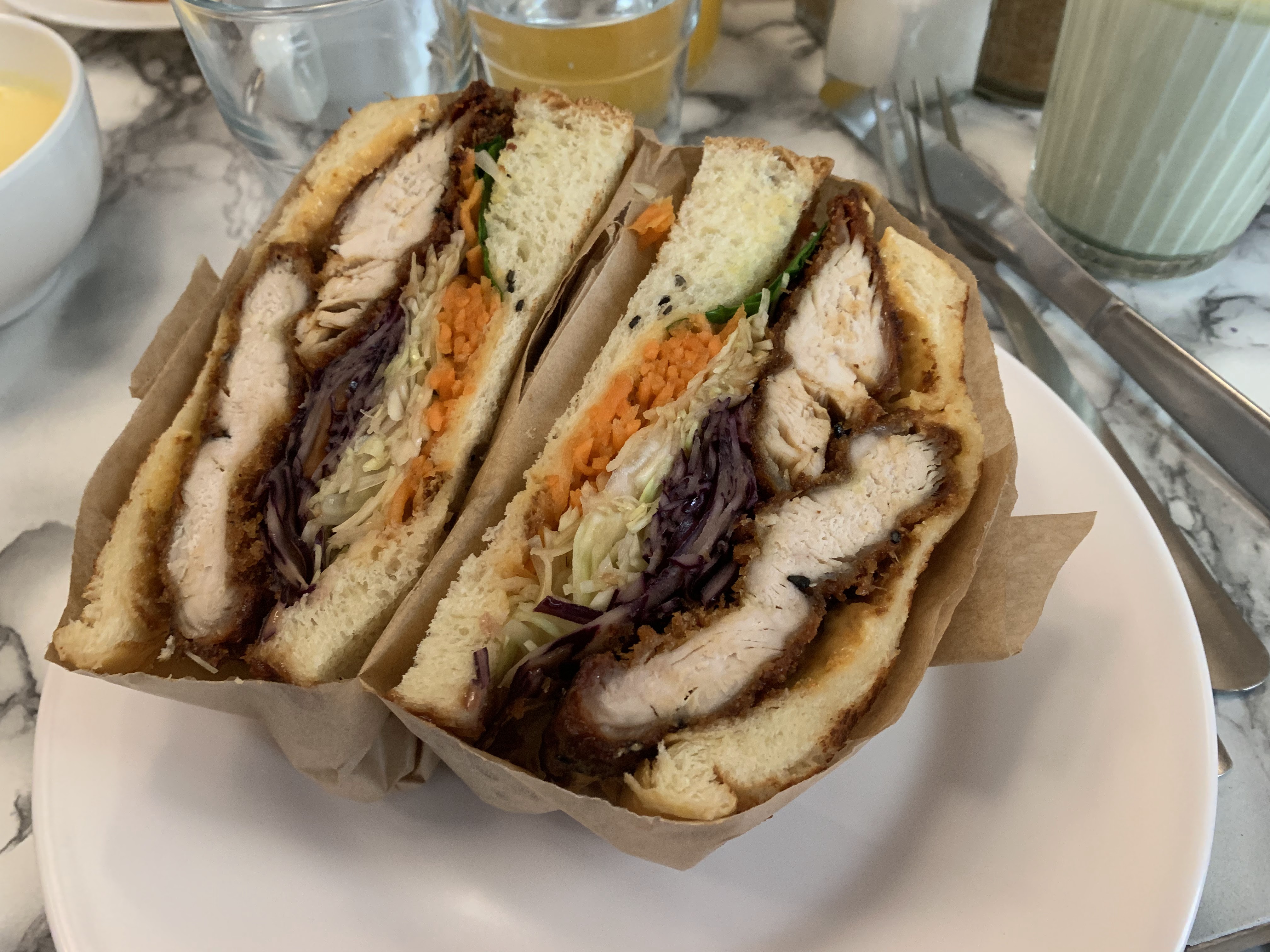 Super sandwich à la « Jap » mention spéciale pour le Panko fried chicken et le pain de mie brioche fait maison . Cantine agréable et stylée