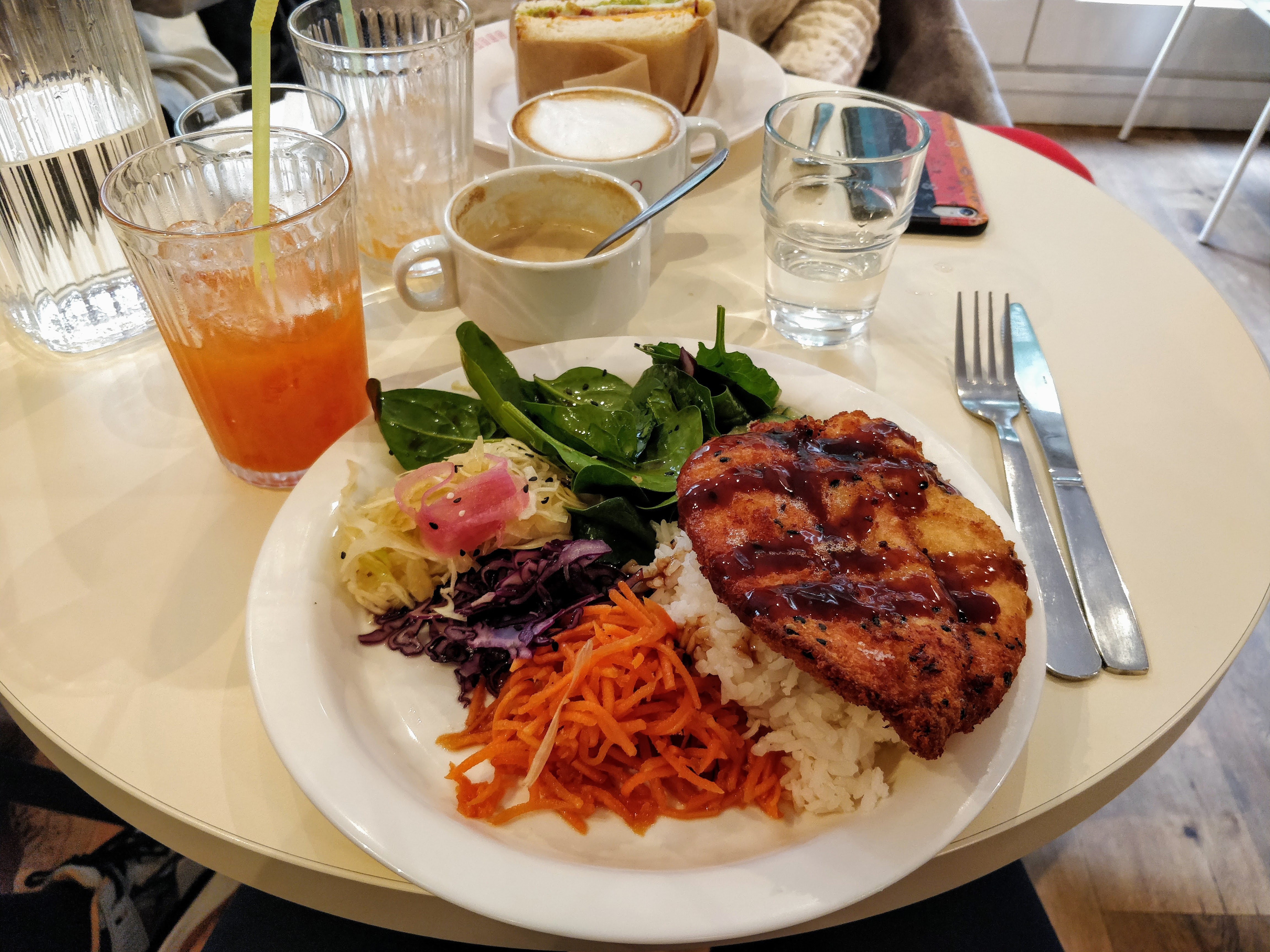 Délicieux! Tarification appropriée. Goût incroyable. Le pain est vraiment moelleux donc tout le croquant vient de l'intérieur. le combi chaud et froid de légumes et de poulet (torikatsu). C'est léger mais juste ce qu'il faut pour terminer par une petite gourmandise + café. Je recommande vivement le jus du jour, le mien était de carotte, gingembre, pomme, fruits frais bien sûr. Toutes les vitamines dont vous avez besoin. Ps. Le poulet est halal pour tous ceux qui ont besoin d'informations