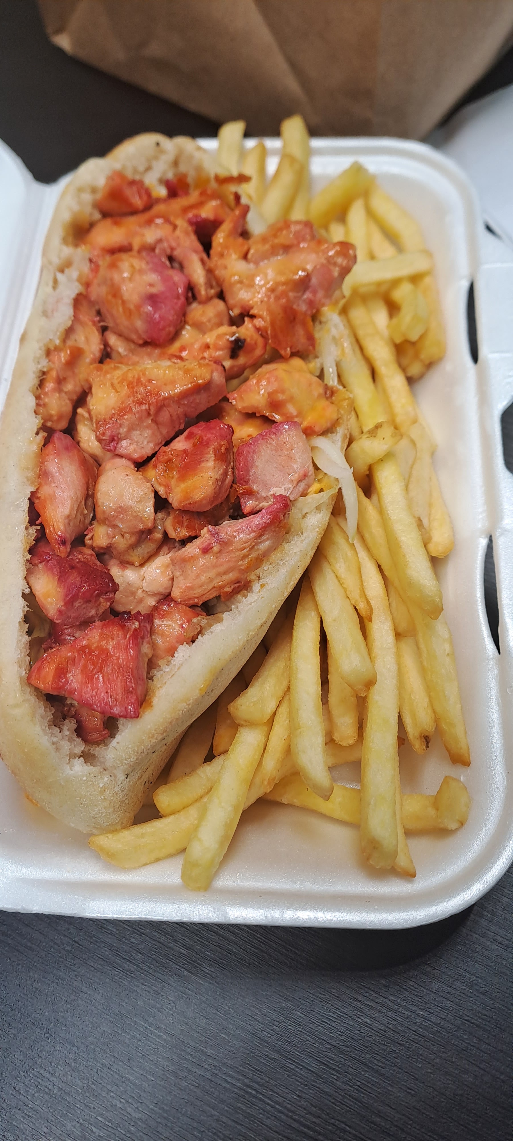 Kebab avec des frites en rouleau comme un hod dog, mais en plus gros. Viande très bien préparée, et portion très importante, je le recommande