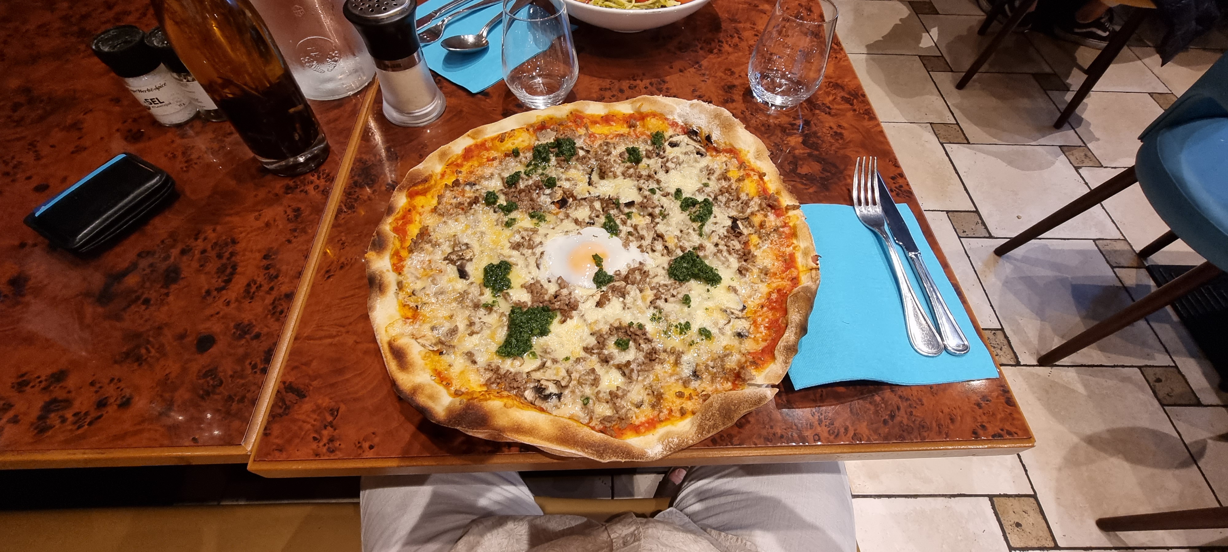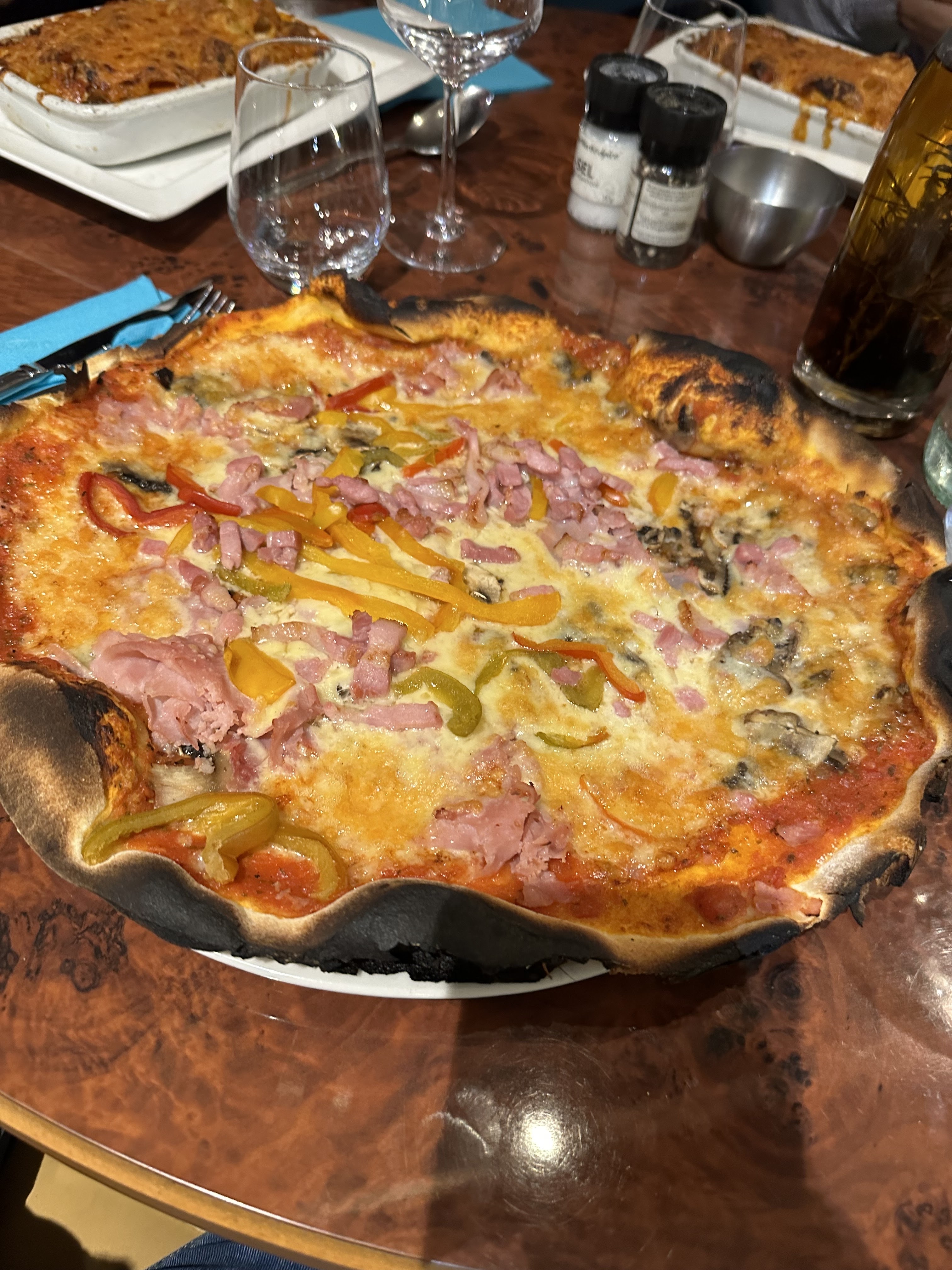 Nous nous y serons rendus demain plusieurs fois mais cette fois un désastre. Ils ont du changé de cuisinier et de pizzaiolo. La pizza cannibale était sèche et la viande hachée blanche. Aucun goût. Malgré ma surprise de voir la couleur blanche le serveur a été demandé au cuisinier si c’était bien du bœuf ! Aucun goût. Peut être était ce du gras. Escalope à la crème, pas terrible. Sèche aussi et vu la quantité de sauce j’ai du en redemander. Elle est arrivée froide. Aucune carafe d’eau ne nous été donné. Bref pas terrible ! Piége à touristes