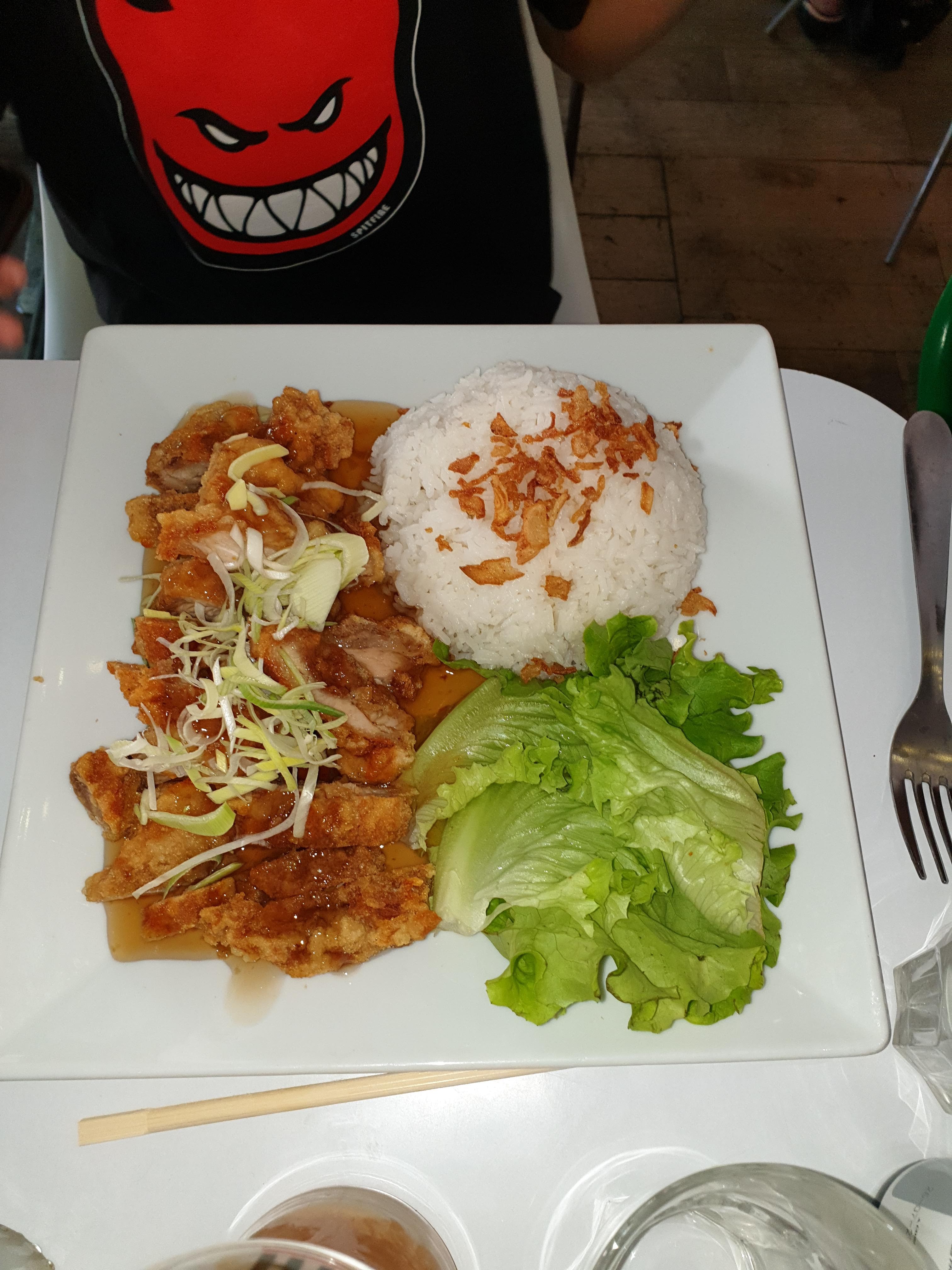 Poulet « croustillant » qui ne croustille pas et qui baigne dans la sauce. Alors oui la sauce parlons en tient, la sauce « caramel » coupée à l’eau et pas du tout nappante. De l’eau dans le fond de l’assiette. Pas vraiment de goût, je recommande vraiment pas cette adresse. Sinon le lieu est plus sympa, serveur cool et service rapide mais bon, je suis déçu je ne recommande pas