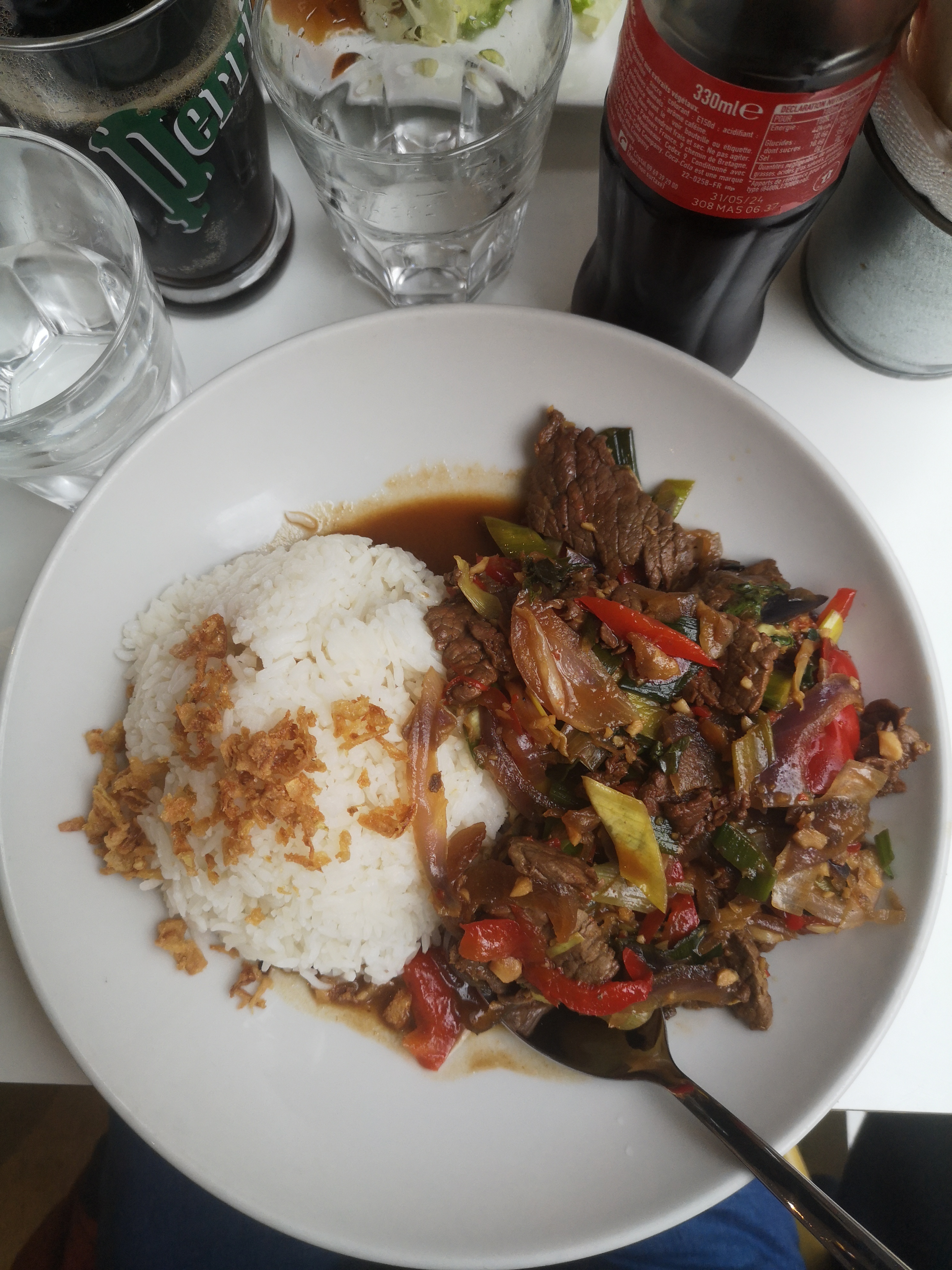 Une cuisine asiatique comme on aime. J’ai ma préférence pour le bœuf basilic (thao baï je crois ??). Il n’est pas très épicé et je le recommande même si vous n’aimez pas trop ce qui pique. Service un peu long ce samedi midi.