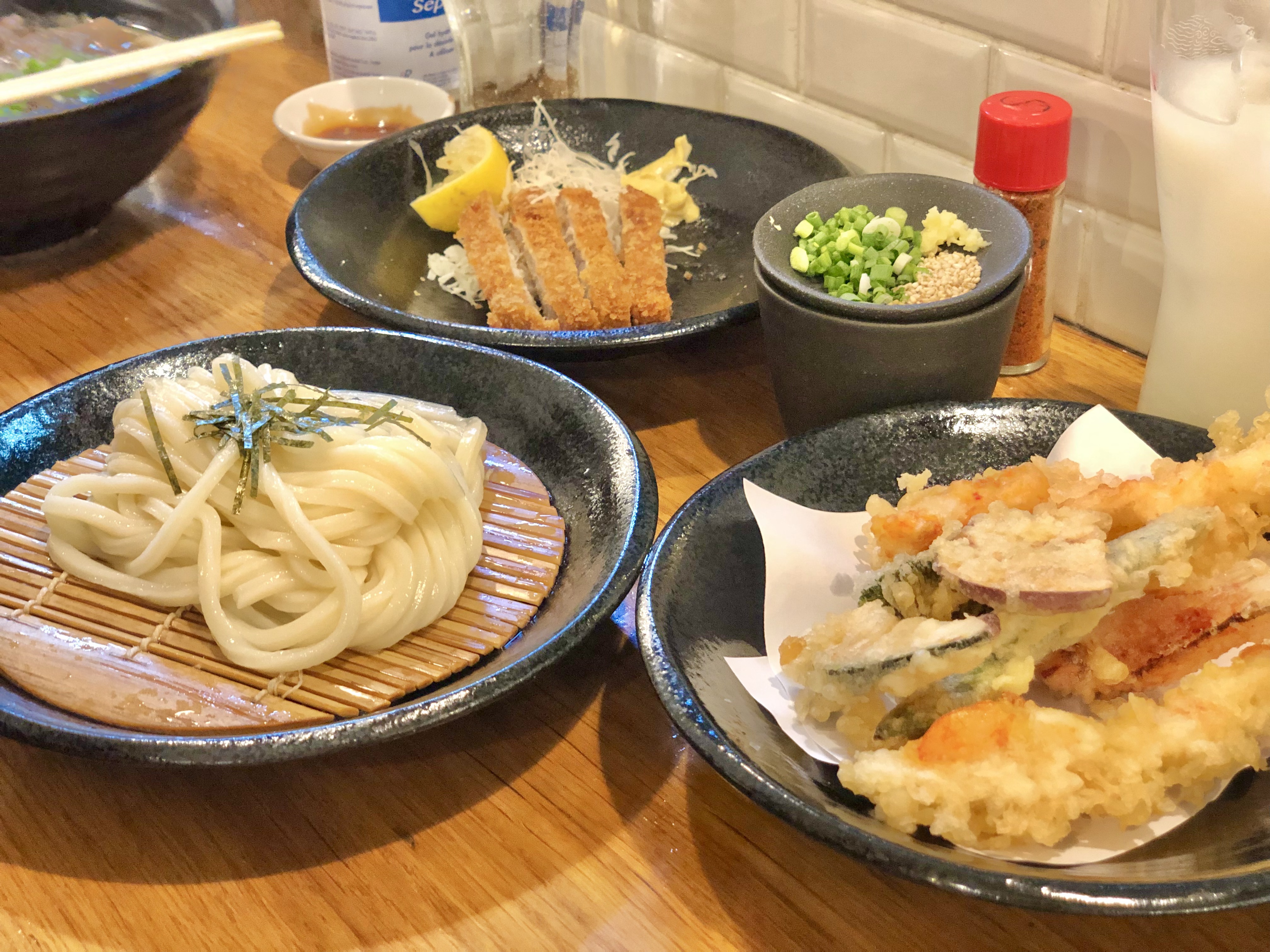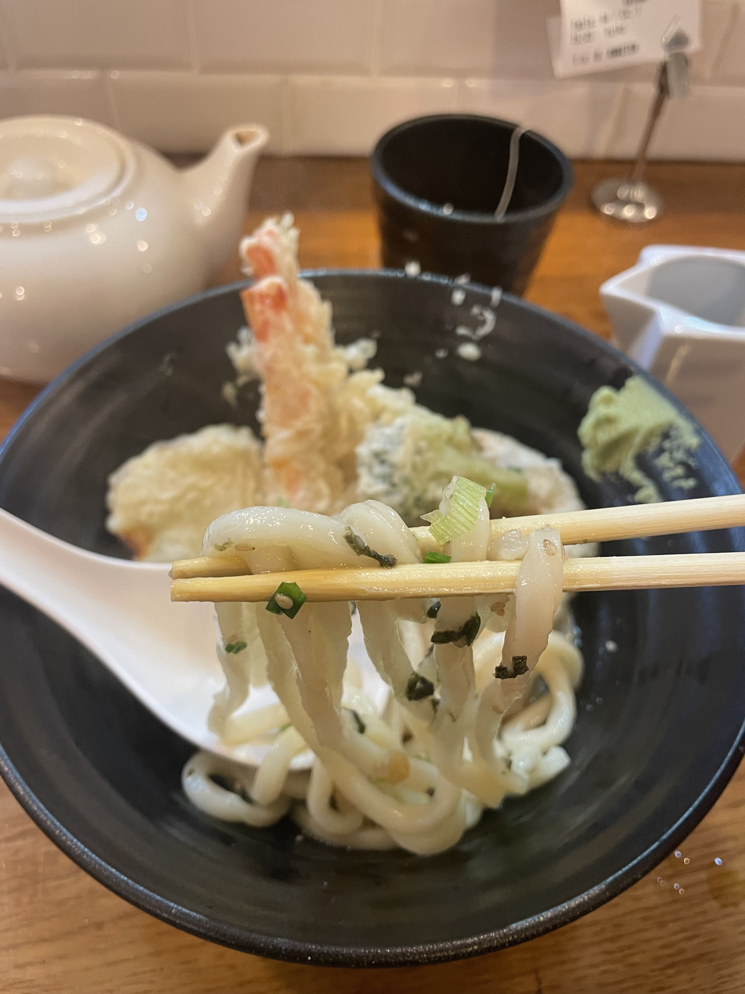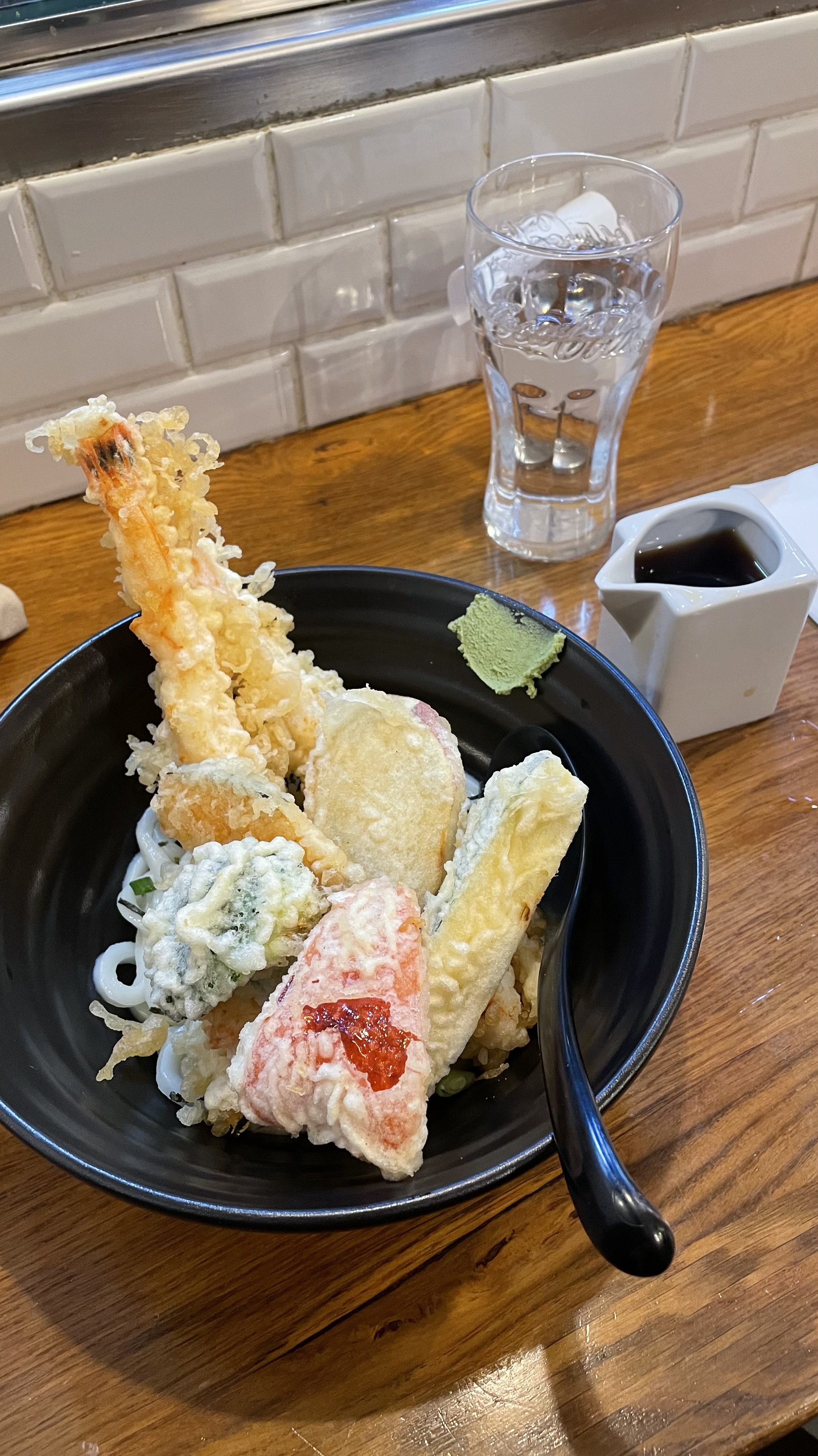 Super bon restaurant de nouilles japonaises. Nous nous sommes assis au bar, le chef a fait frire devant nous les tempura de crevettes. J'ai pris un udon épicé au bœuf et au curry. Lors de ma deuxième visite, le H-3 Buta Shadu Udon est une petite portion. J'aurais dû lire attentivement le Hiyashi Udon est froid. Petit bémol : c'est populaire, il y a du monde même en semaine de travail après 13h30. Les gens font la queue dehors. Soyez prêt à attendre.