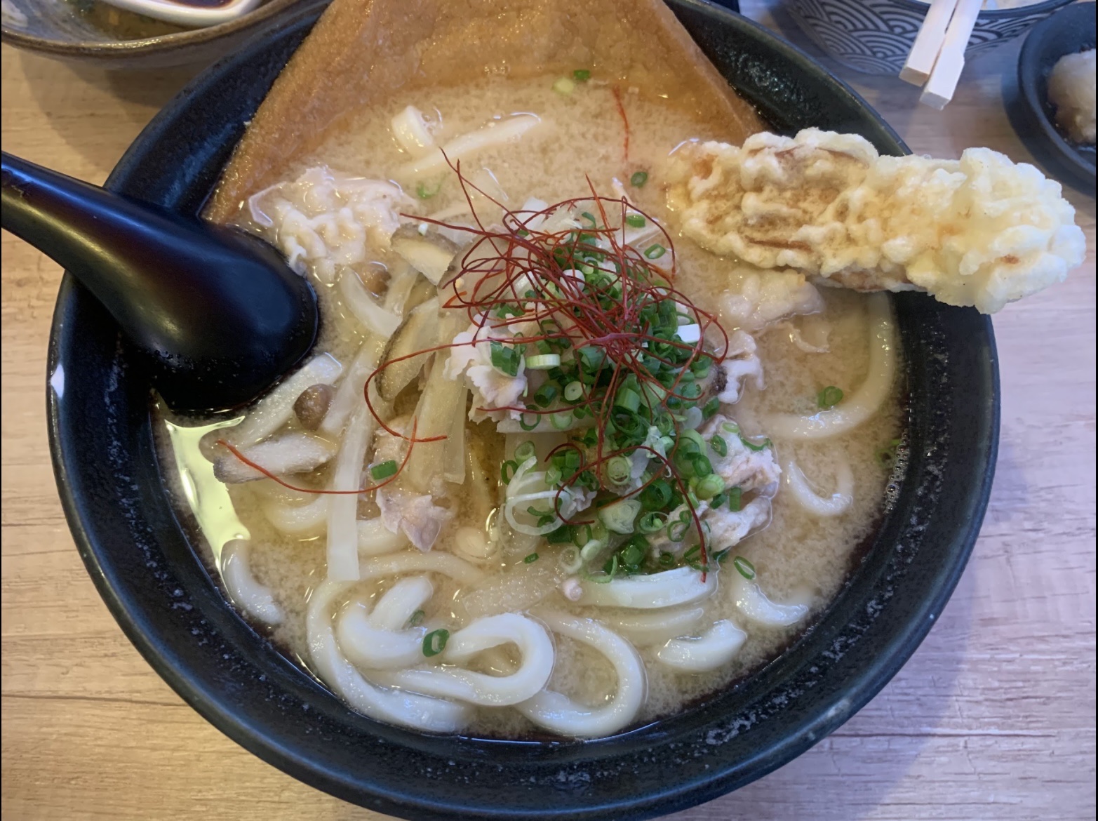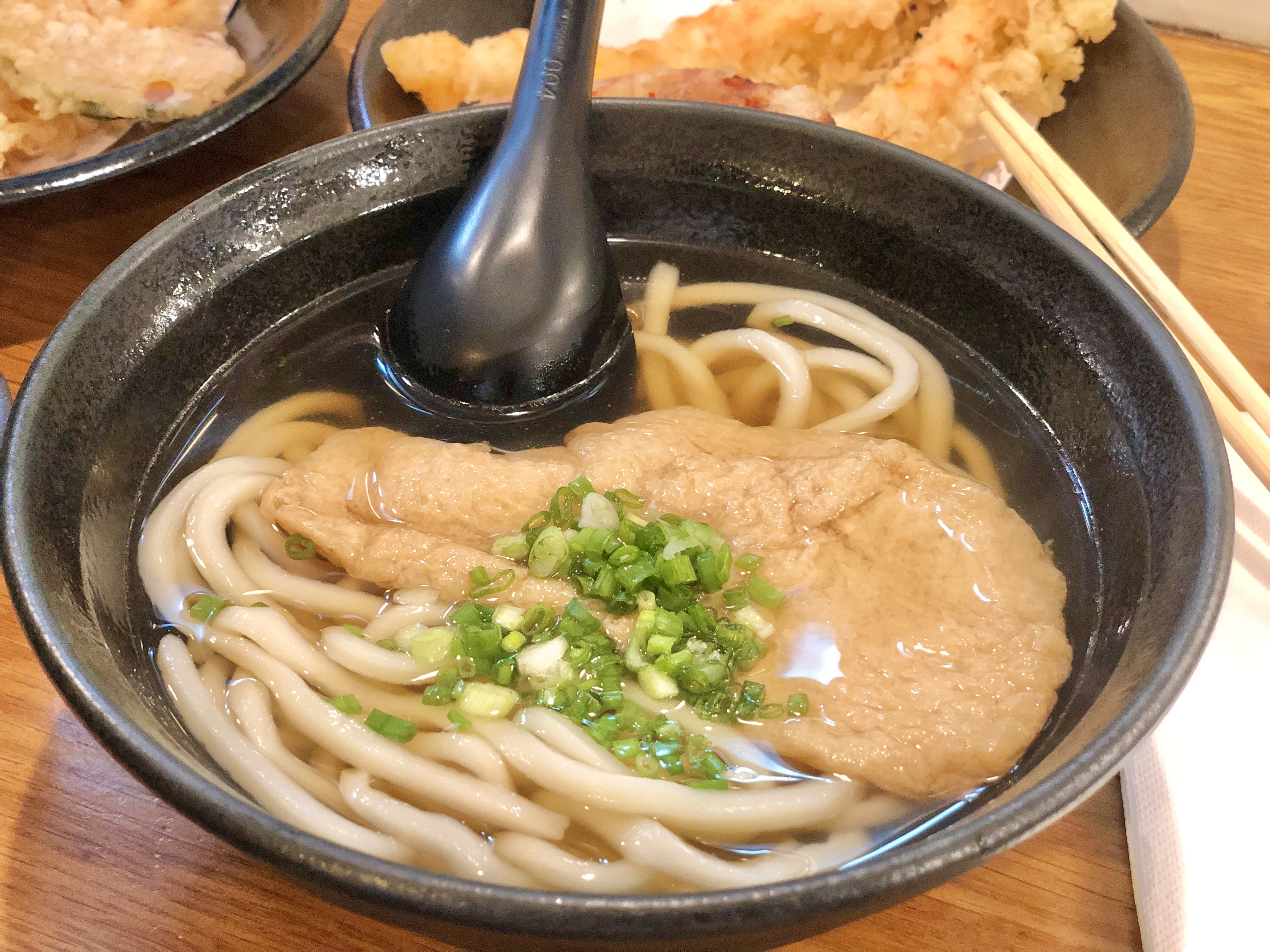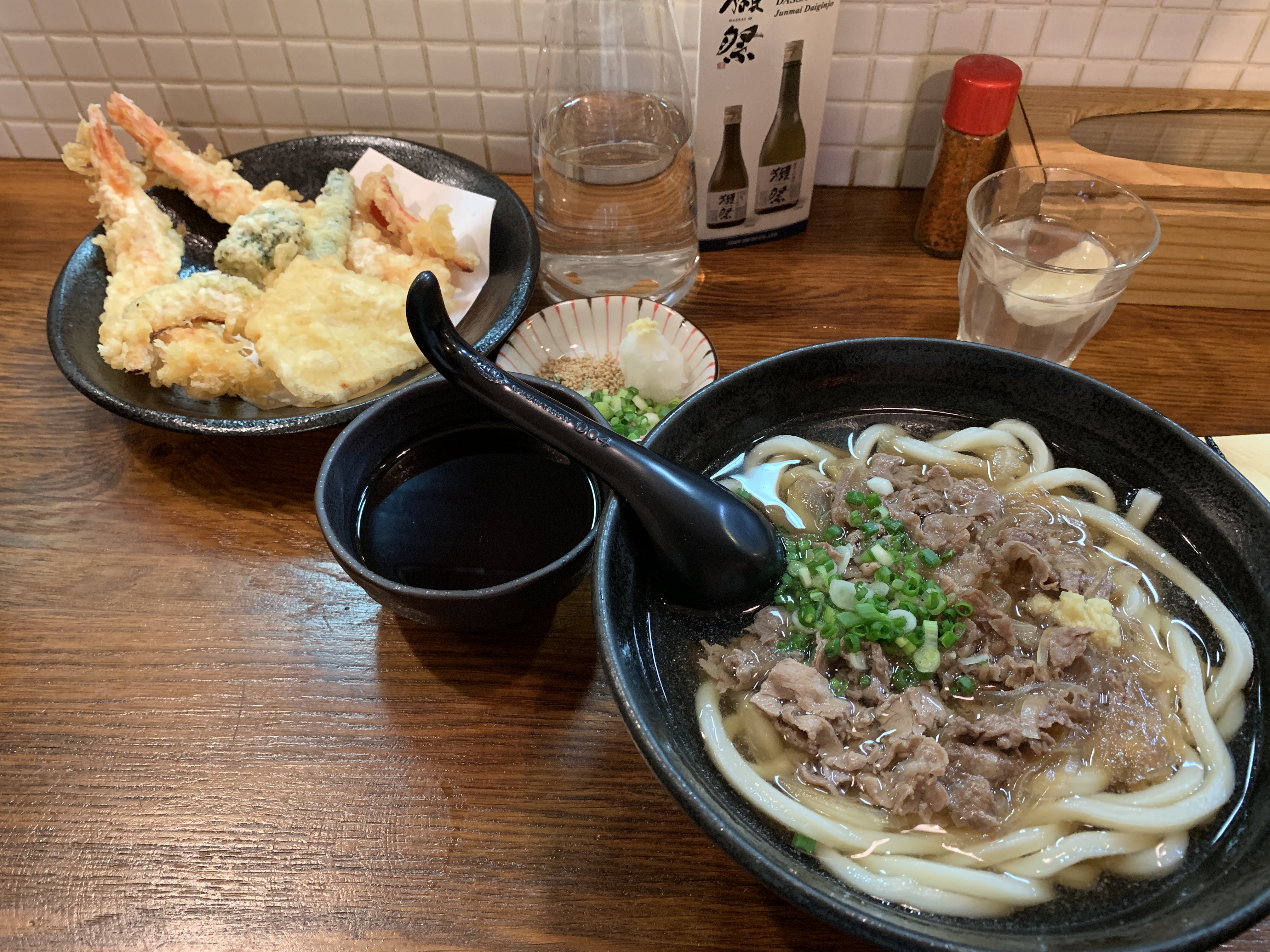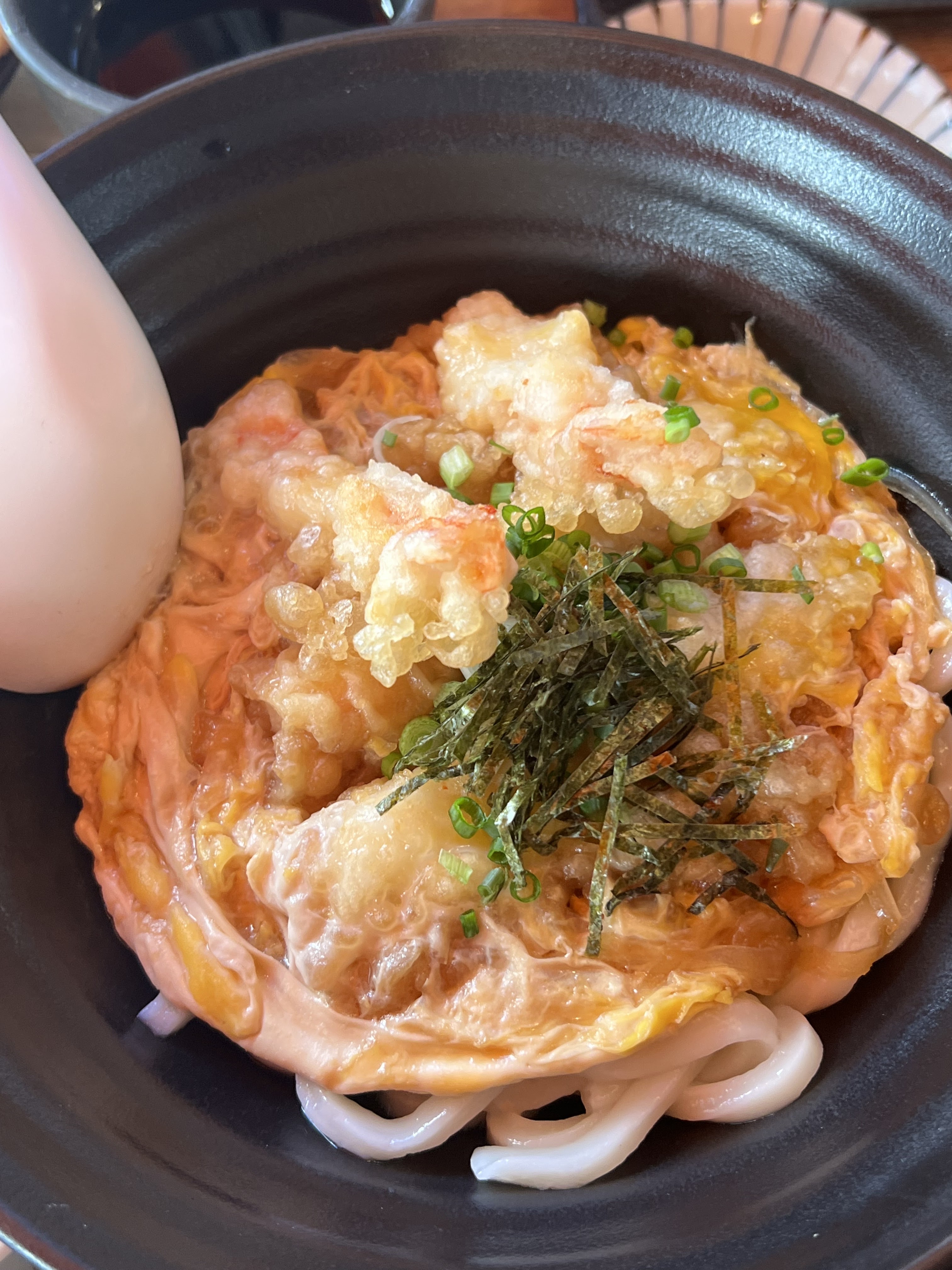 Super bon restaurant de nouilles japonaises. Nous nous sommes assis au bar, le chef a fait frire devant nous les tempura de crevettes. J'ai pris un udon épicé au bœuf et au curry. Lors de ma deuxième visite, le H-3 Buta Shadu Udon est une petite portion. J'aurais dû lire attentivement le Hiyashi Udon est froid. Petit bémol : c'est populaire, il y a du monde même en semaine de travail après 13h30. Les gens font la queue dehors. Soyez prêt à attendre.