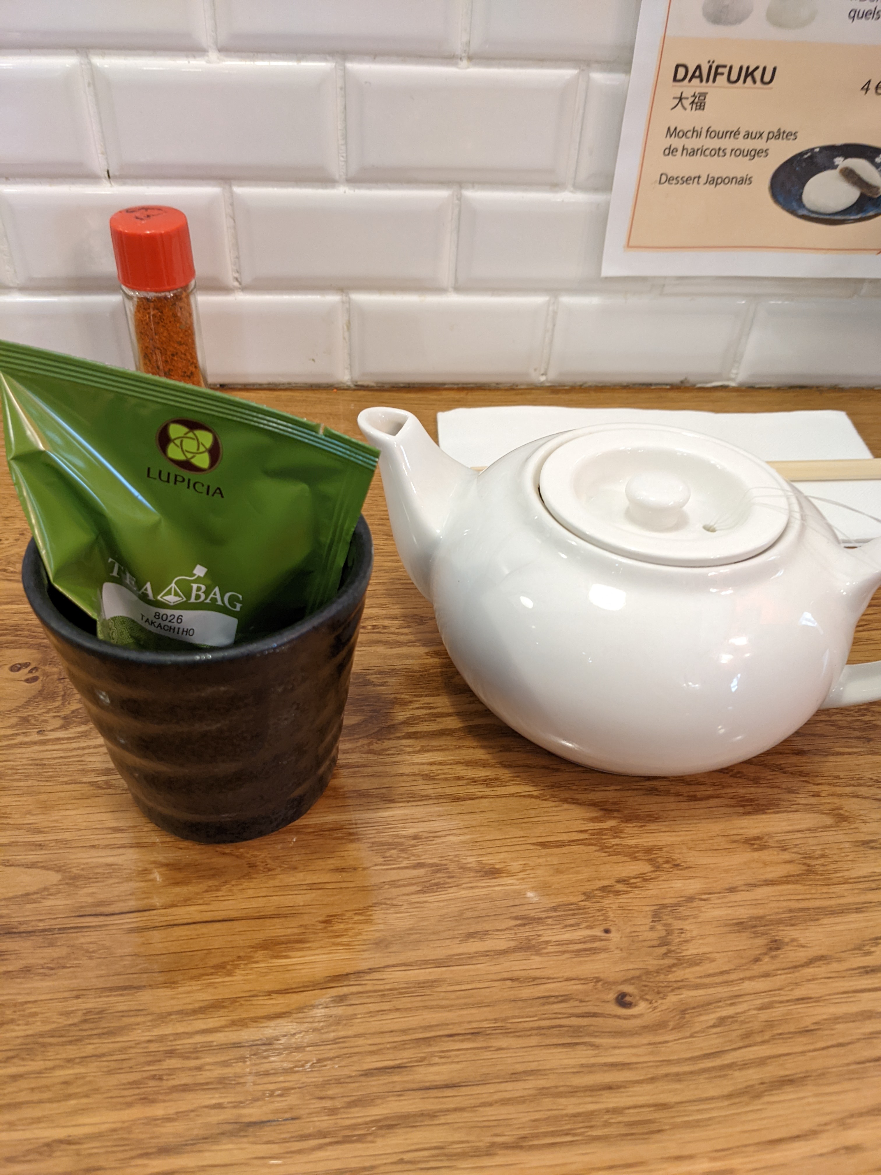L'espacement des tables est serré et assez serré, mais la nourriture se déplace bien ! (Pas le japonais que vous auriez, mais je suis à Paris, donc rien à redire) Il est difficile de trouver de la soupe chaude à Paris, donc cela satisfait définitivement mon envie asiatique ! Je suis un grand fan de natto, mais je pense que ceux en magasin sont beaucoup plus durs. :/