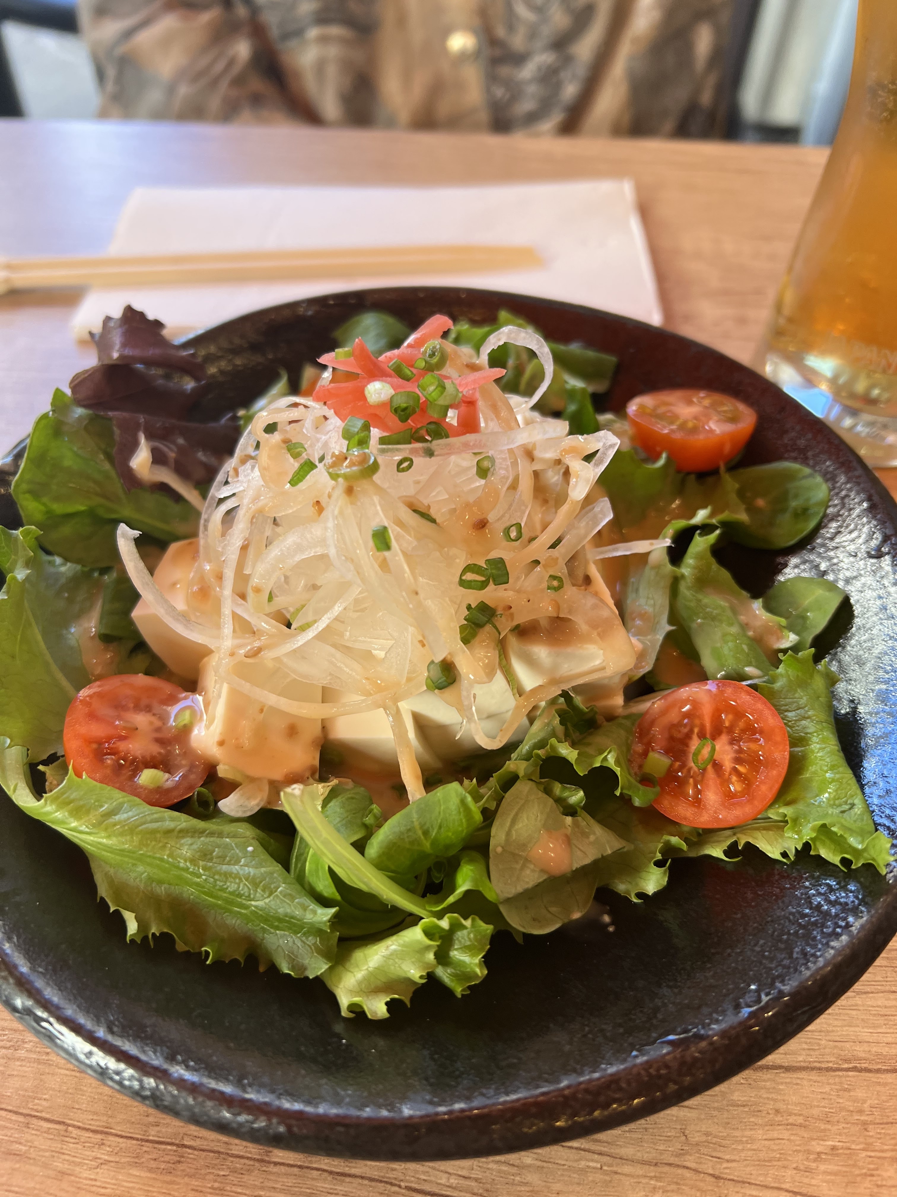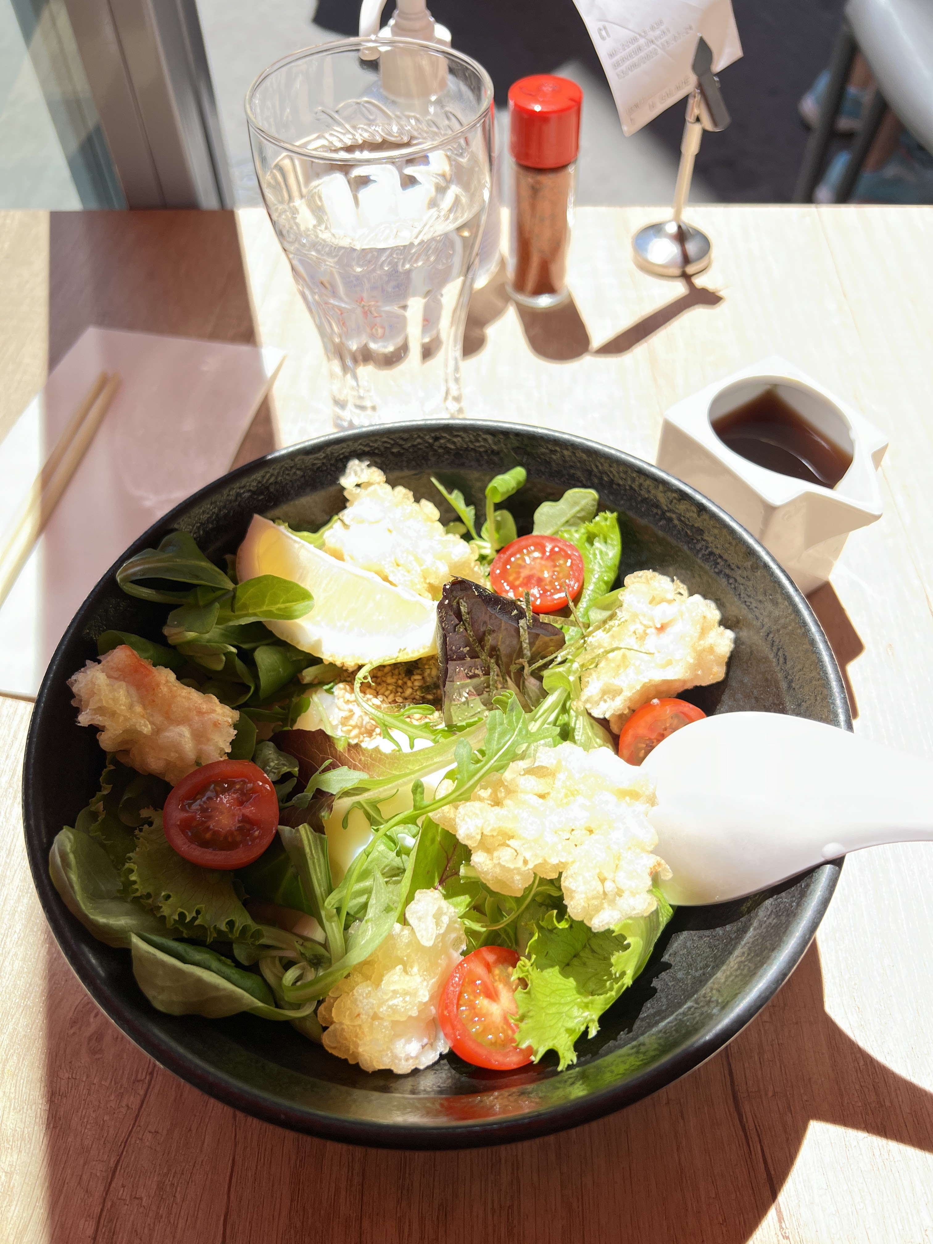 Le restaurant est petit et très fréquenté, il faut y aller tôt pour éviter la file d'attente, les jours d'été il fait extrêmement chaud dehors, vous pouvez vous asseoir tôt si cela ne vous dérange pas de vous asseoir au soleil. L'udon est extrêmement délicieux, a une texture parfaite, si vous ne voulez pas avoir un bol de soupe udon bien chaud, cette salade udon (16 €) est accompagnée de crevettes tempura légères et croustillantes, d'un œuf poché, de légumes verts frais et de la vinaigrette froide. /soupe, c'est très rafraîchissant et parfait pour l'été. je