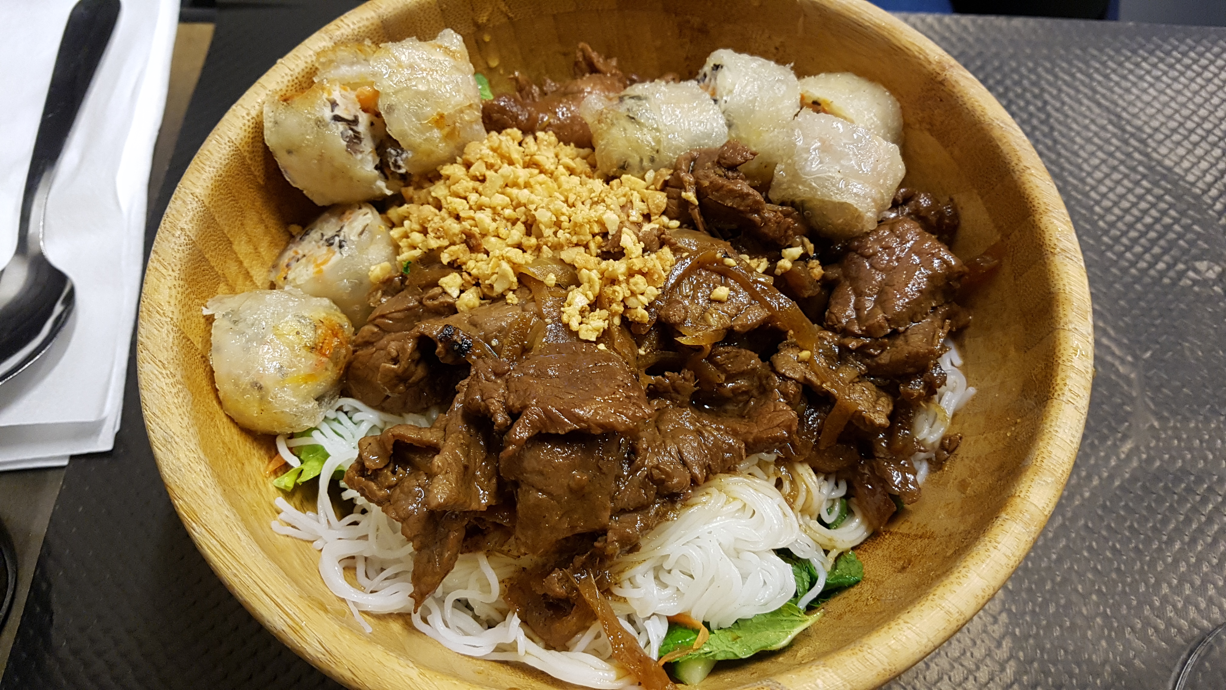 J'ai pris un bo bun pas mal un peut trop salé et y'a un goût de poivre noir ou autre ! Vermicelles un peut épaisse !
