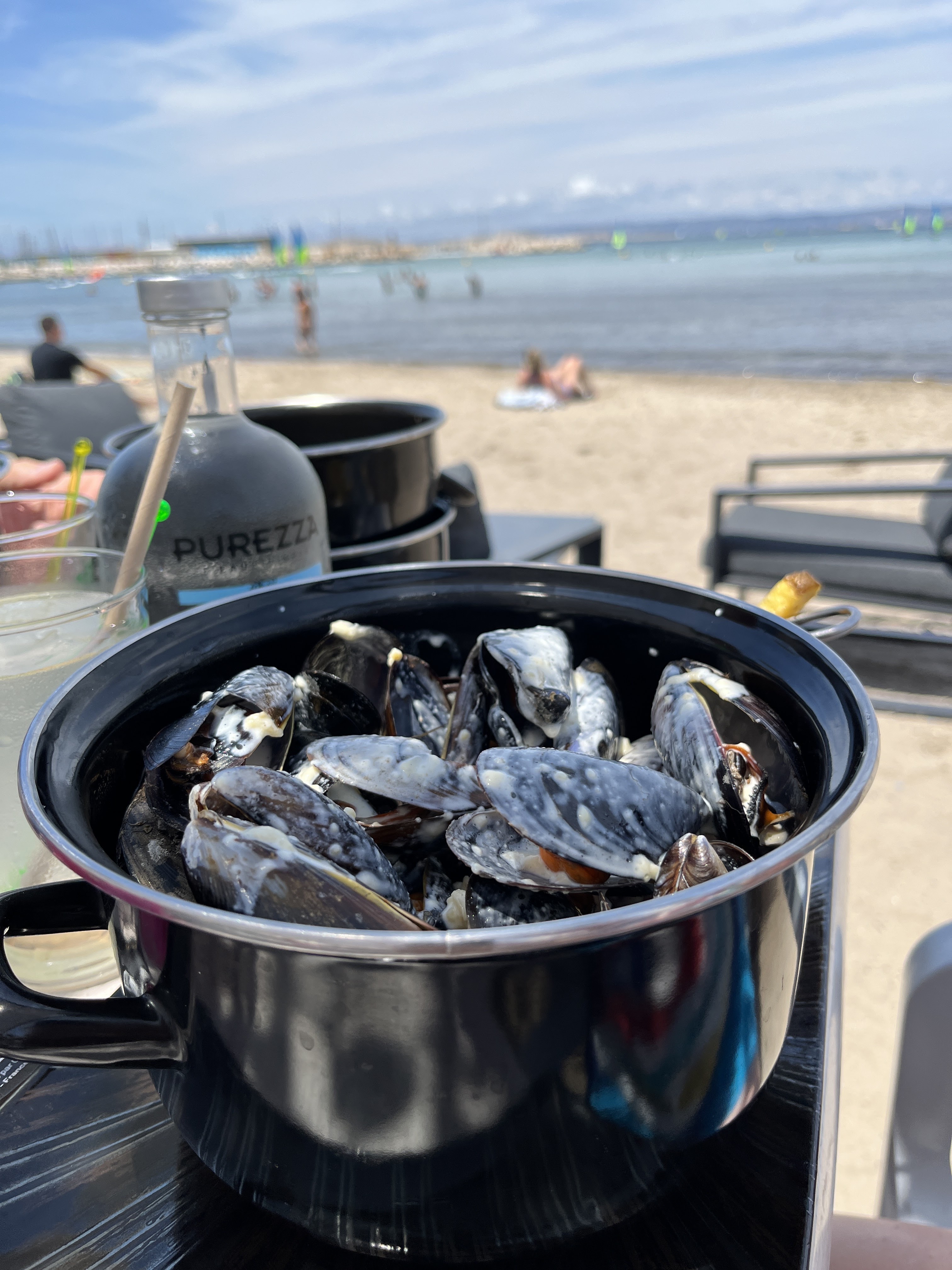 Des moules comme en France : Commandez des Moules au Roquefort avec des frites découpées à la main. Plus de la limonade aux pêches 🥤 et assis au premier rang sur la plage. Merveilleux!